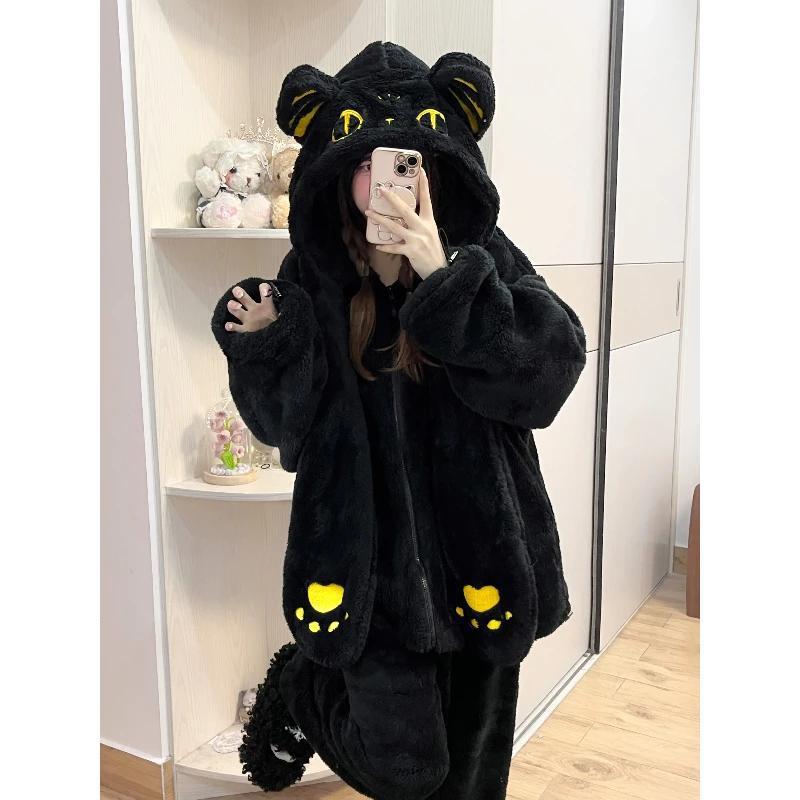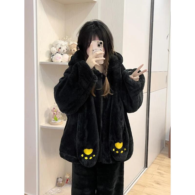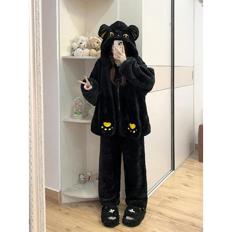 Pijama de Forro Polar Coral con Capucha de Gato Lindo para Mujer Invierno Nuevo Cálido Grueso Ropa para el Hogar Talla Extra Conjunto Se Puede Usar Afuera