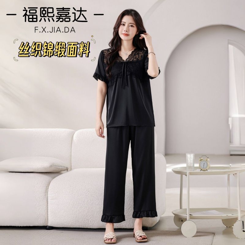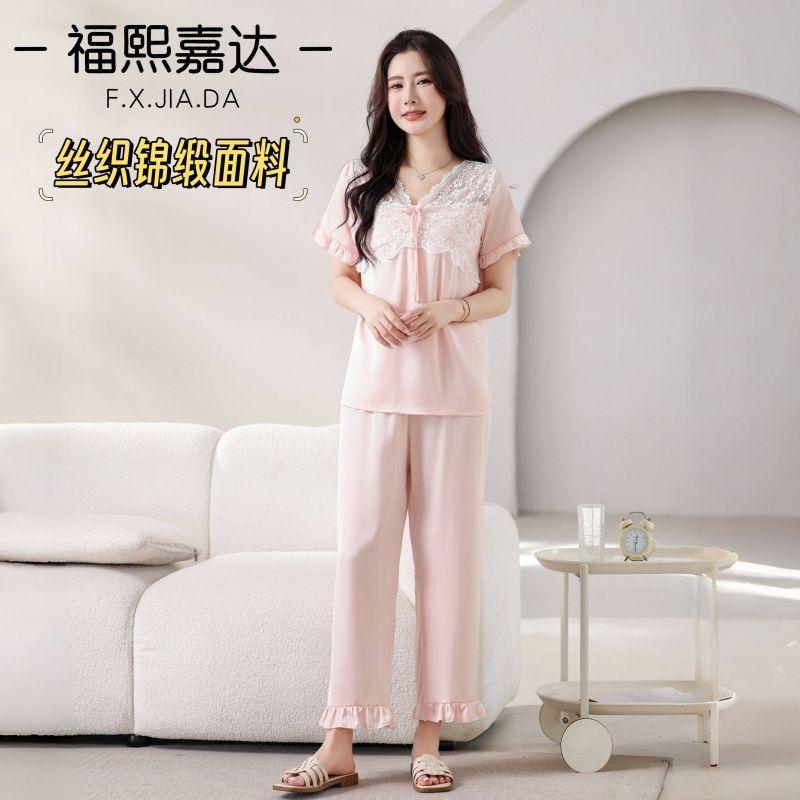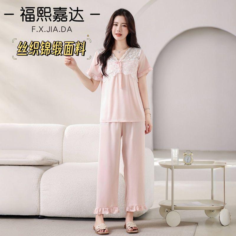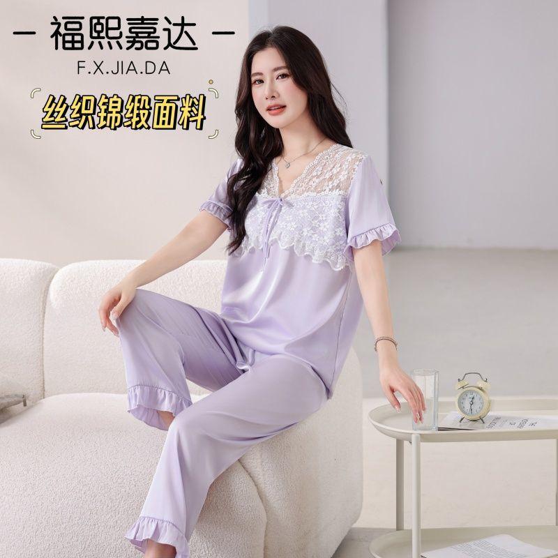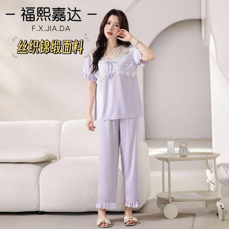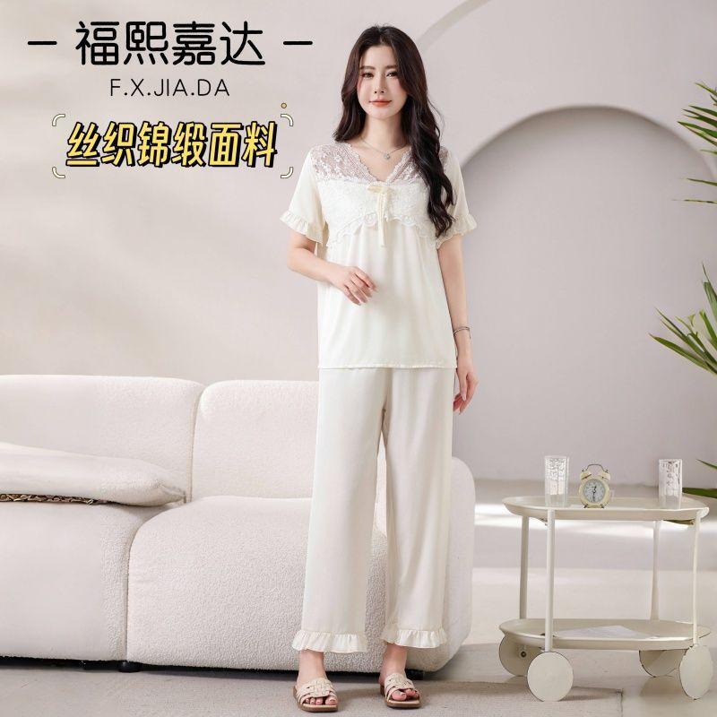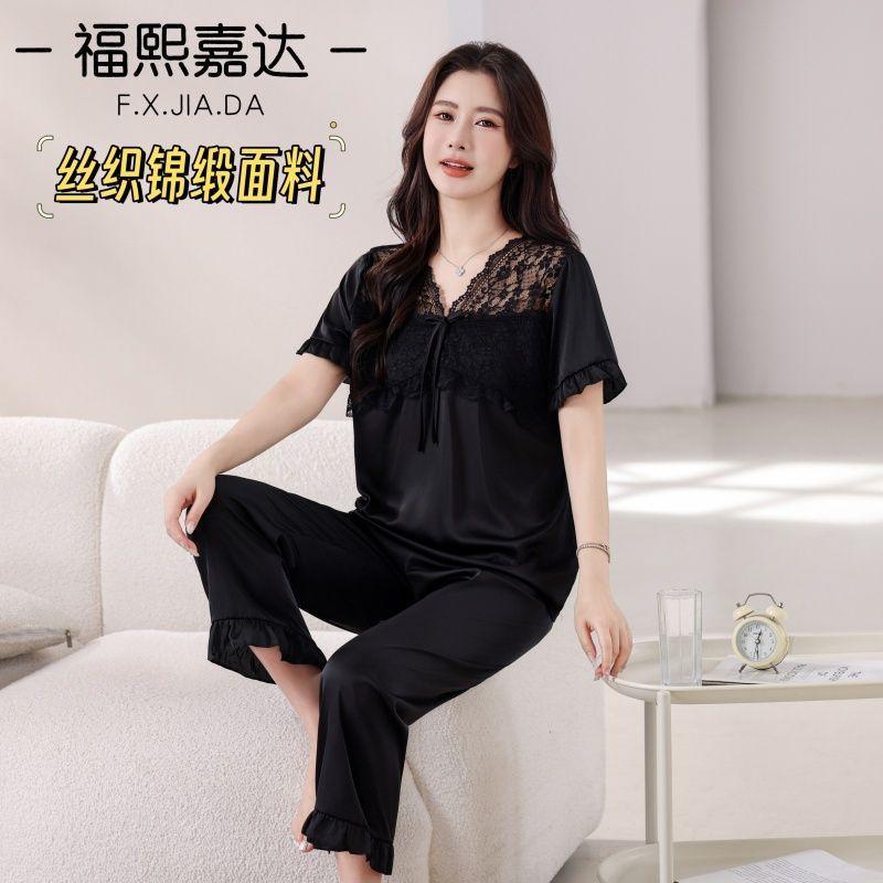 Fuxi Jiada Temperamento de Lujo Ligero Encaje Francés Seda de Hielo Pijama para Mujer Verano Manga Corta Pantalón Largo Talla Extra Ropa de Casa