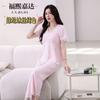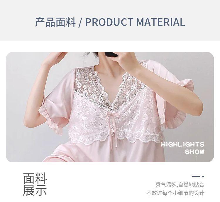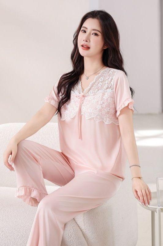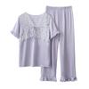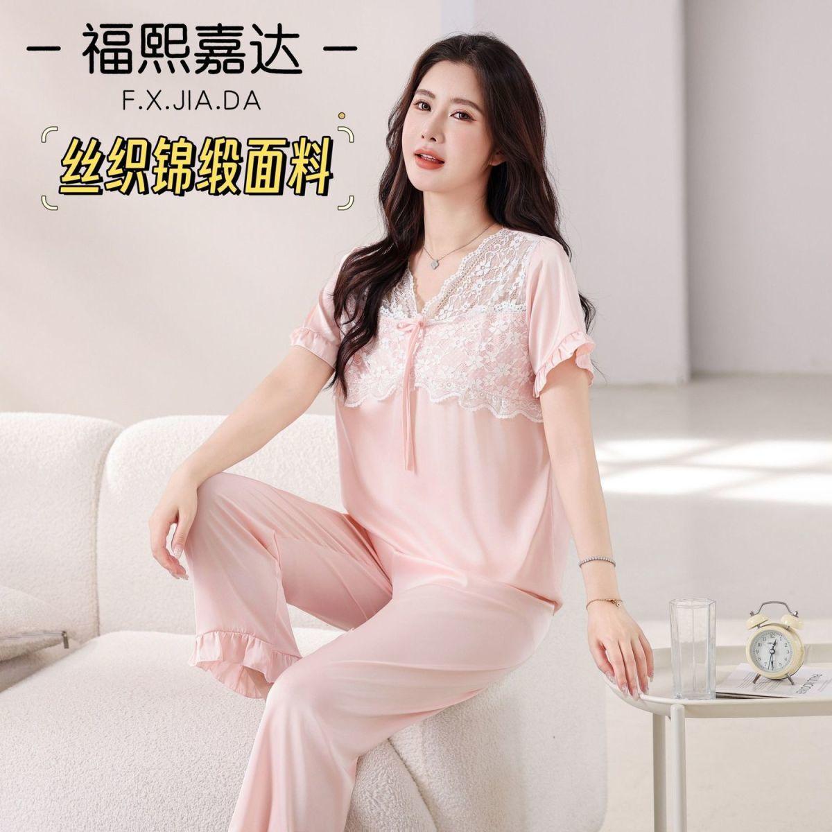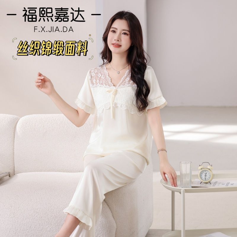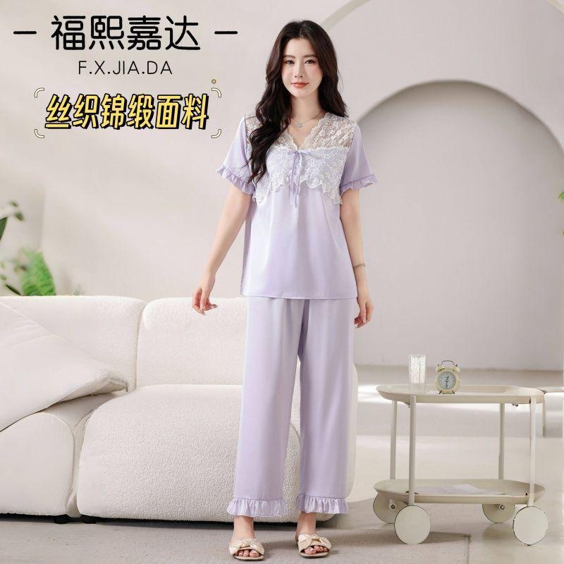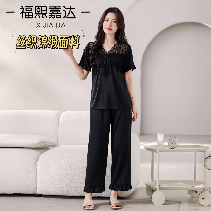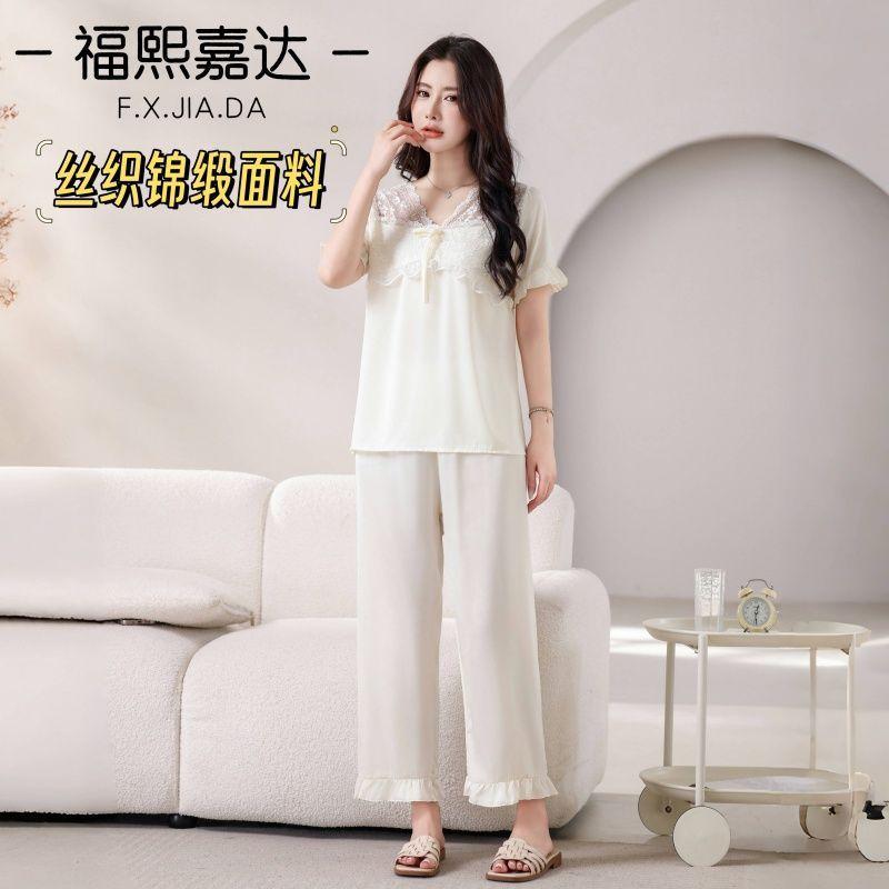 Fuxi Jiada Temperamento de Lujo Ligero Encaje Francés Seda de Hielo Pijama para Mujer Verano Manga Corta Pantalón Largo Talla Extra Ropa de Casa