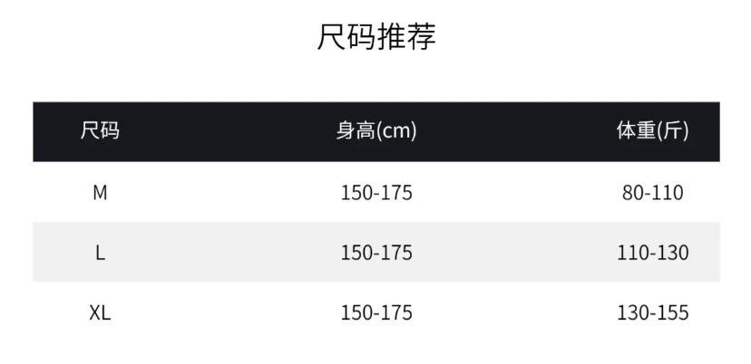 M Recommended 110 below, L Recommendations 110-130, XL Recommendations 130-150