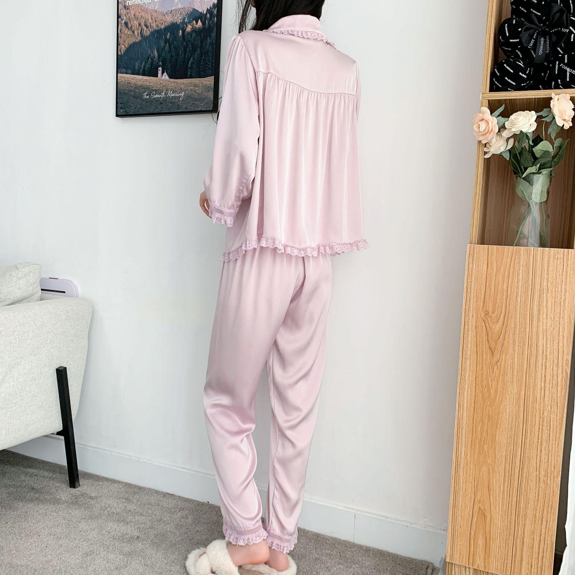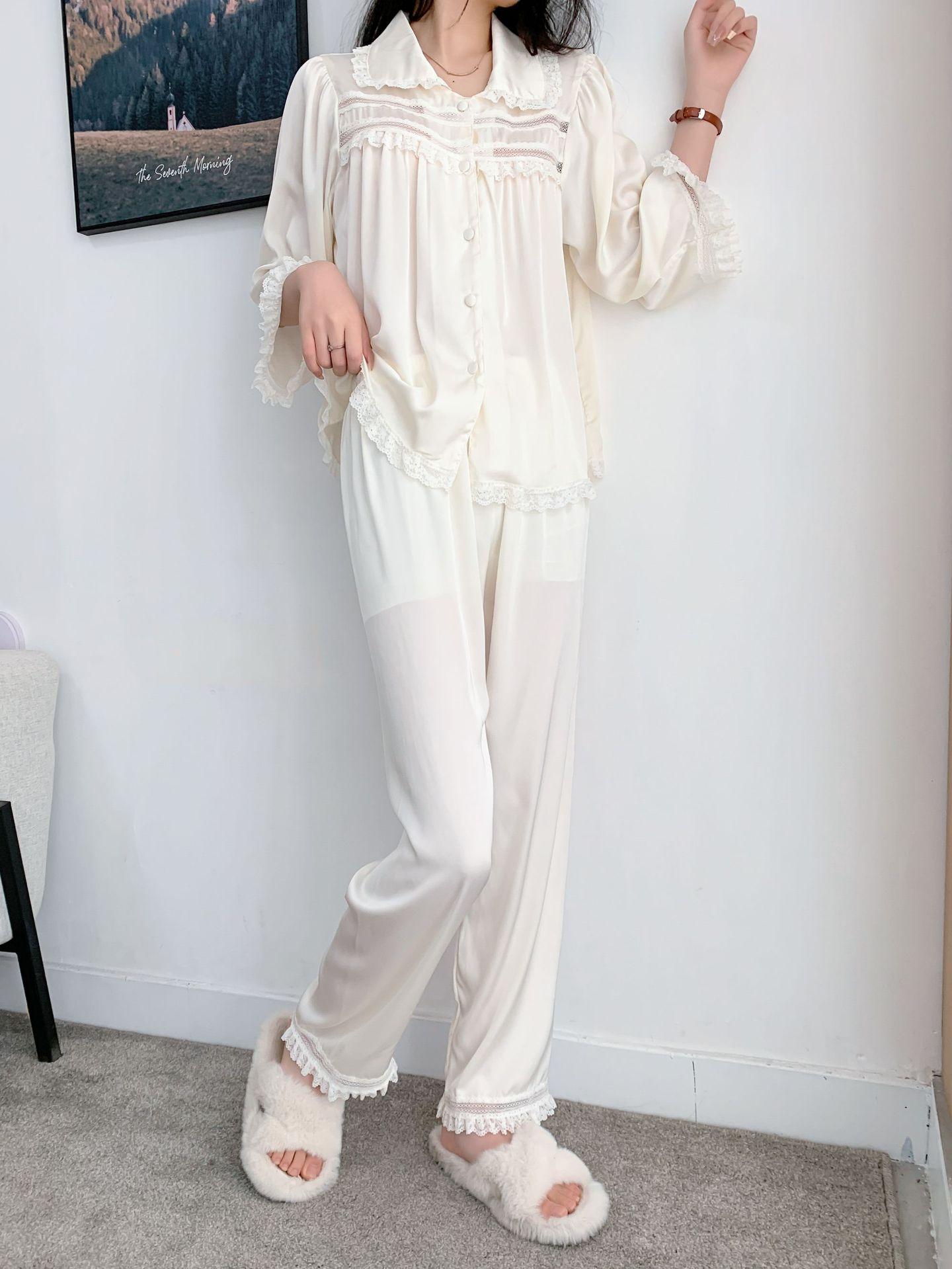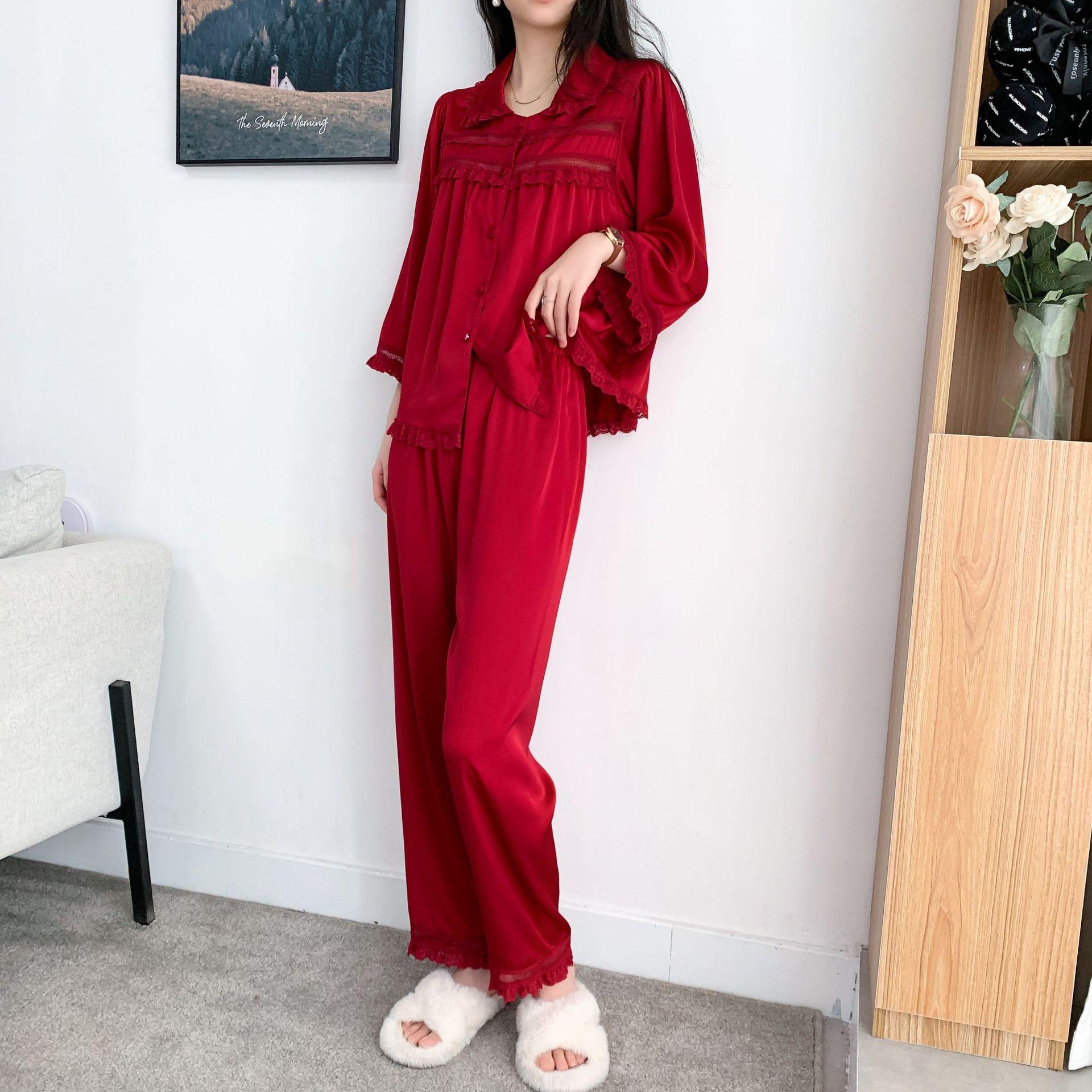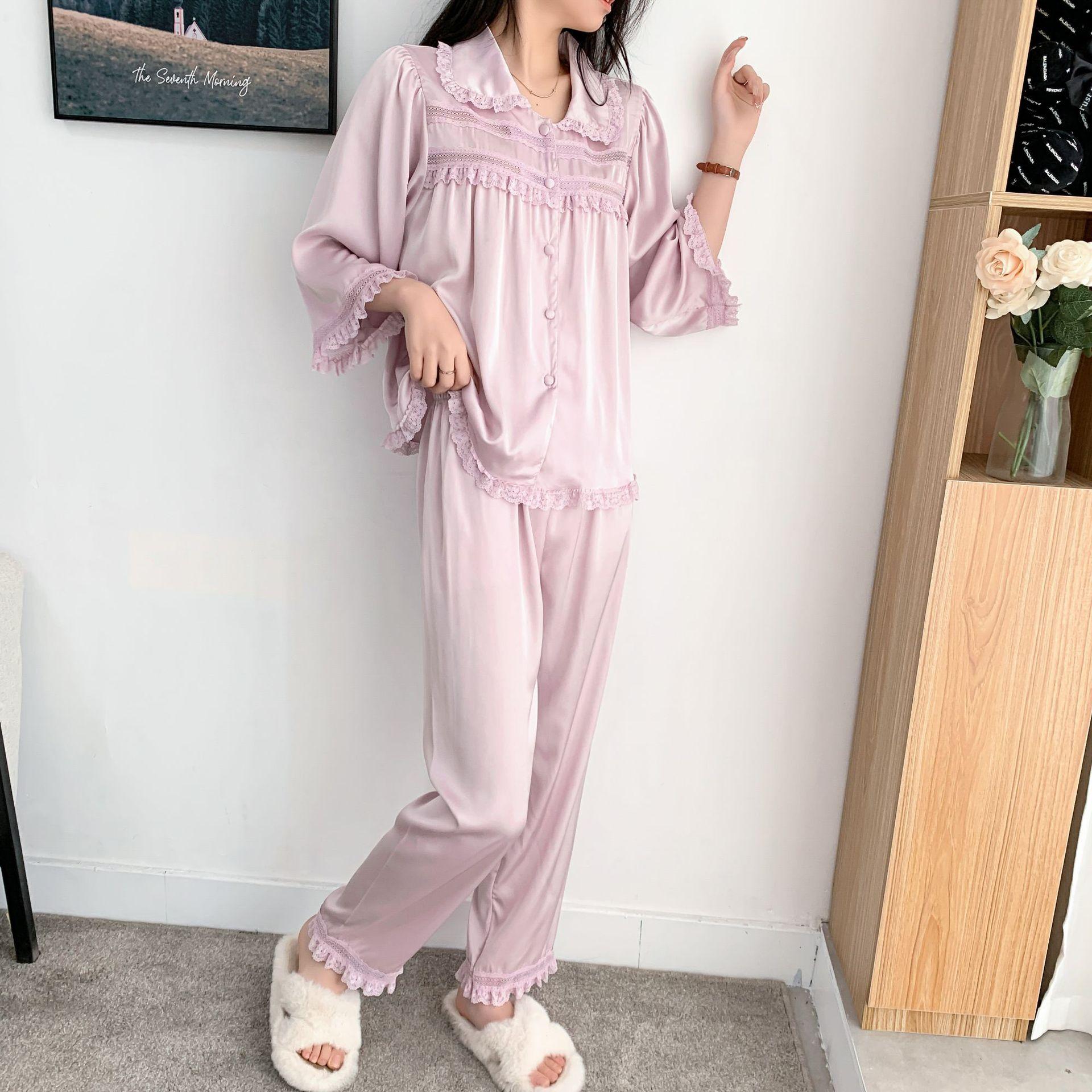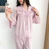 2025 Nuevo Pijama de Satén Estilo Corte Francés Seda Hielo para Mujer Primavera Verano Fino Manga Larga Pantalón Largo Set para Estar en Casa