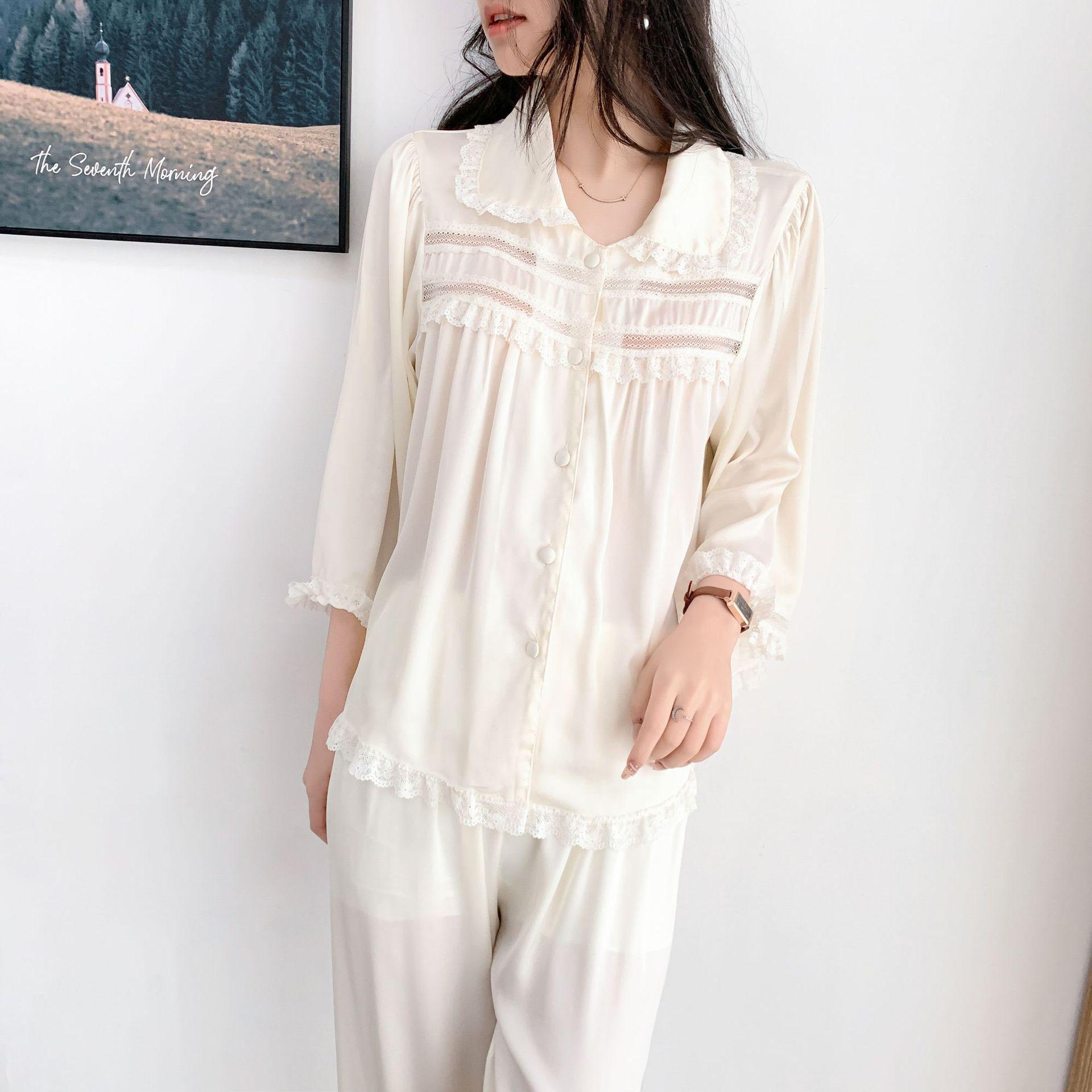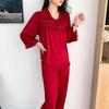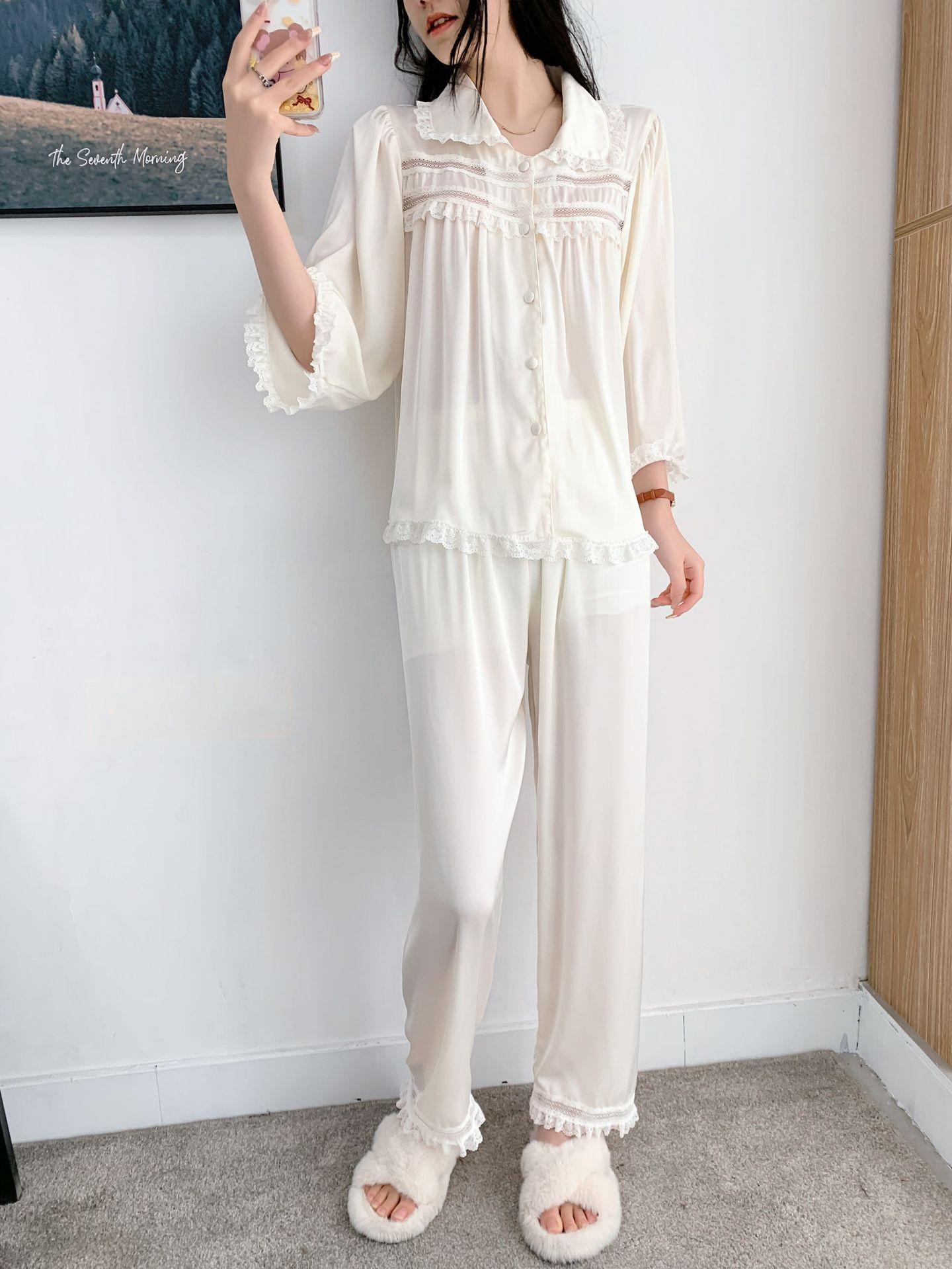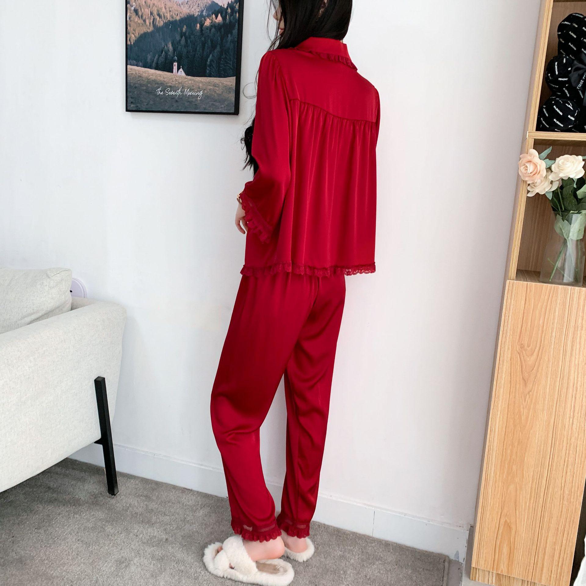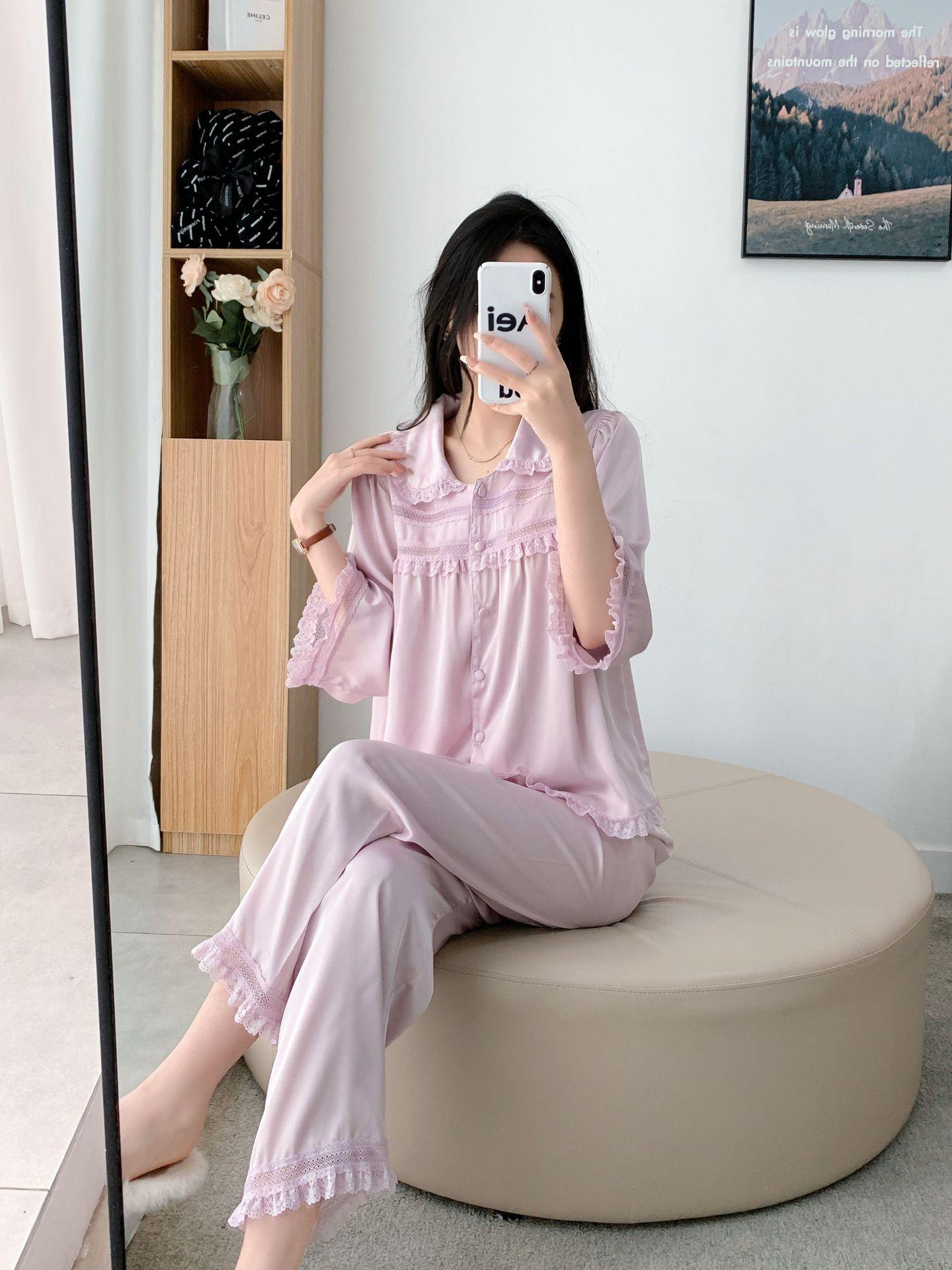2025 Nuevo Pijama de Satén Estilo Corte Francés Seda Hielo para Mujer Primavera Verano Fino Manga Larga Pantalón Largo Set para Estar en Casa