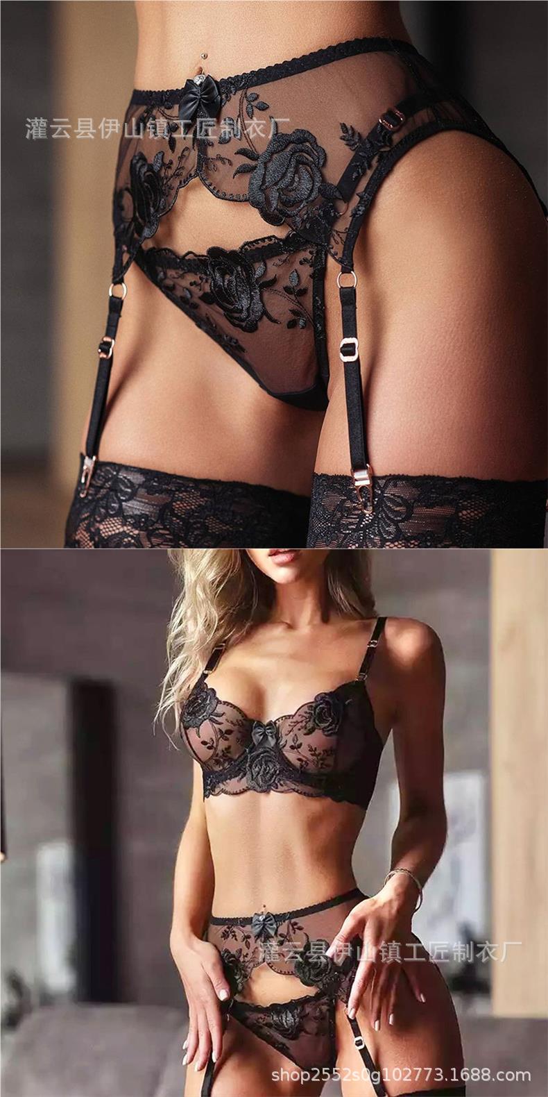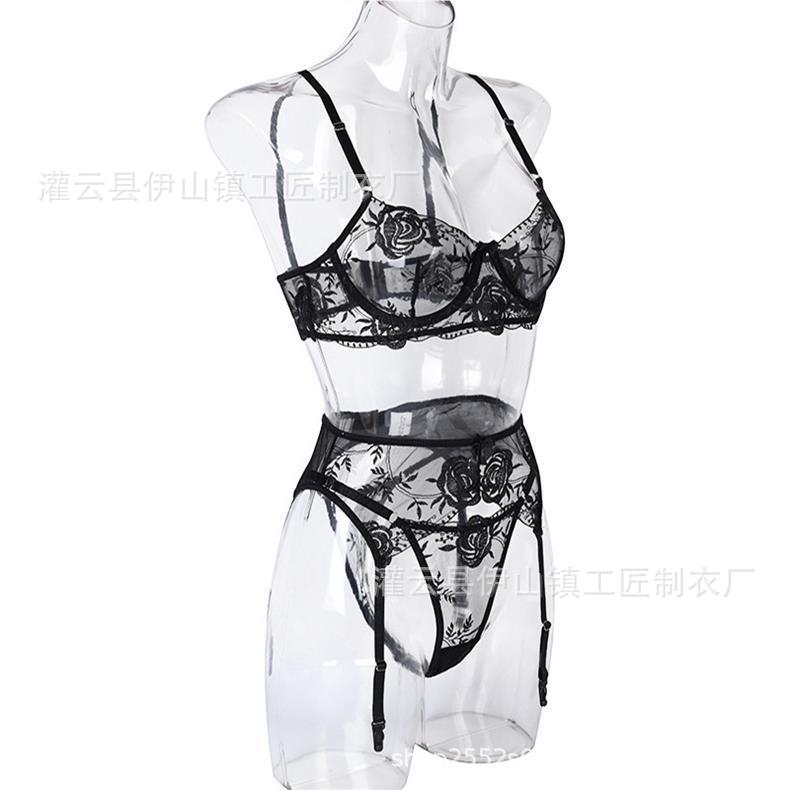 Nuevo estilo transfronterizo europeo y americano comercio exterior sexy encaje transparente encaje bordado conjunto de lencería sexy para mujer