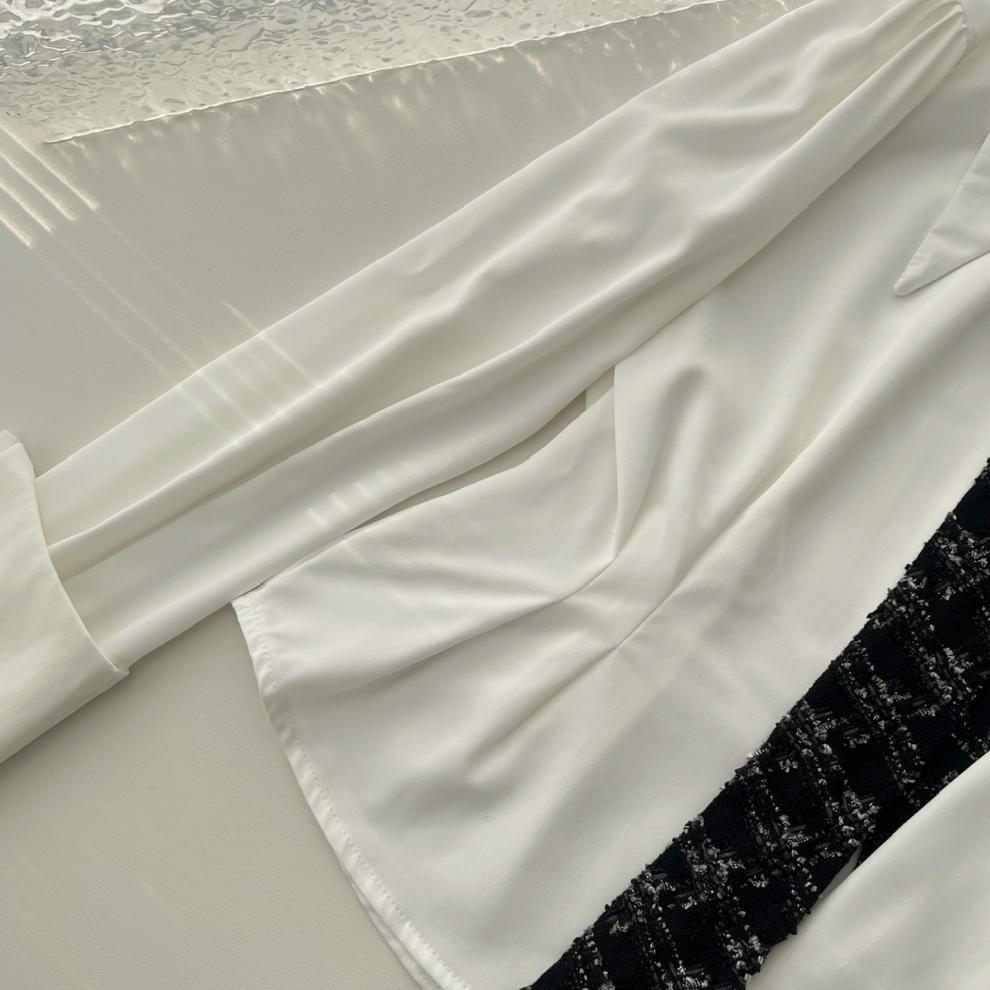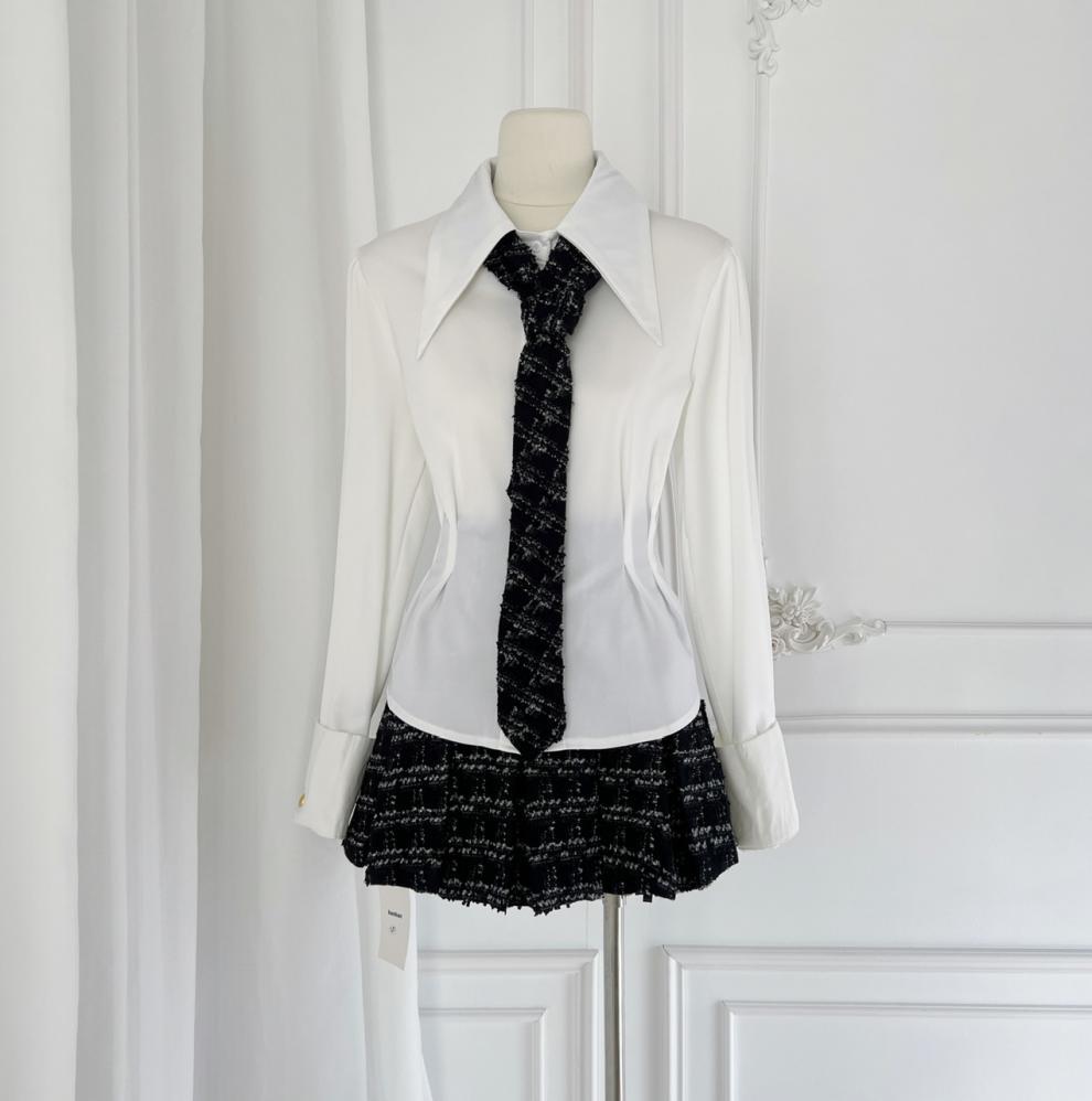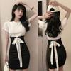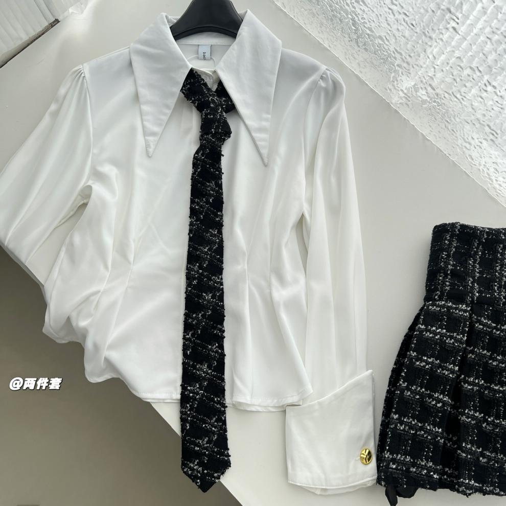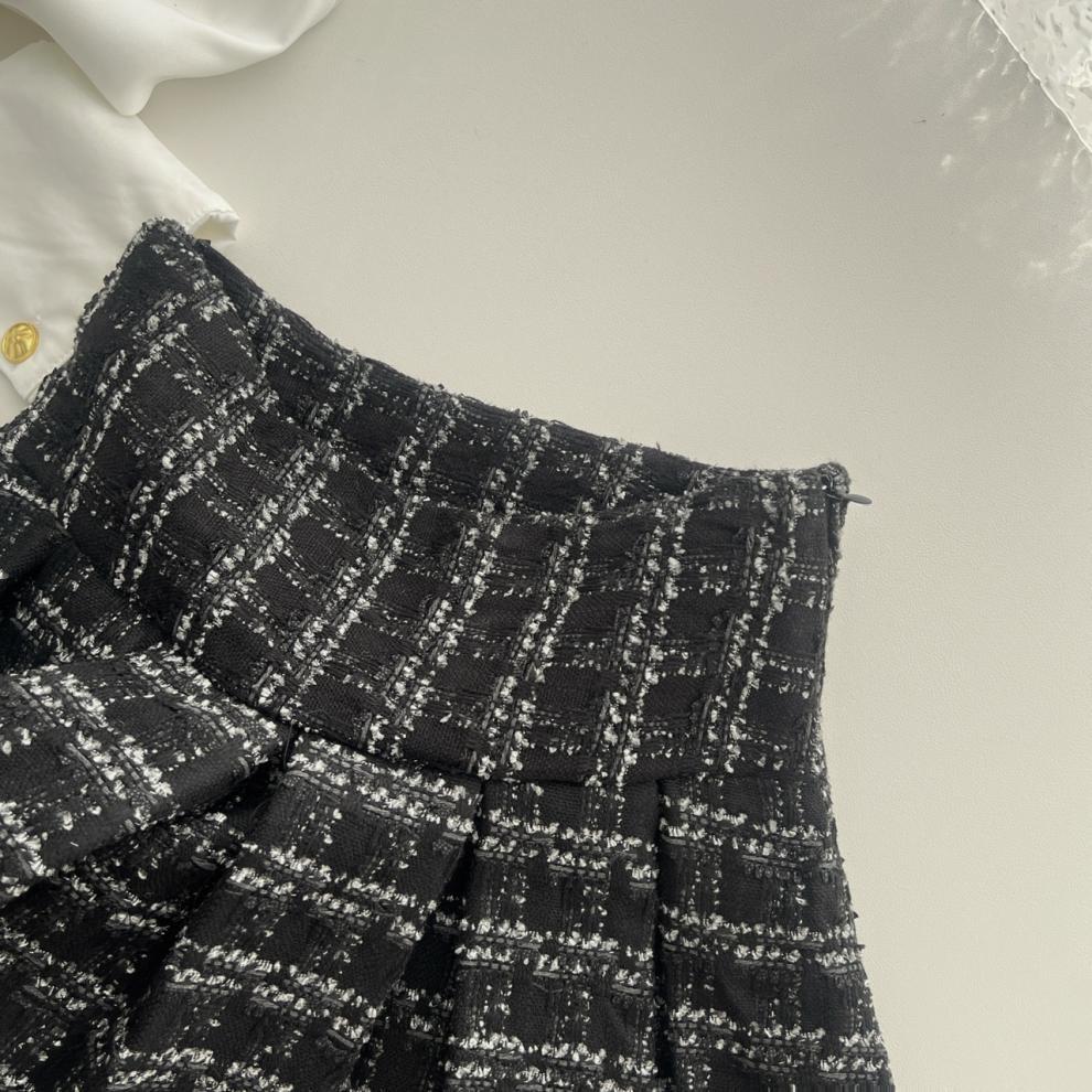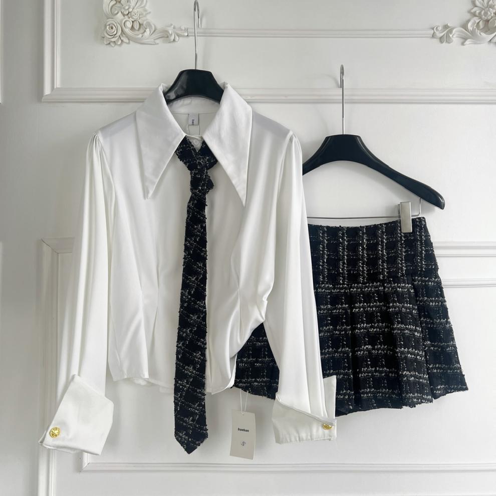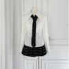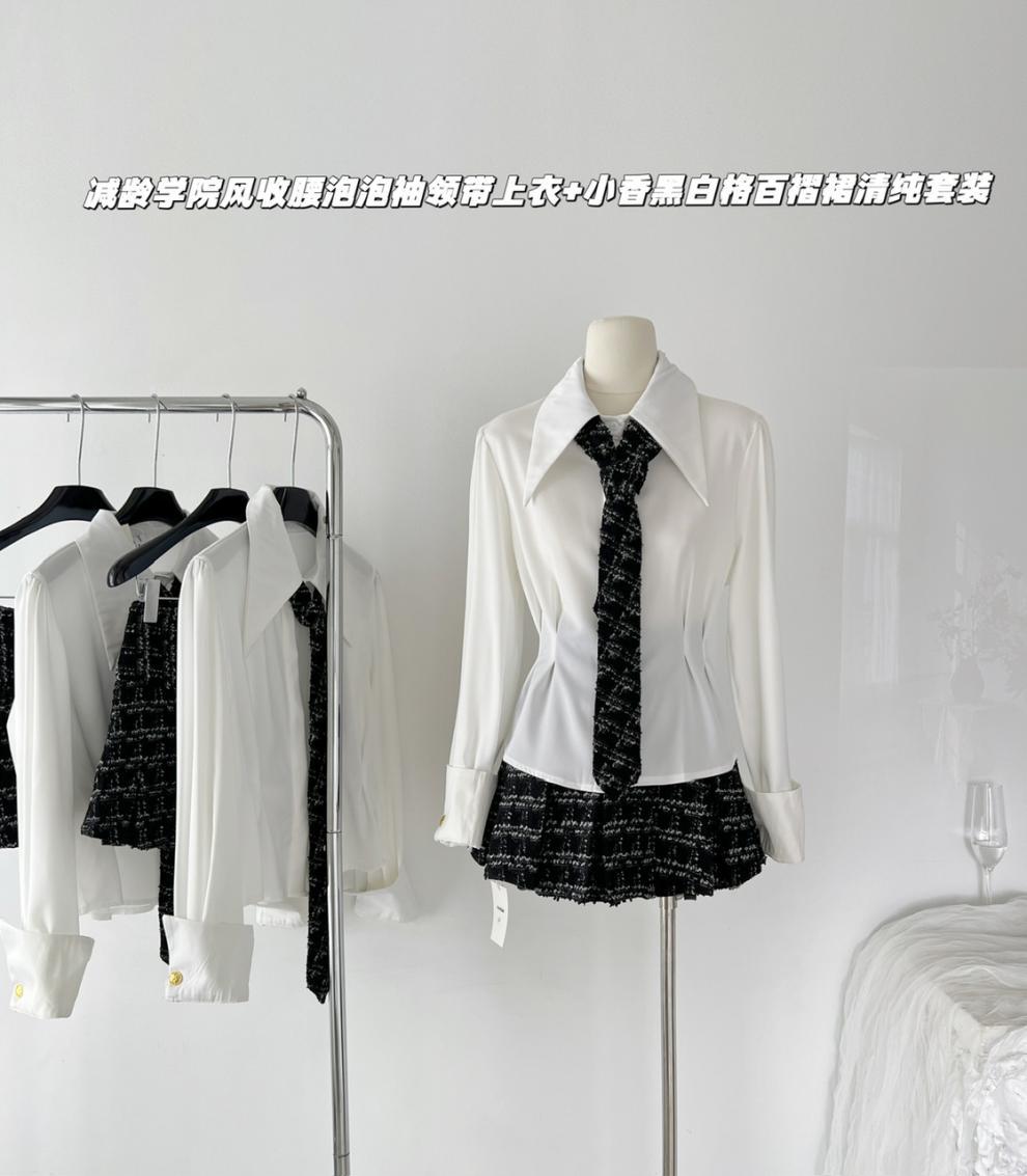 Foto real buena calidad en stock cintura ajustada manga abullonada top con lazo + traje de falda plisada a cuadros blanco y negro de fragancia pequeña