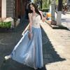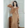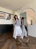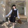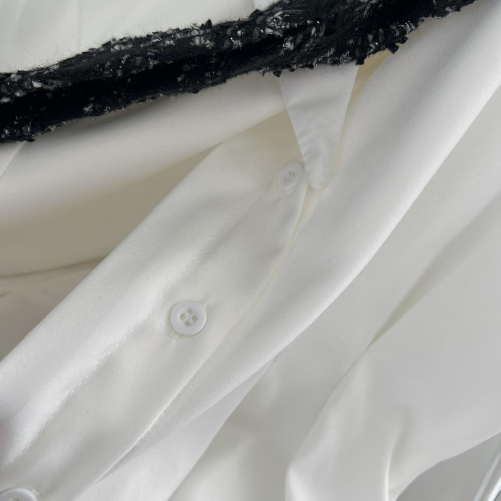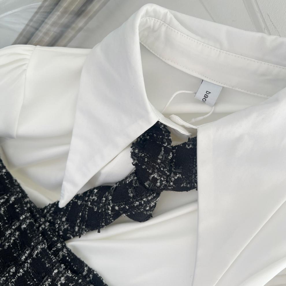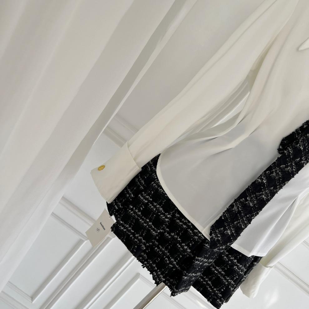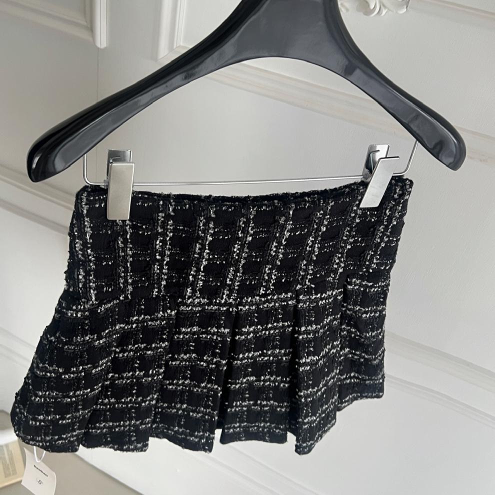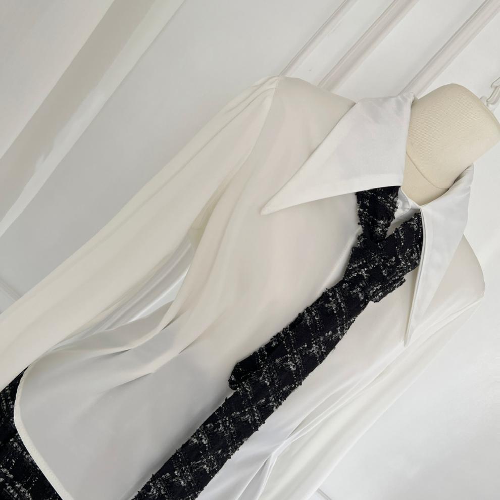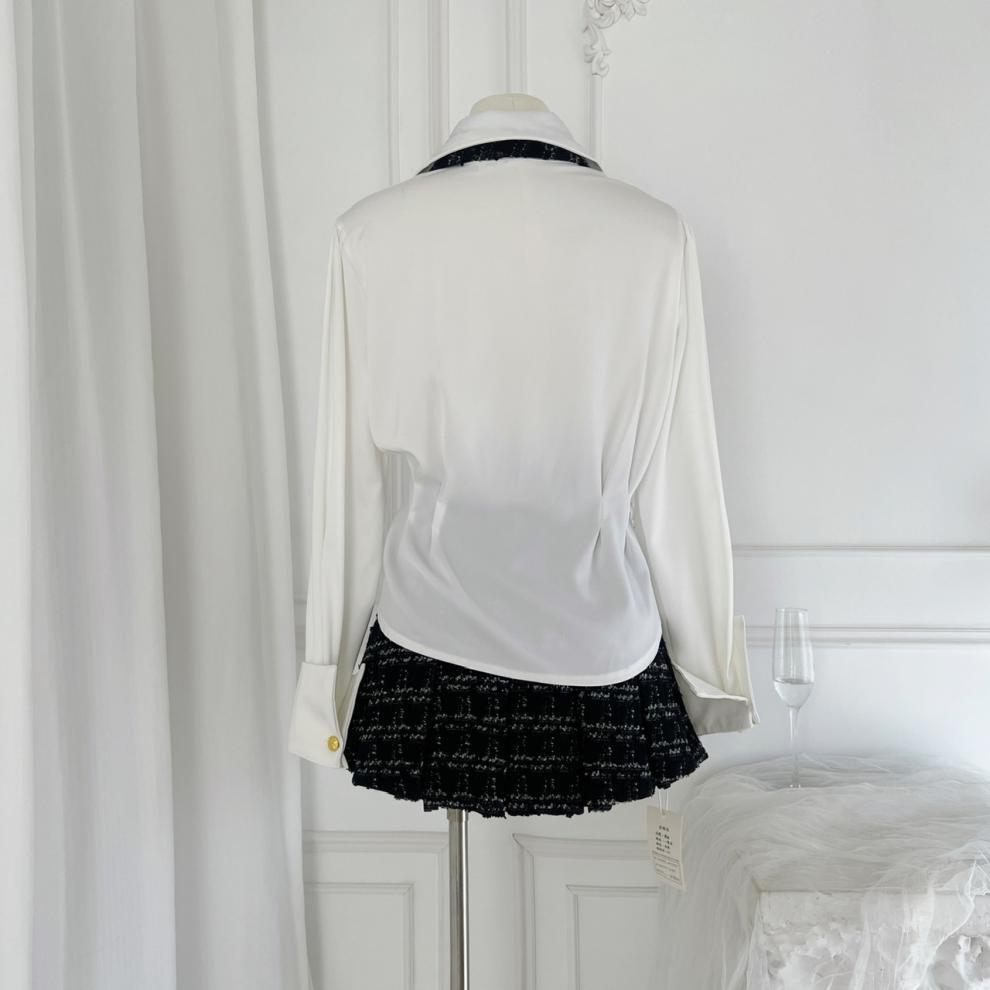 Foto real buena calidad en stock cintura ajustada manga abullonada top con lazo + traje de falda plisada a cuadros blanco y negro de fragancia pequeña