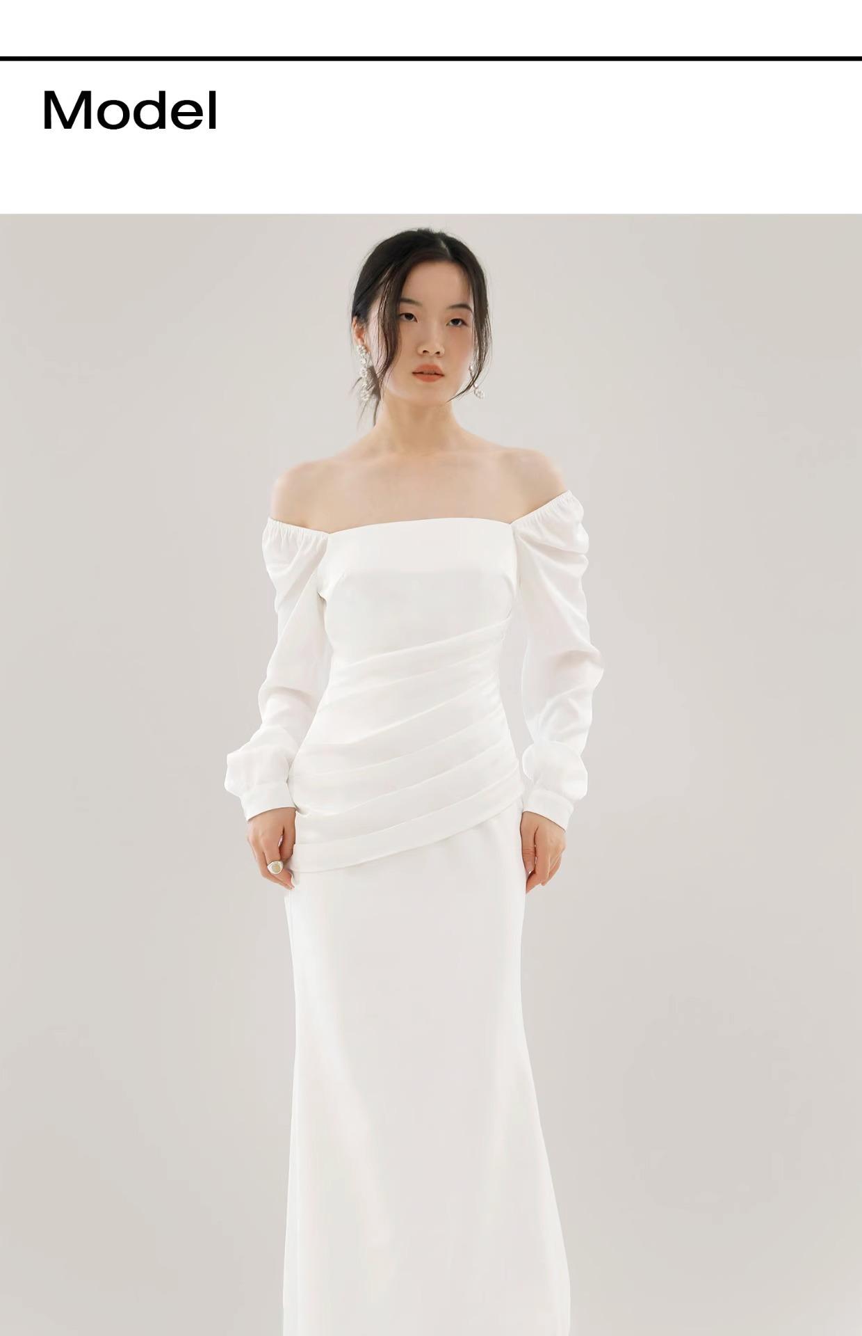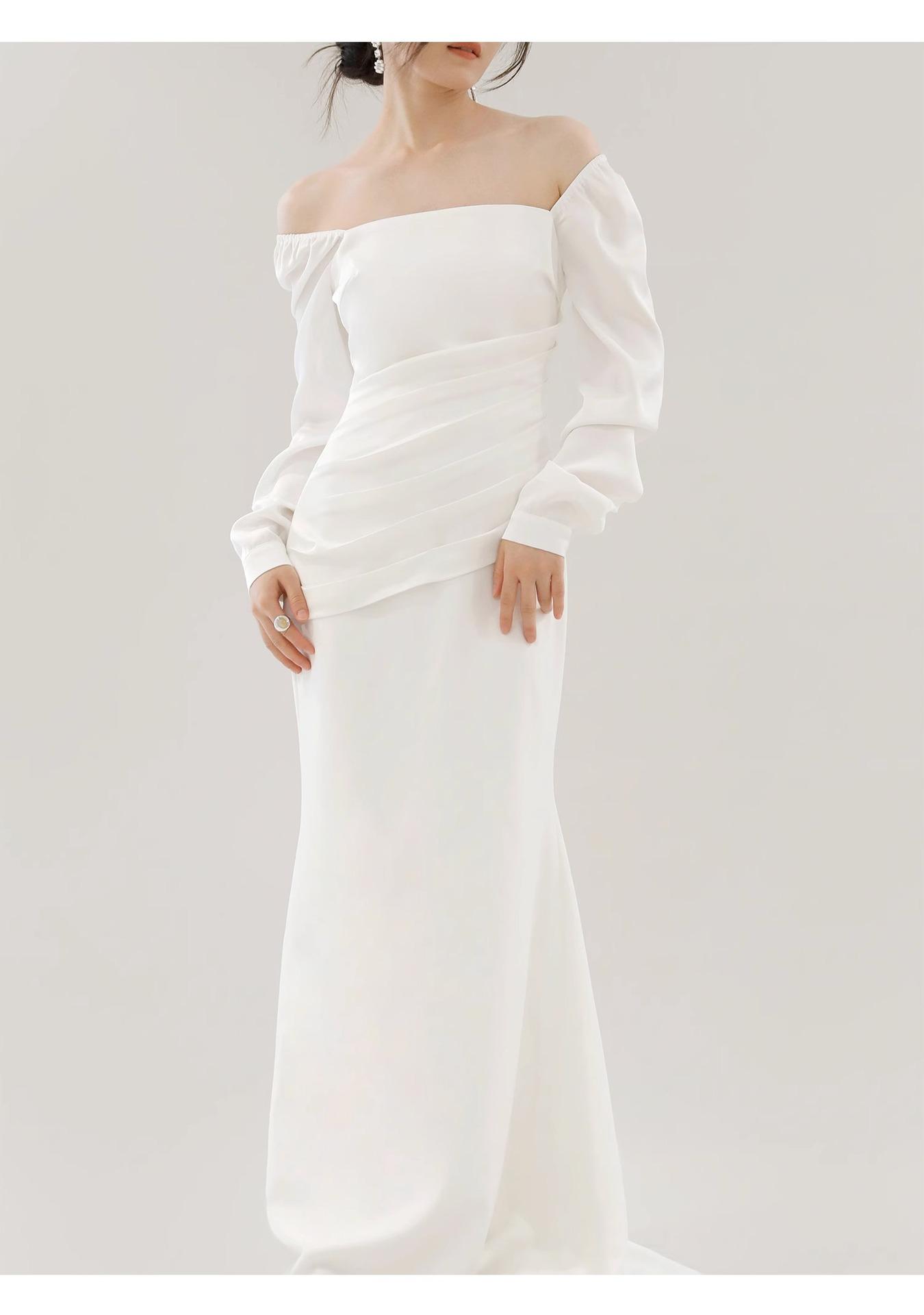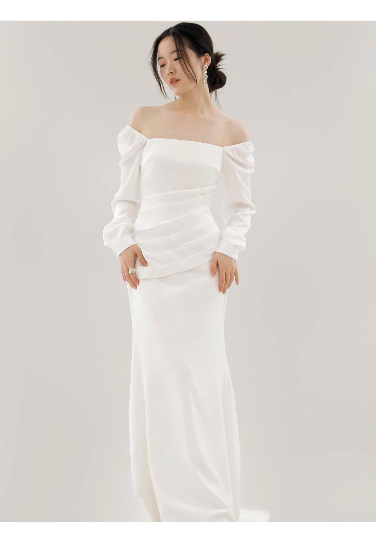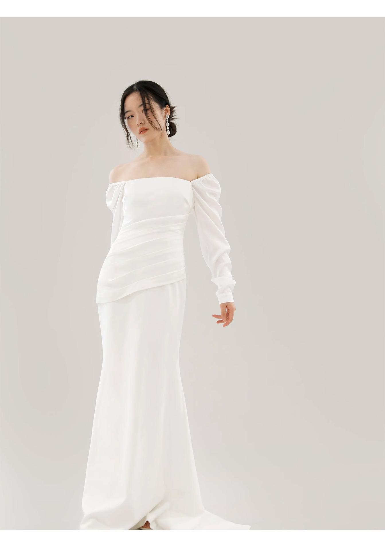 Vestido de Novia Estilo Francés Elegante Hombros Descubiertos Plisado 2025 Nuevo Dos-piezas Cuello Hombros Descubiertos Manga Larga Blanco Falda Larga