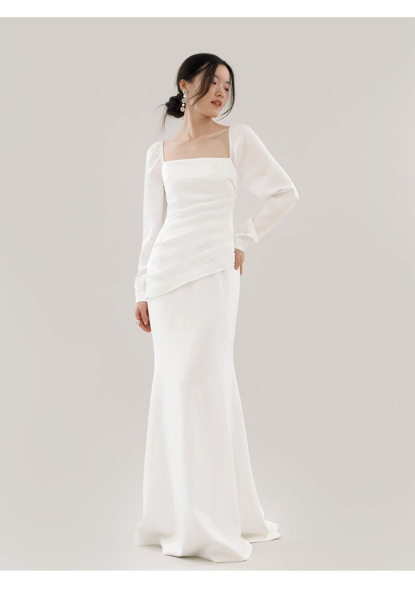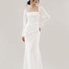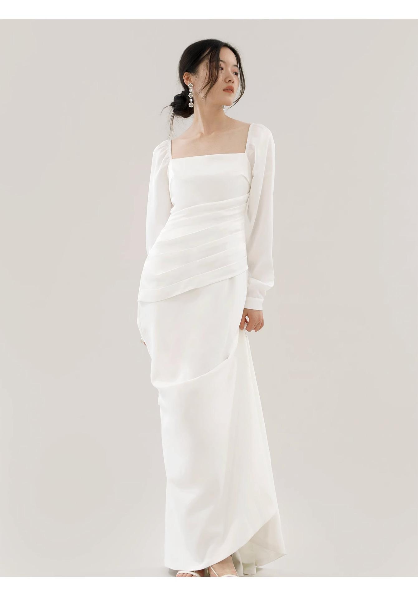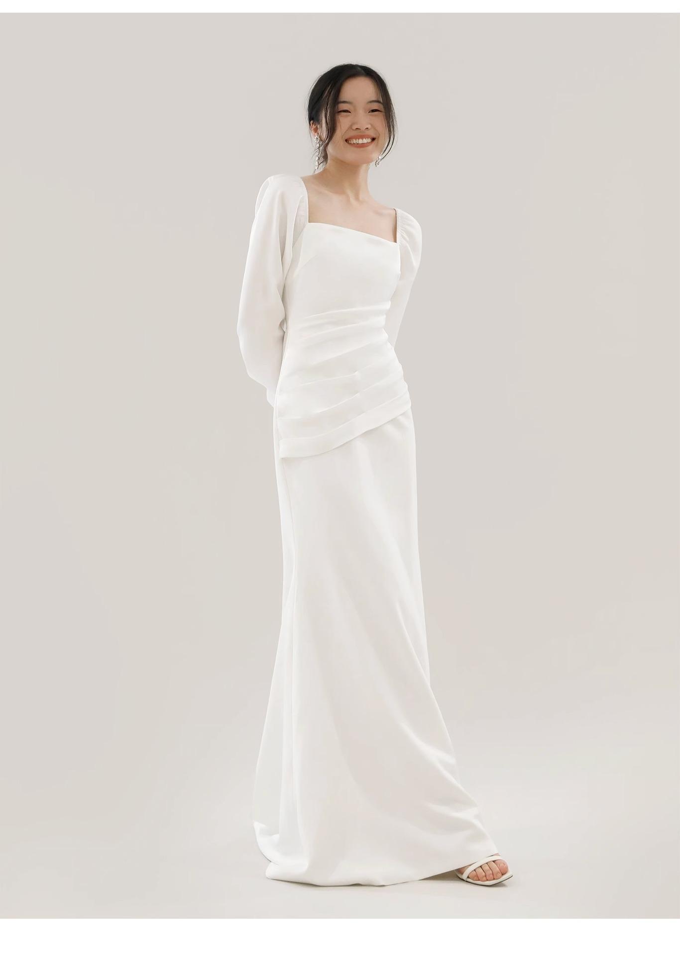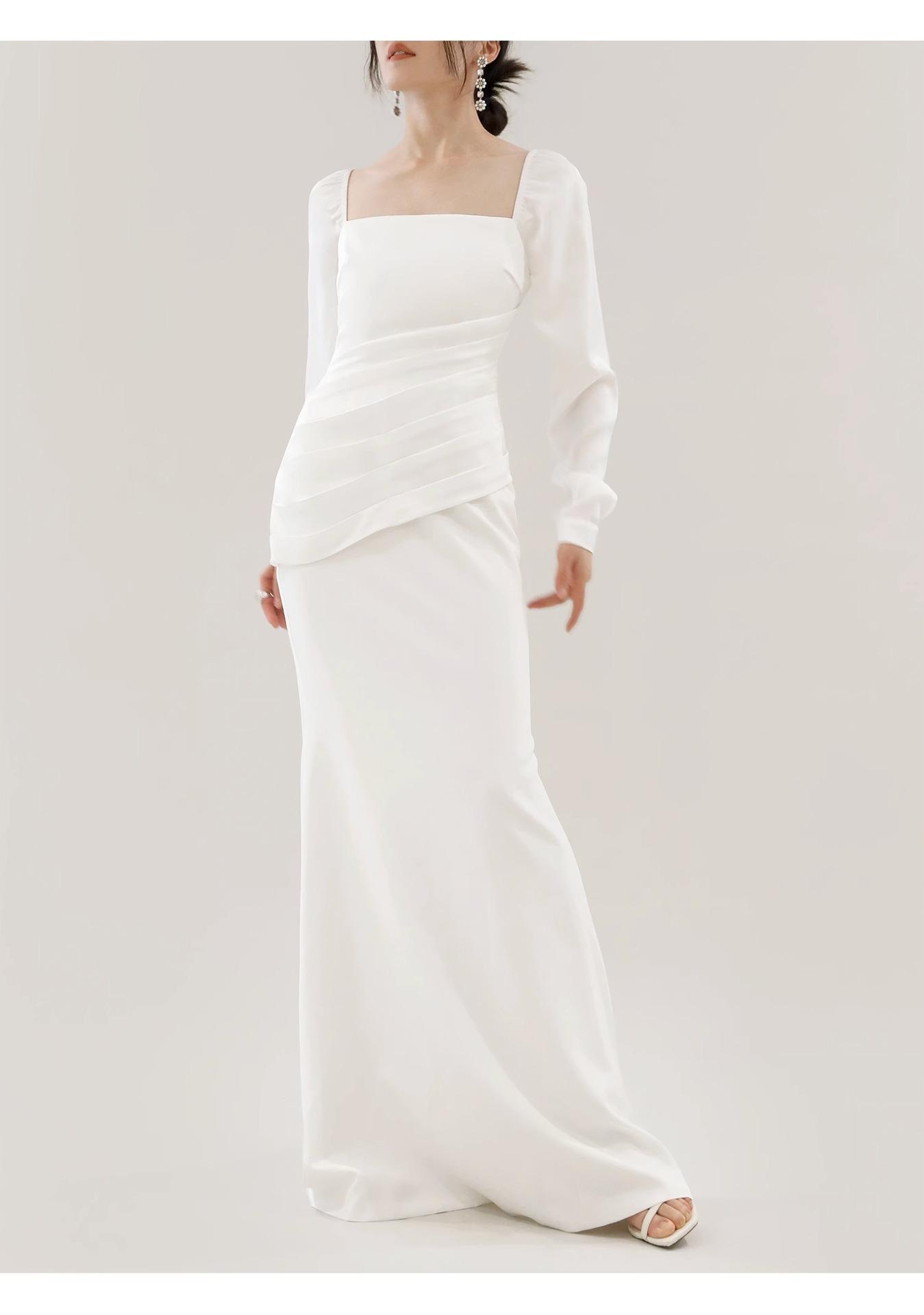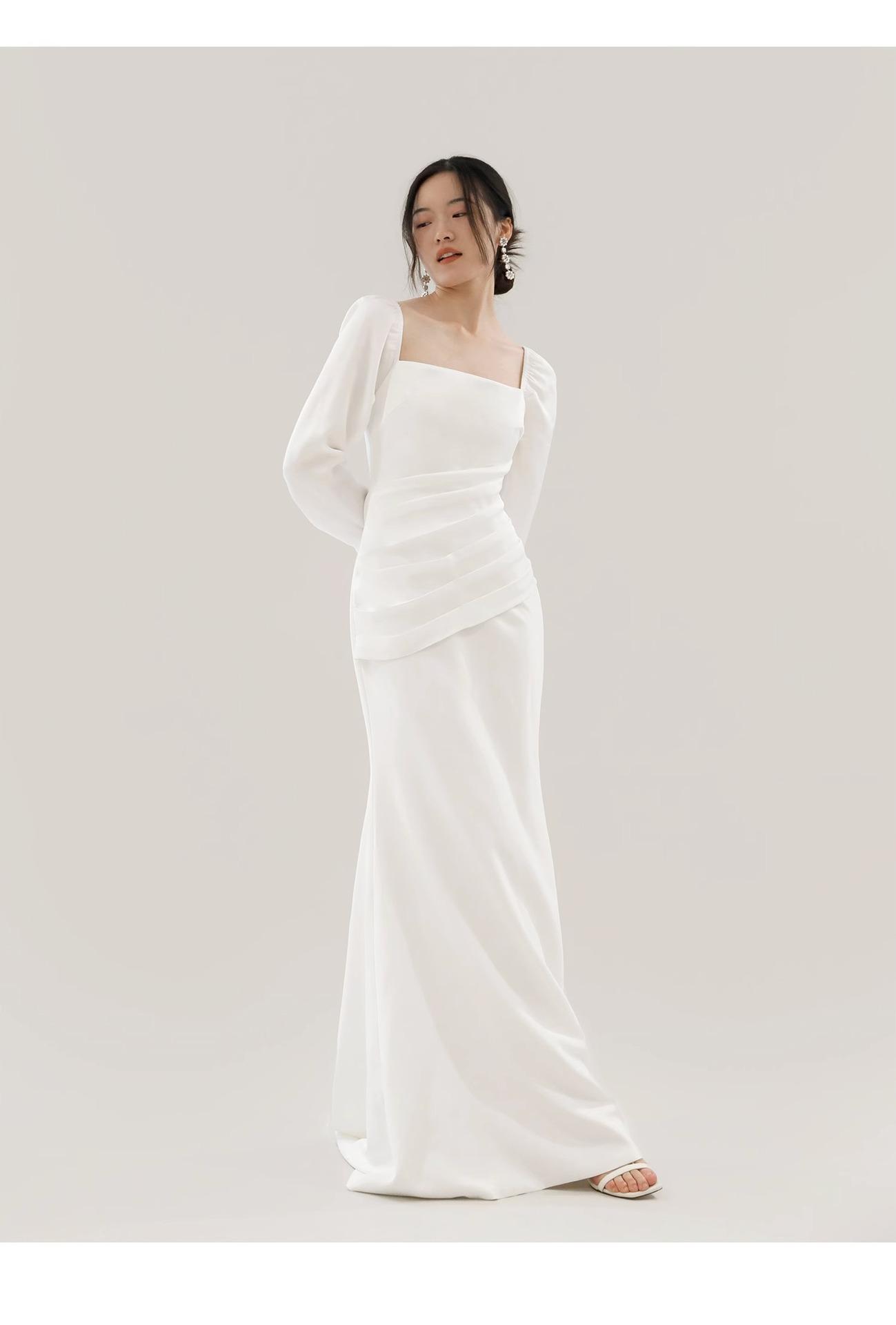 Vestido de Novia Estilo Francés Elegante Hombros Descubiertos Plisado 2025 Nuevo Dos-piezas Cuello Hombros Descubiertos Manga Larga Blanco Falda Larga