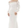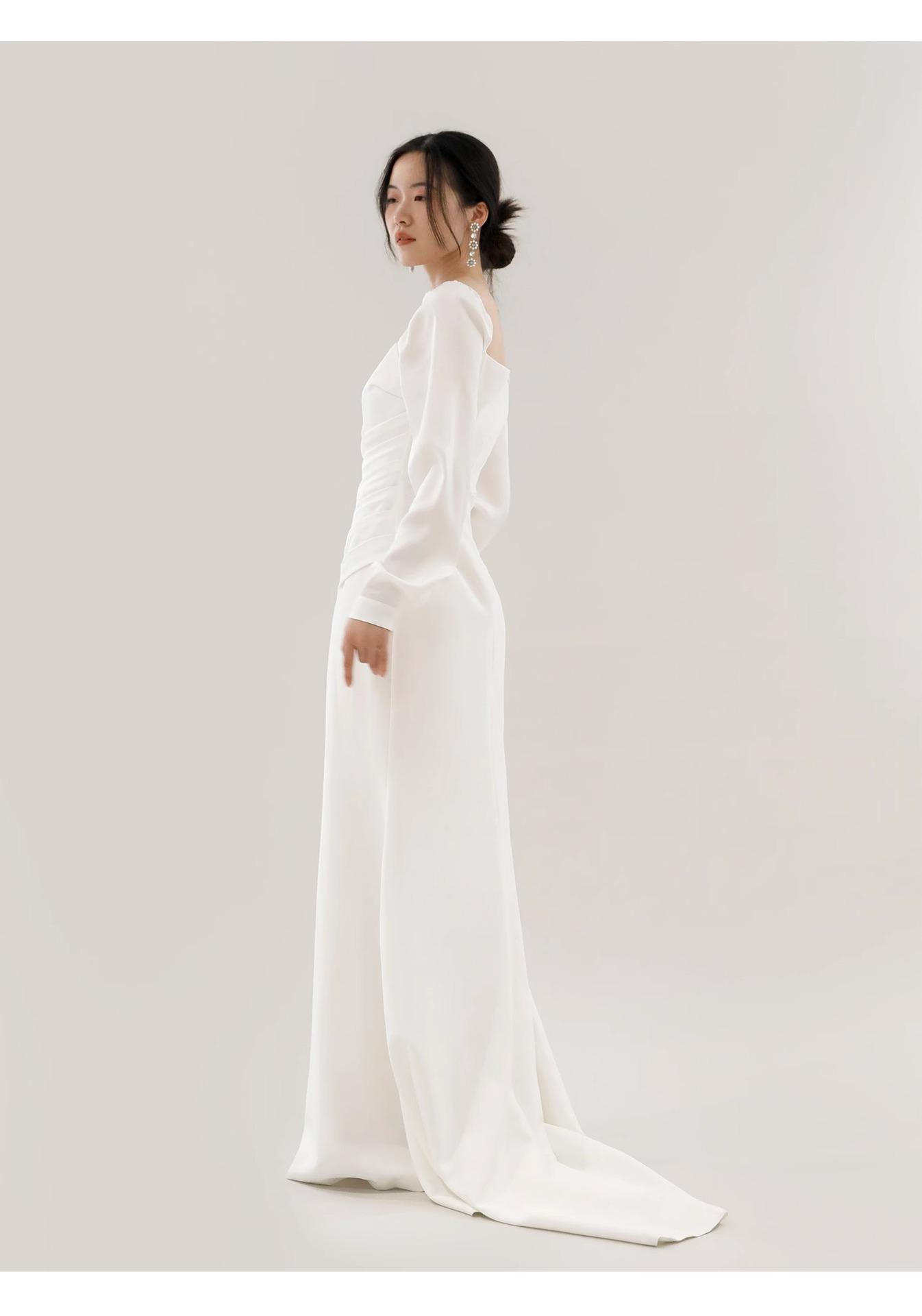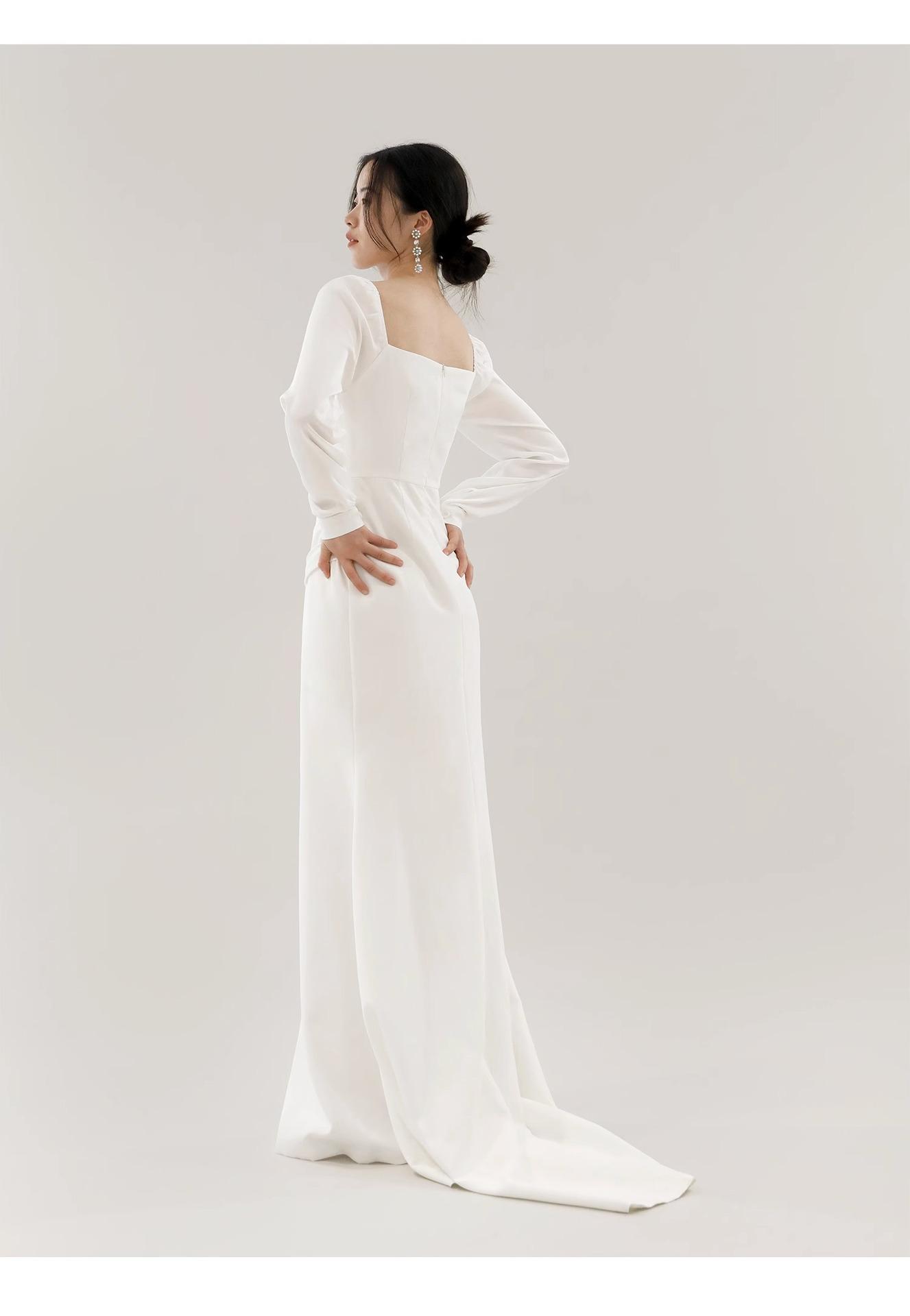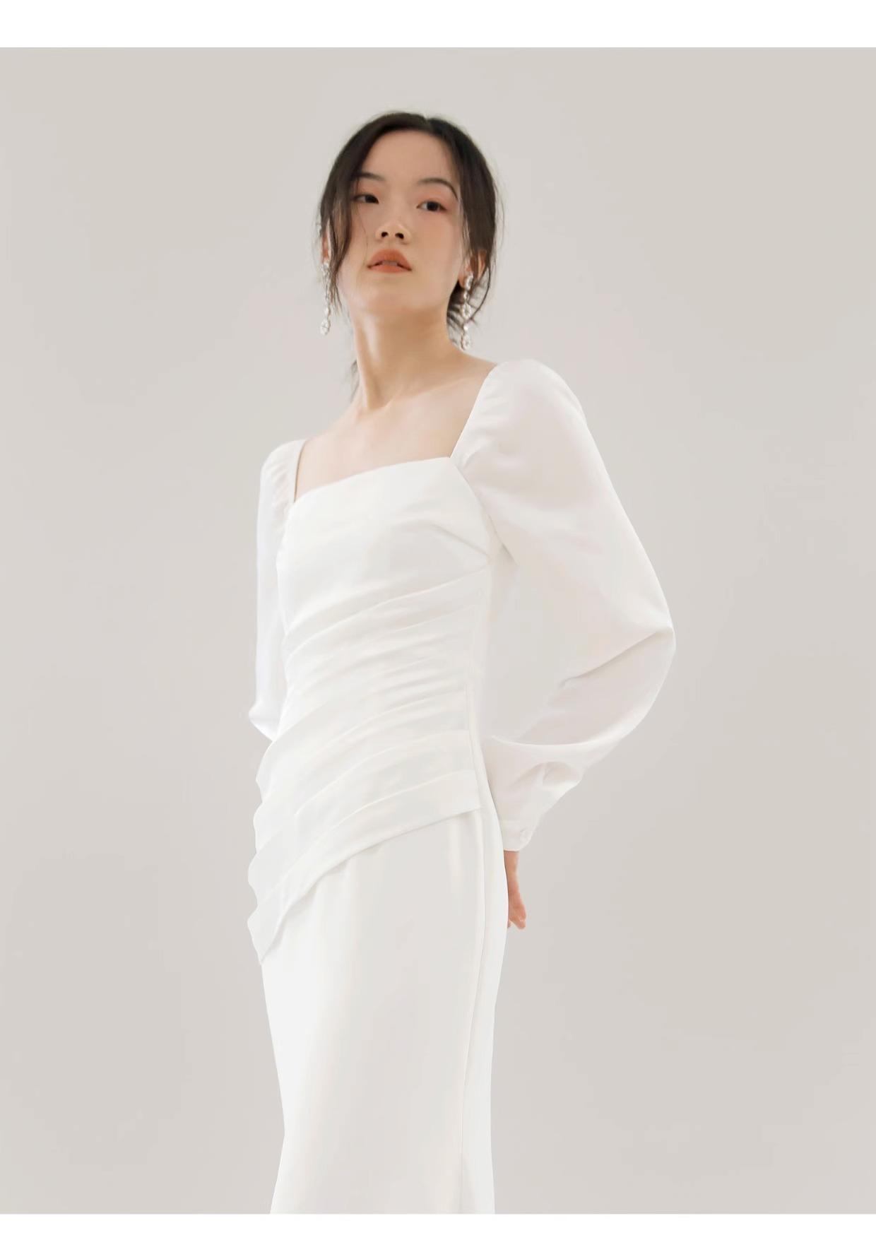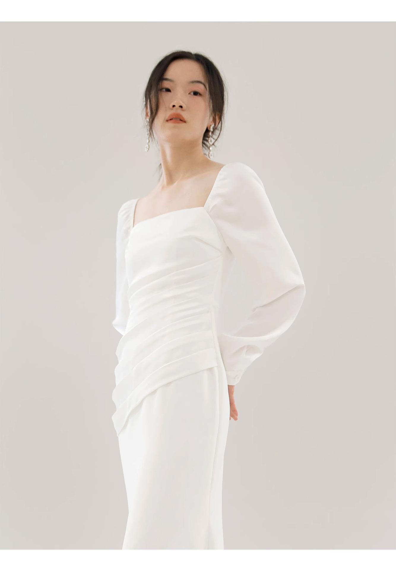 Vestido de Novia Estilo Francés Elegante Hombros Descubiertos Plisado 2025 Nuevo Dos-piezas Cuello Hombros Descubiertos Manga Larga Blanco Falda Larga
