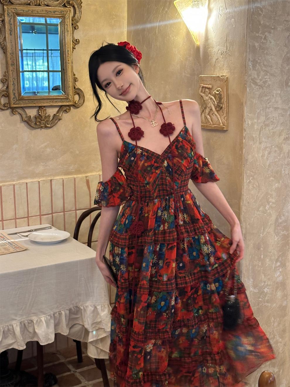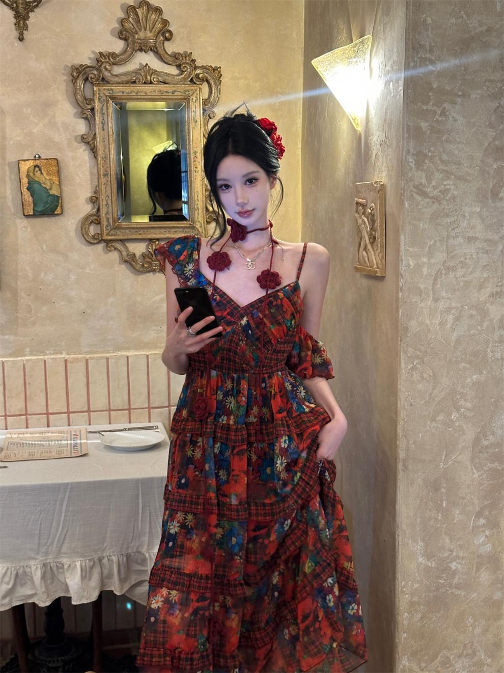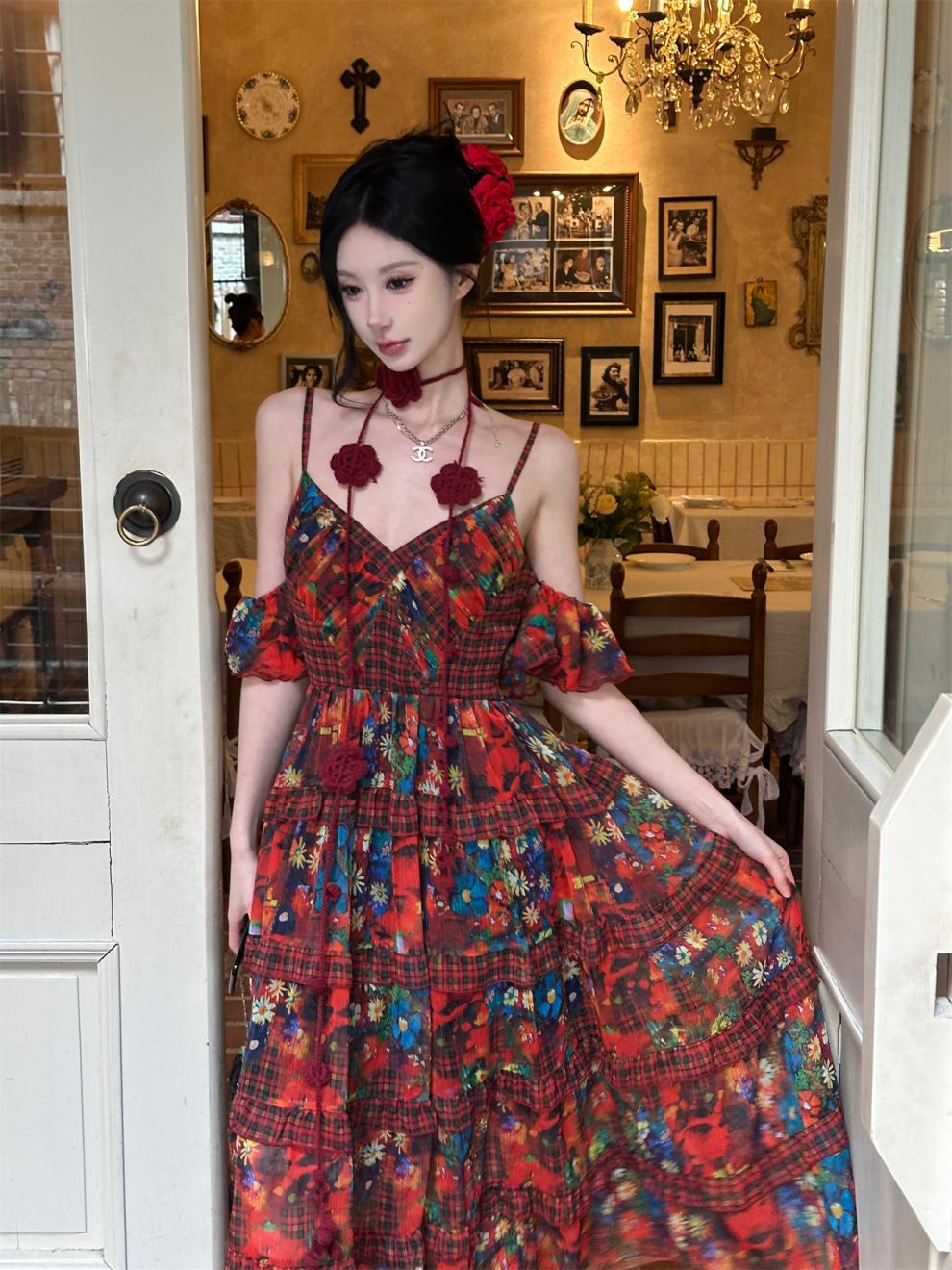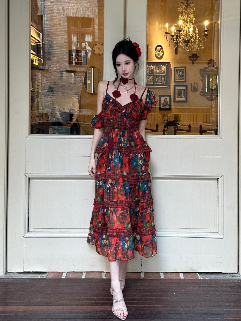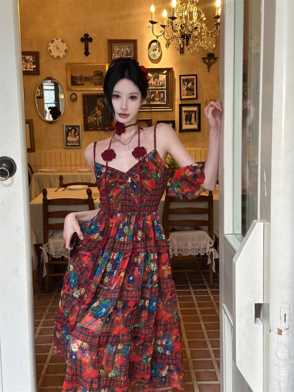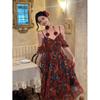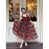 Foto real en stock primavera francés retro cuello tira vestido floral vestido de fiesta verano