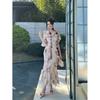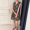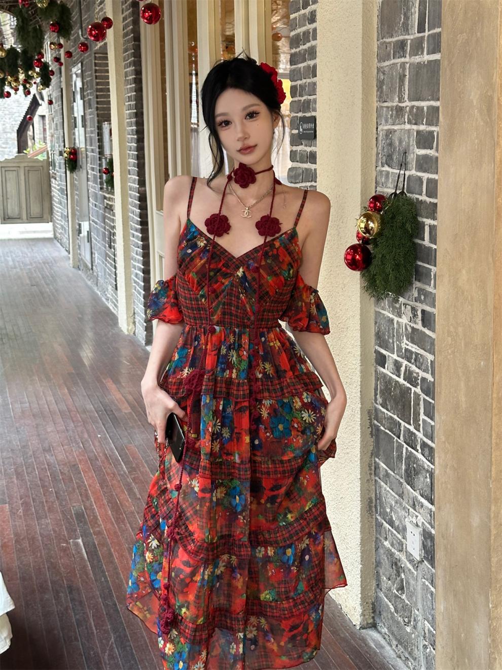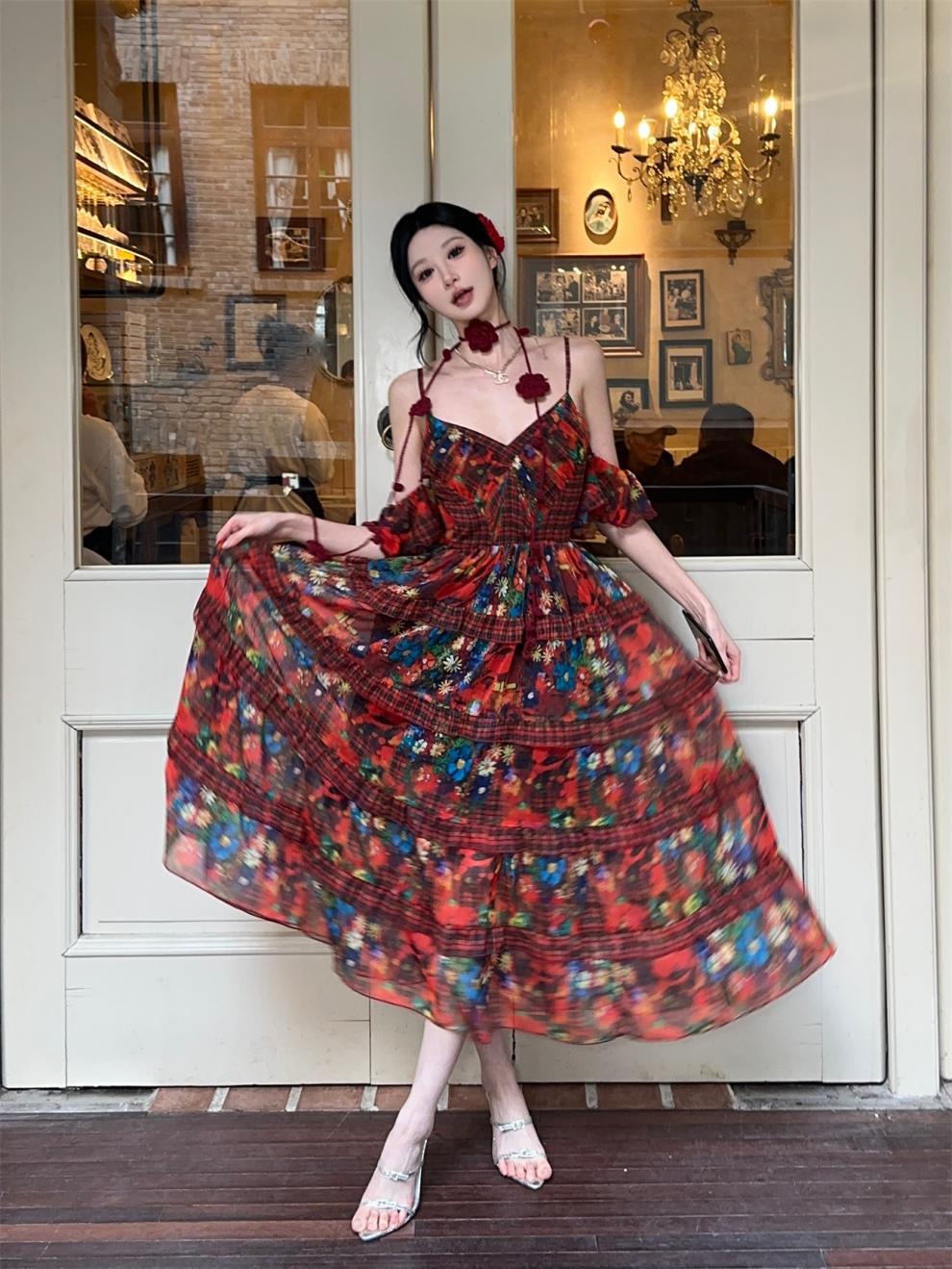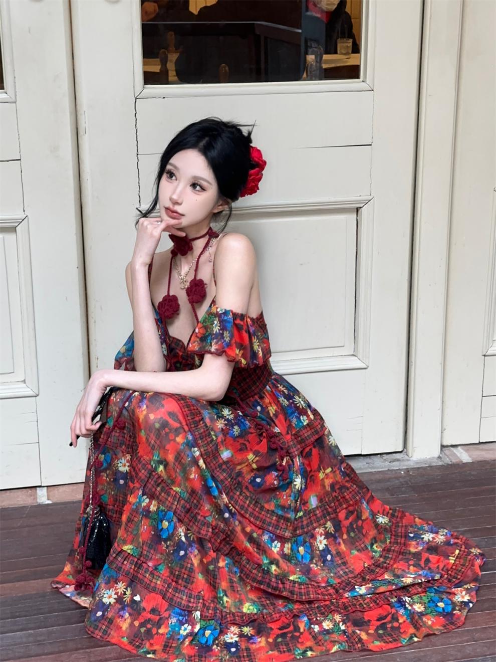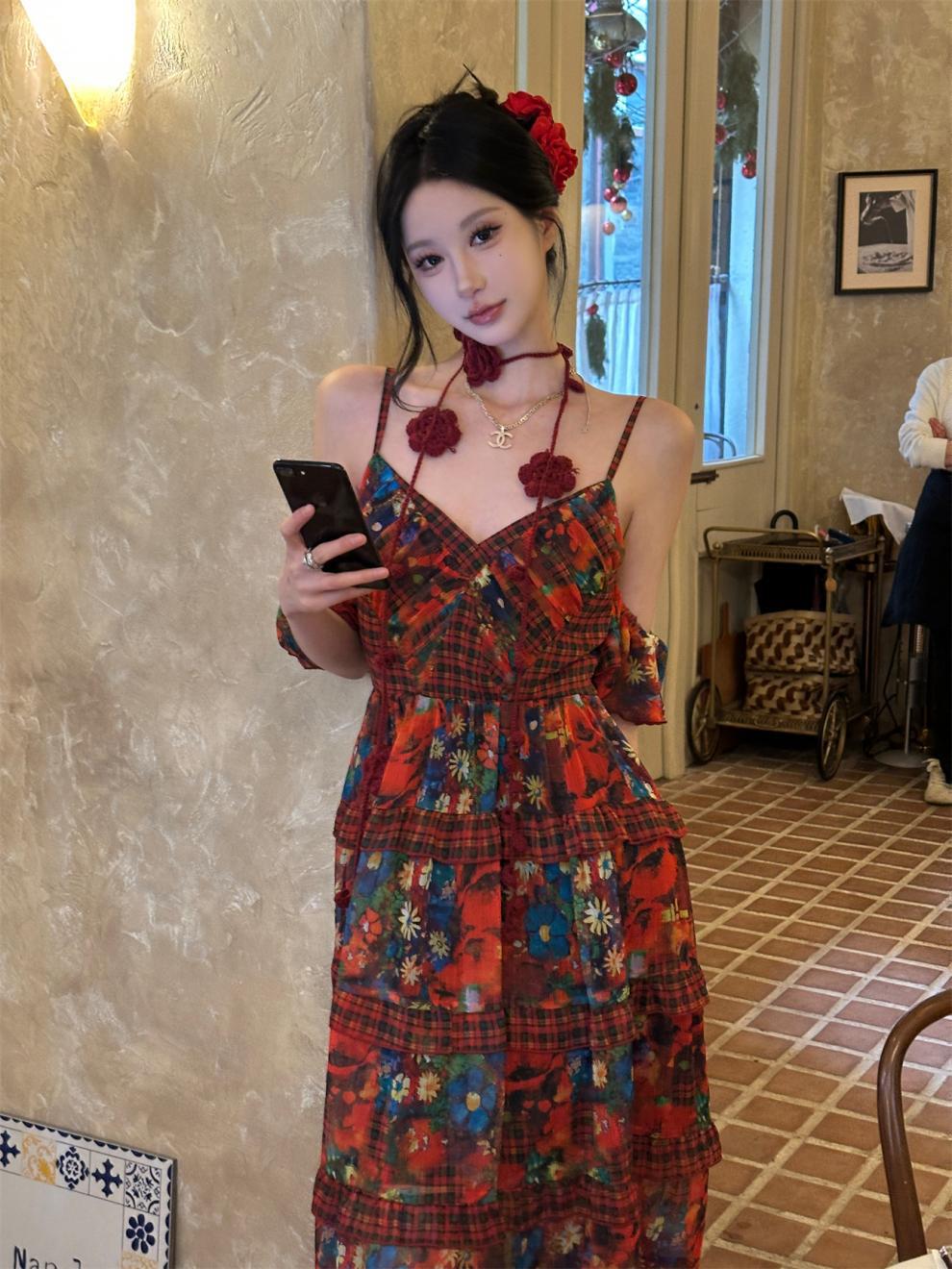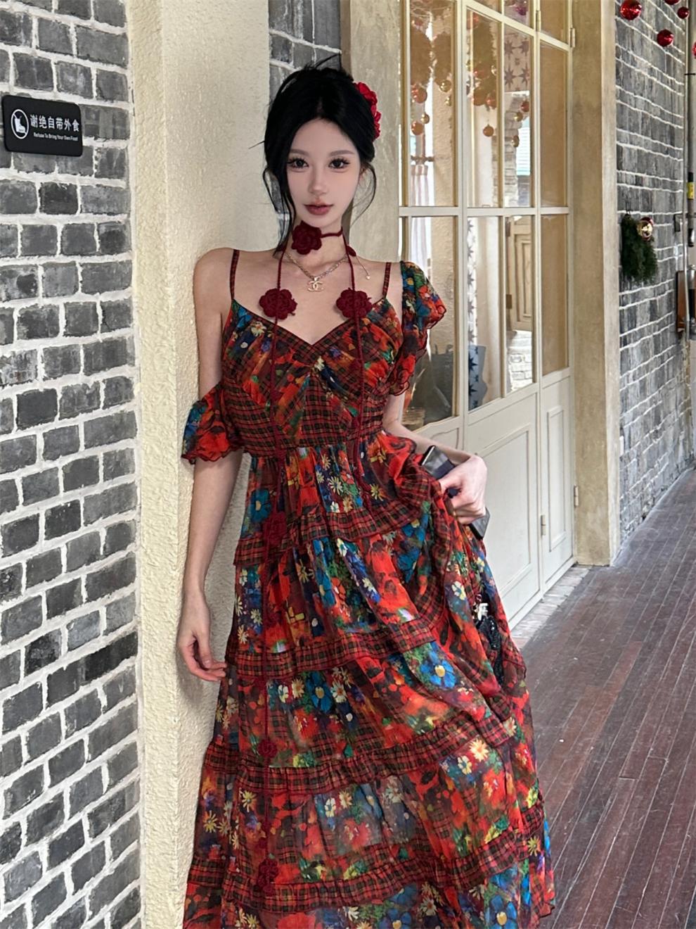 Foto real en stock primavera francés retro cuello tira vestido floral vestido de fiesta verano