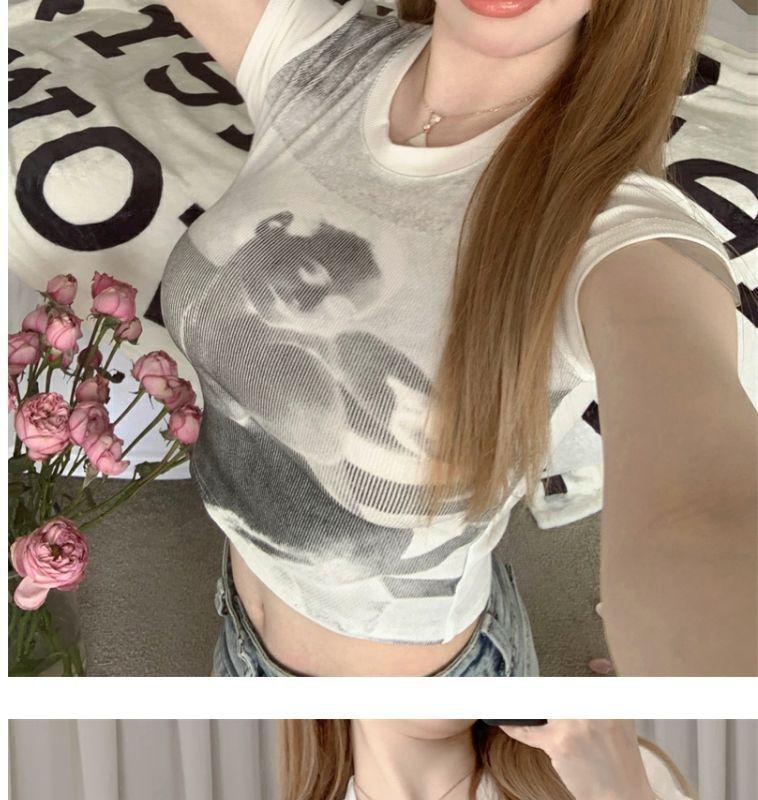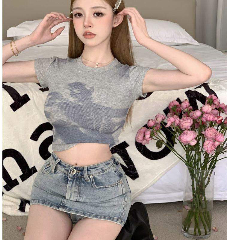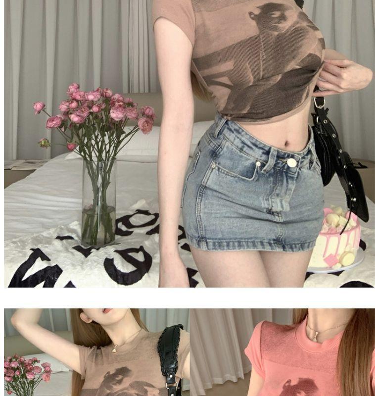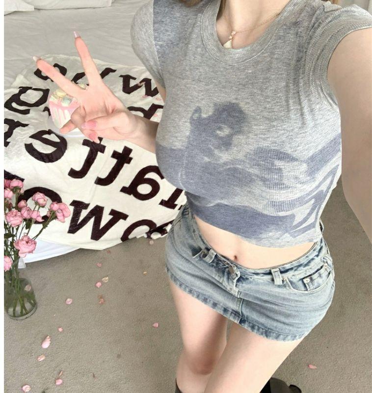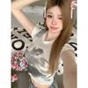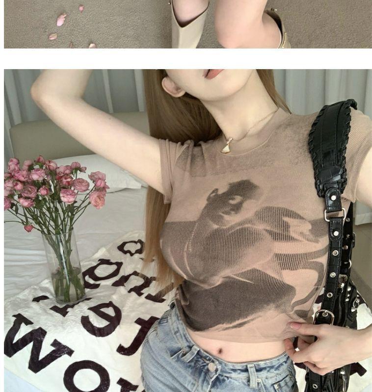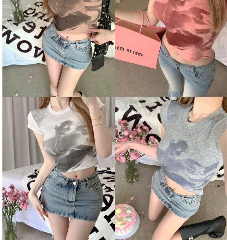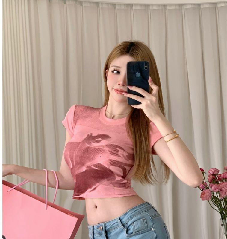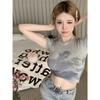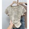 Camiseta de Hombro de Manga Corta para Chica Caliente Estilo Americano Verano 2024 Nuevo Top Corto Ajustado con Estampado Tie-dye Vintage