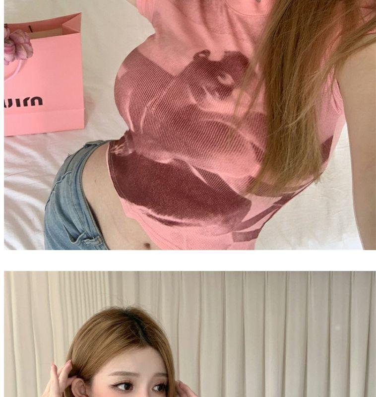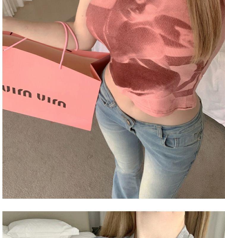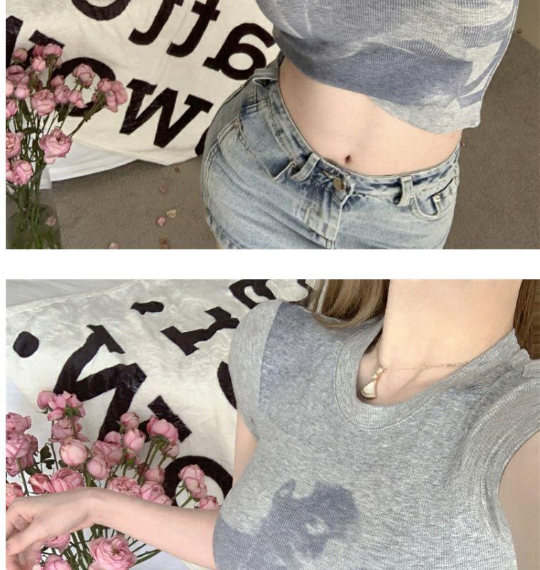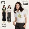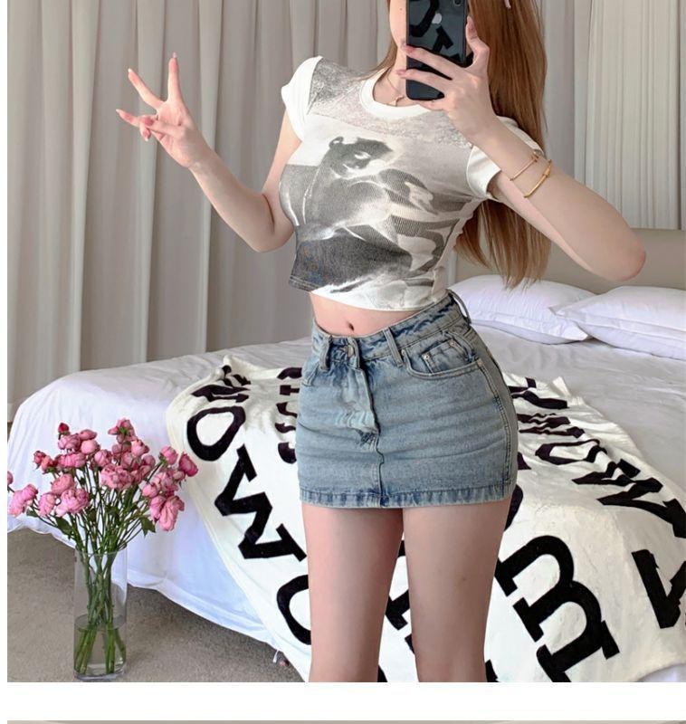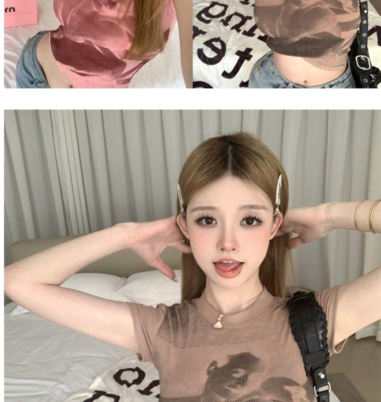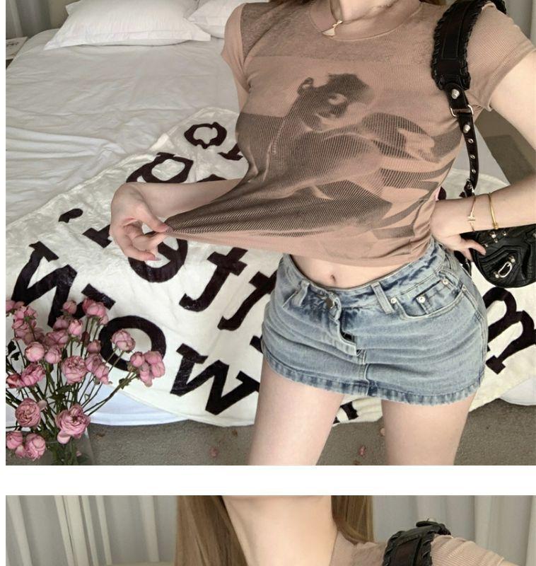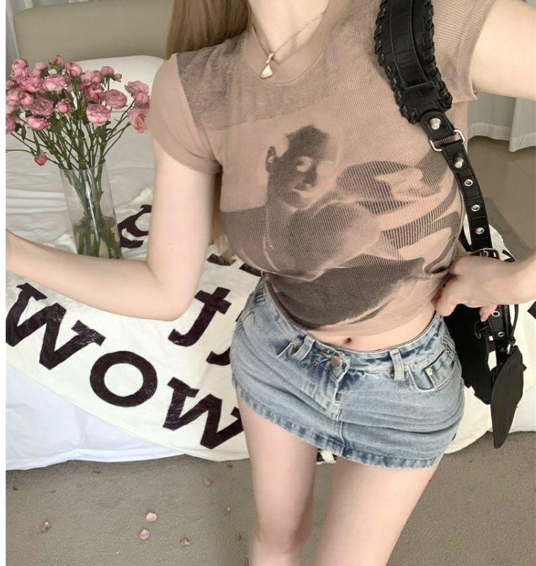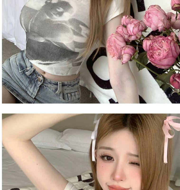 Camiseta de Hombro de Manga Corta para Chica Caliente Estilo Americano Verano 2024 Nuevo Top Corto Ajustado con Estampado Tie-dye Vintage