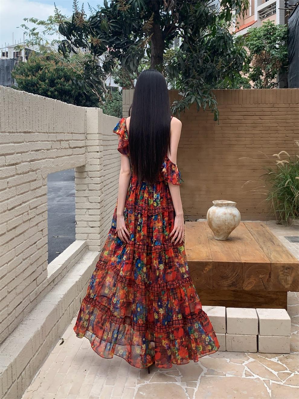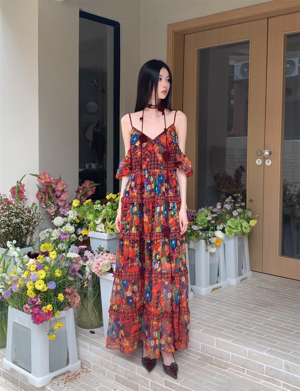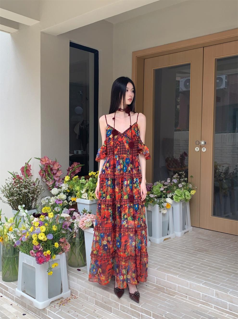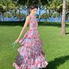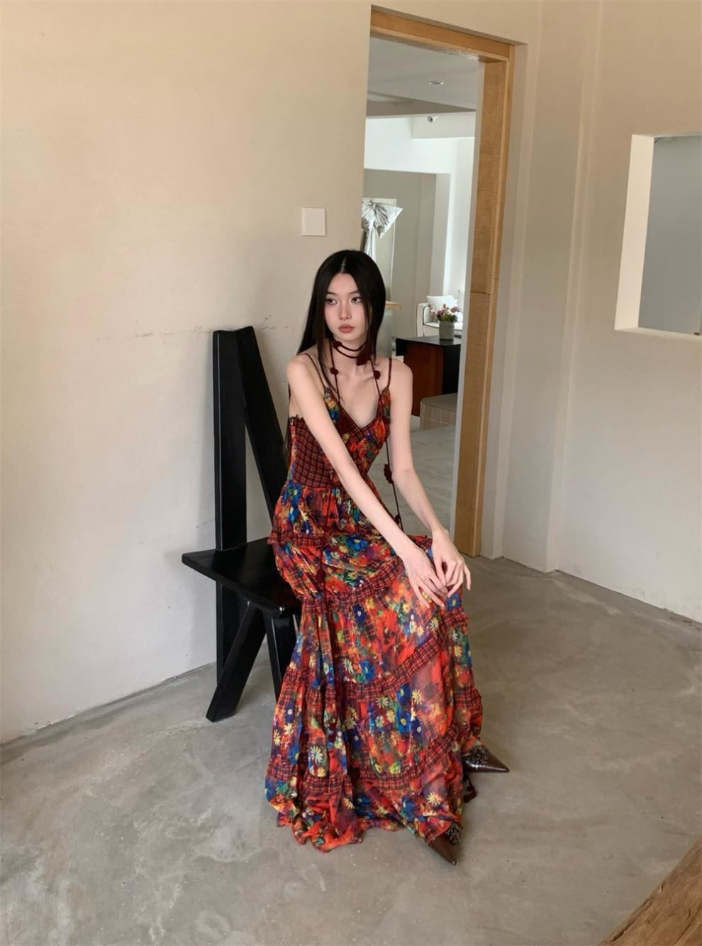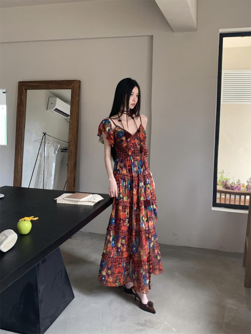 Foto real en stock vestido floral de tirantes retro francés para vacaciones