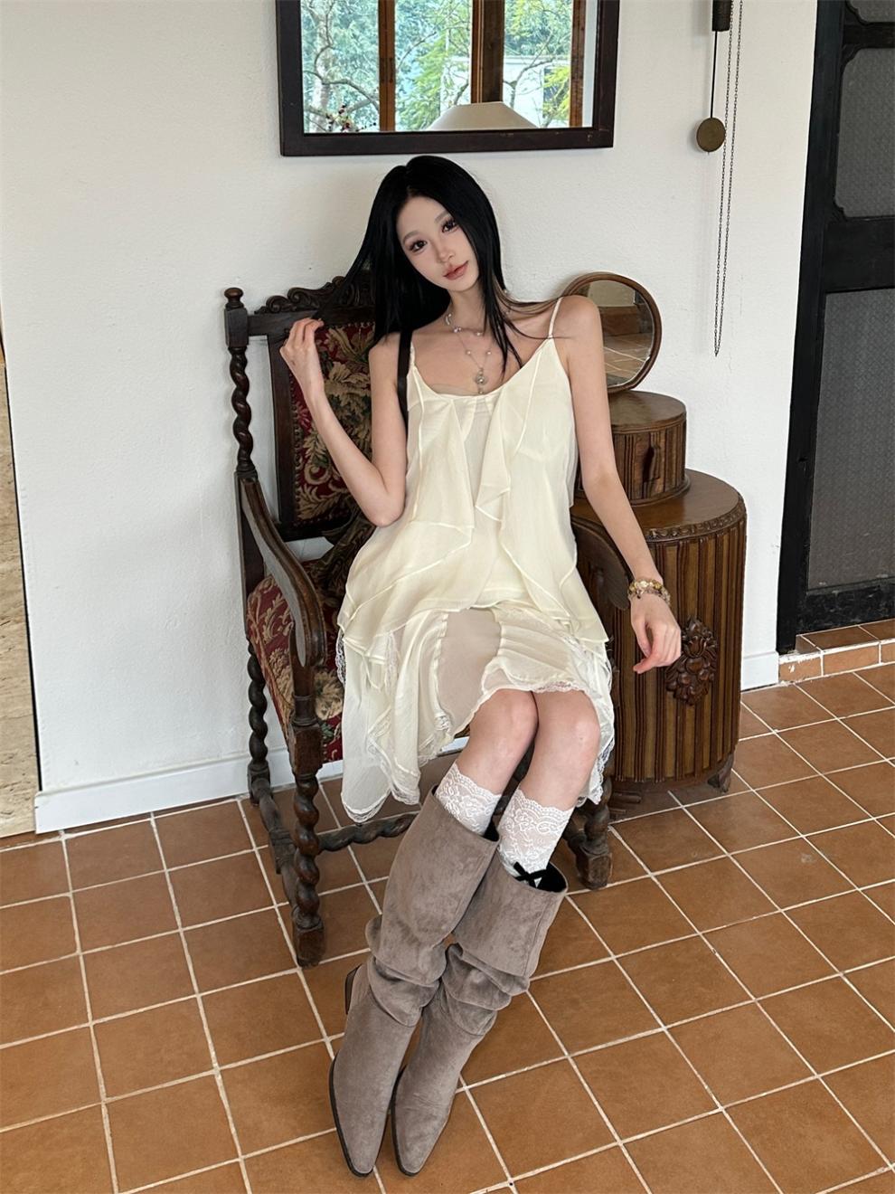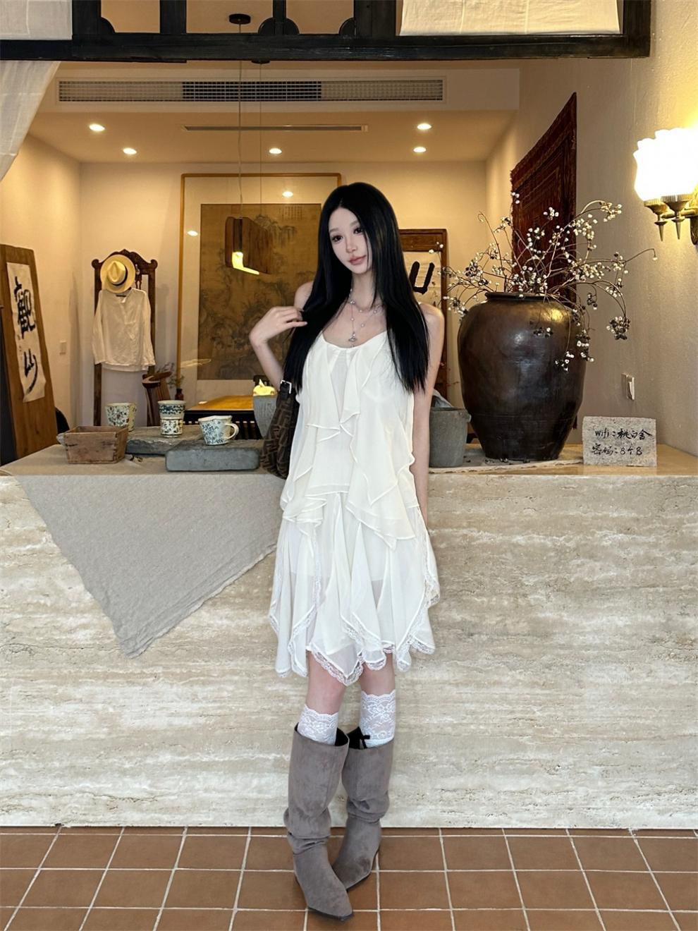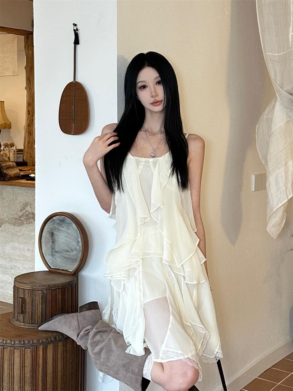Foto real en stock camisola irregular hoja de loto falda pétalo encaje traje pantalón ropa de viaje para vacaciones