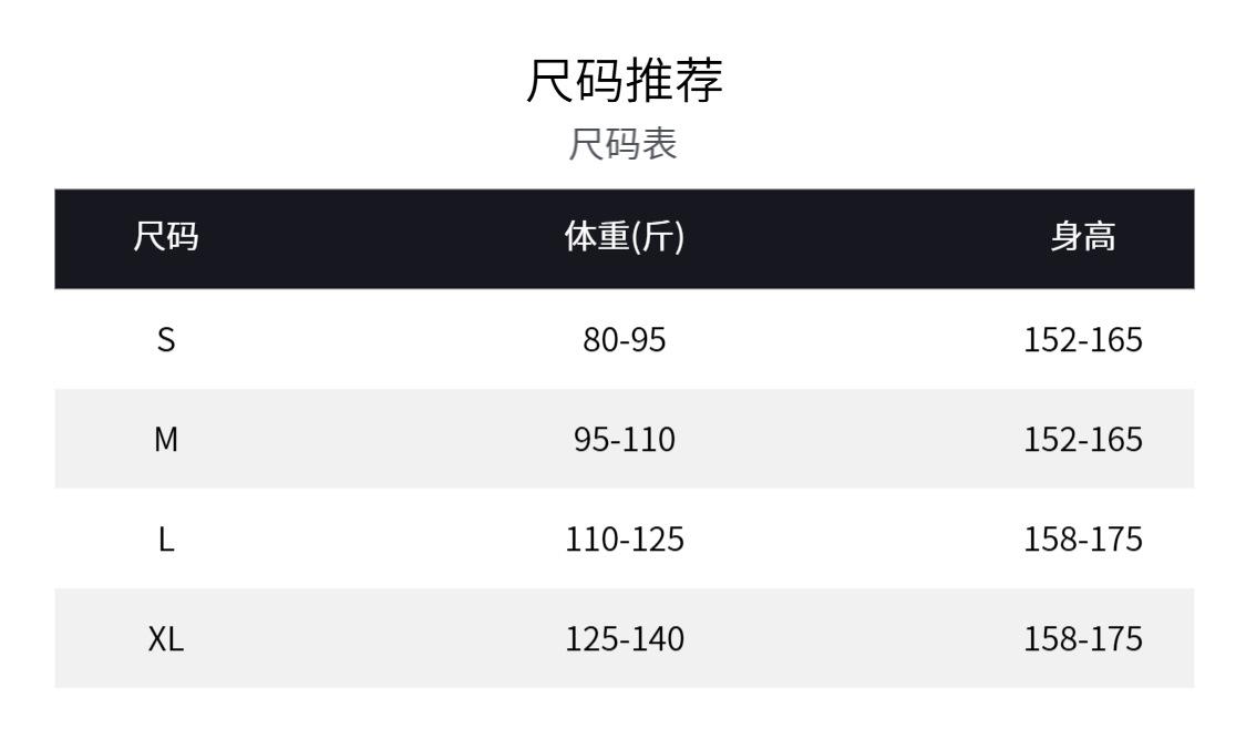 S (under 100 jin), M (100-115 catties), L (115-125 catties), XL (125-135 catties)