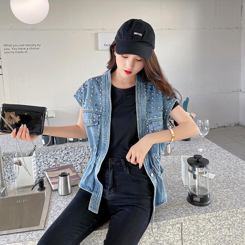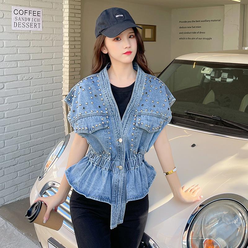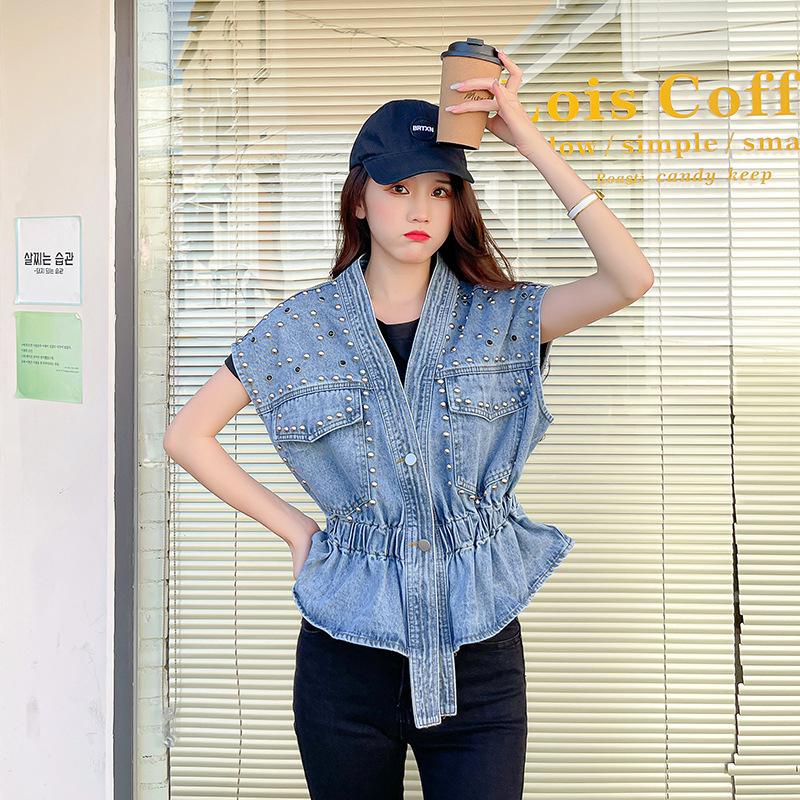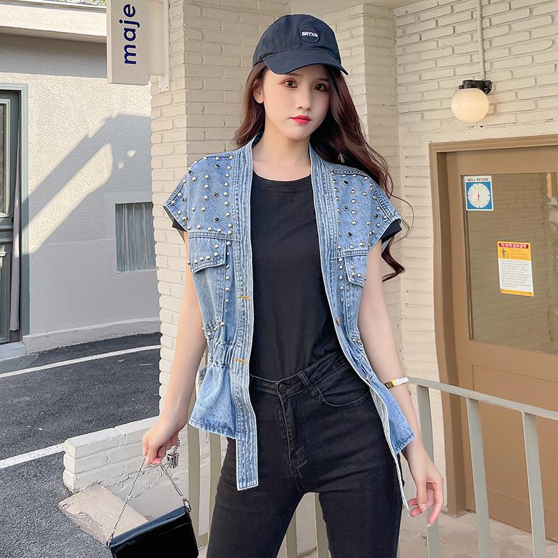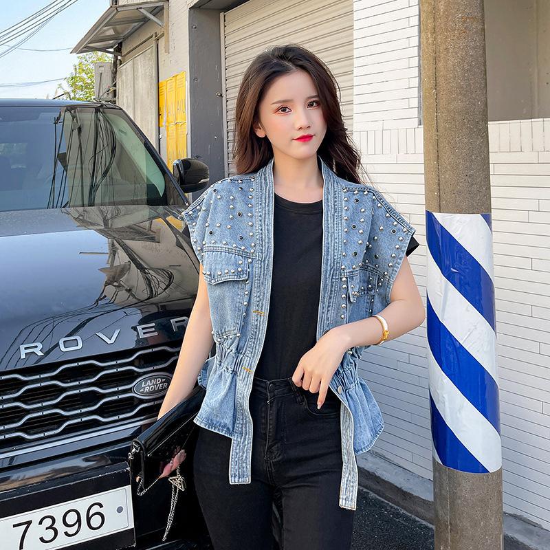 Nuevo Estilo Transfronterizo Cintura con Cuentas Adelgazante Holgado Versátil Sin Mangas Suave Top Chaleco de Mezclilla