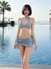 Traje de baño dividido estilo europeo y americano Bikini sexy para mujer Vestido envolvente Conjunto de tres piezas Tirantes para pecho pequeño Recogido Traje de baño de vacaciones Aguas termales
