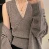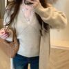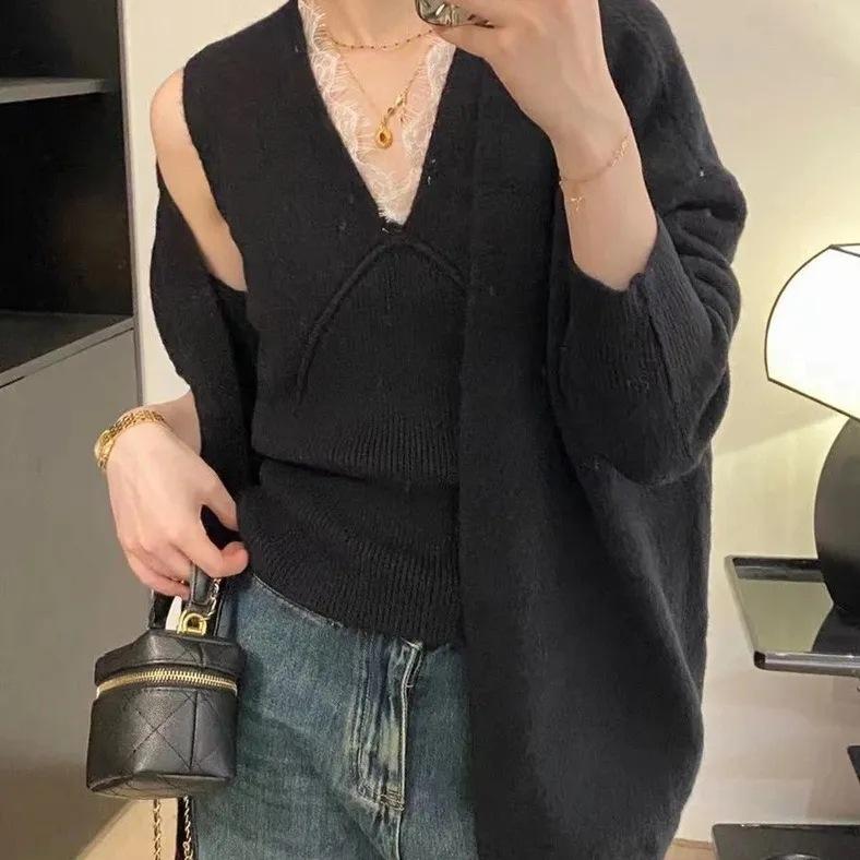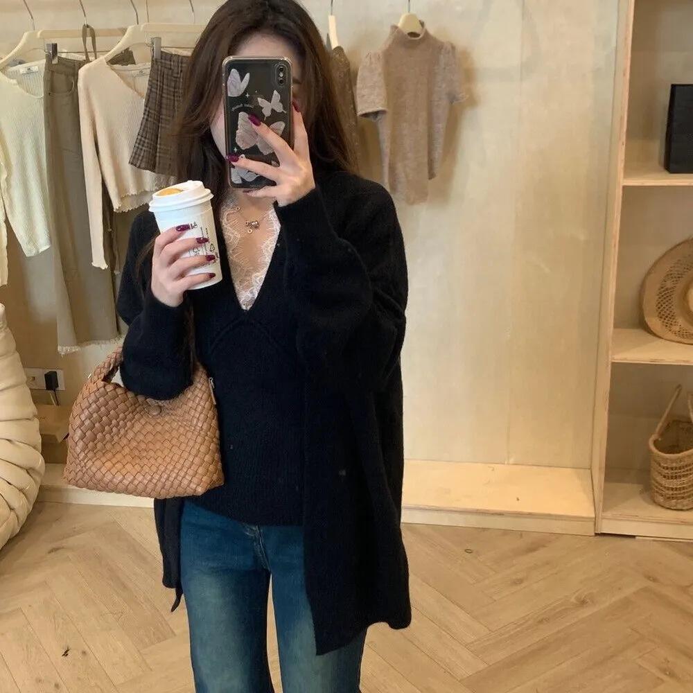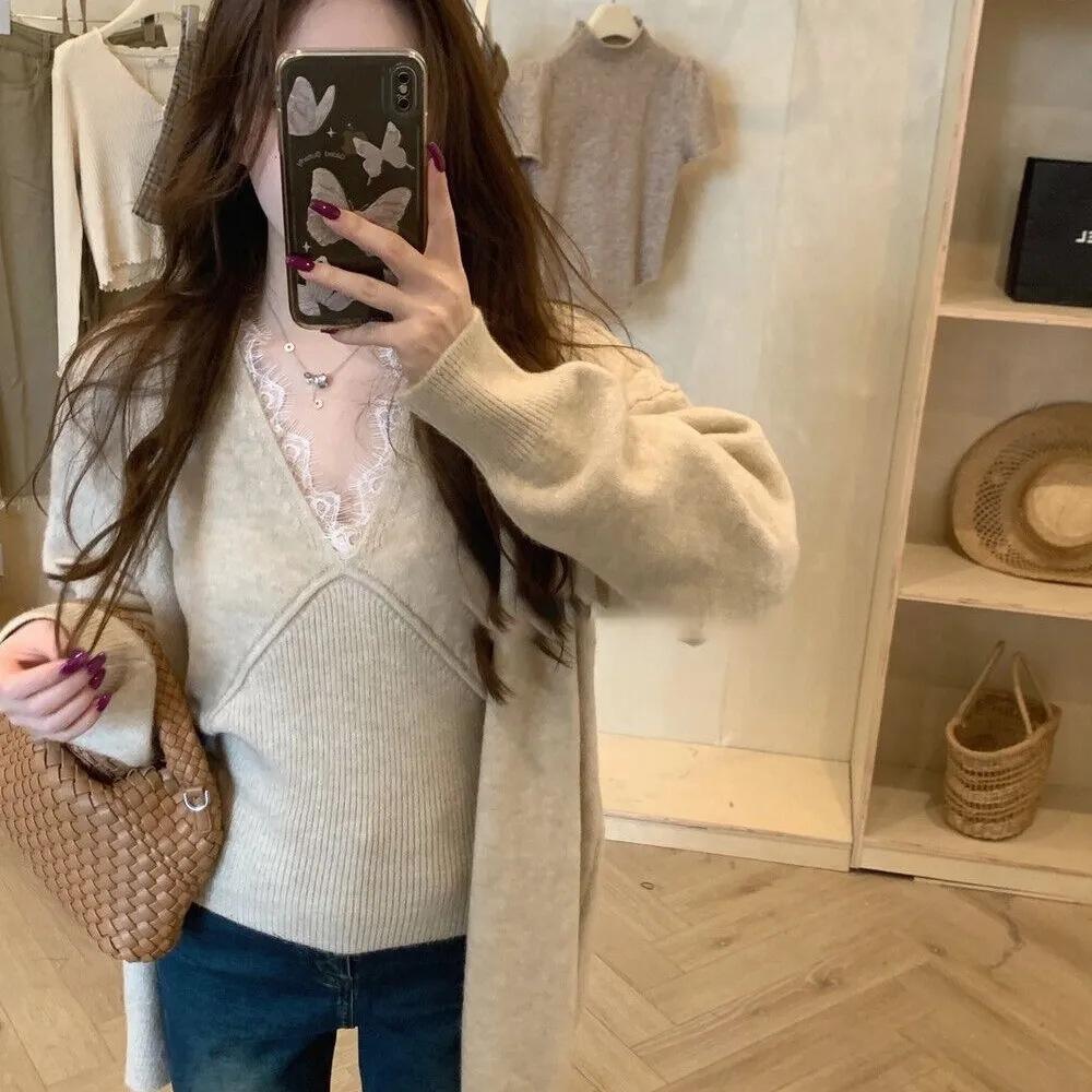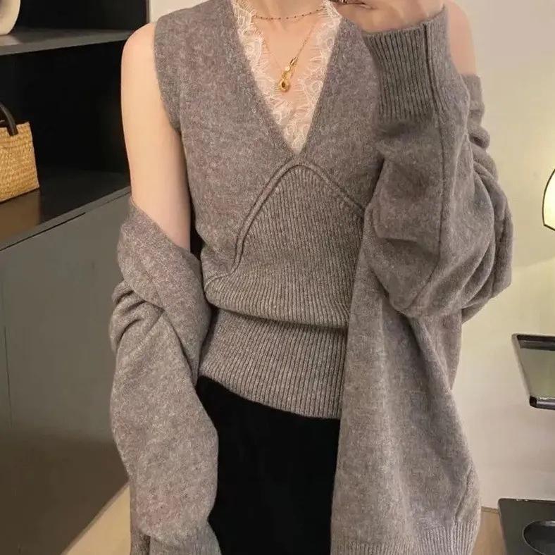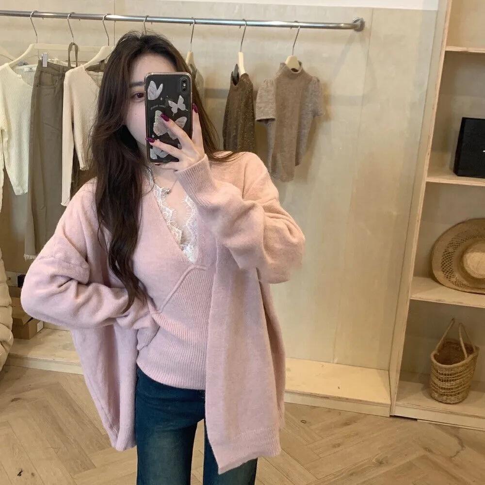 Suéter de Dos Piezas con Diseño de Estilo Coreano Otoño e Invierno Nuevo Encaje Cuello en V Suelto Moda Traje de Cárdigan de Punto para Mujer