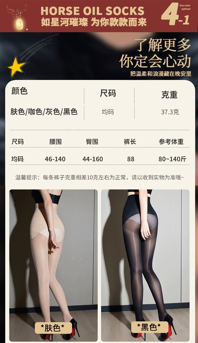 Desde que los calcetines de aceite de caballo se lanzaron al mercado, han recibido elogios unánimes de muchos clientes. Son amados por los clientes debido a su transparencia, sedosidad, alta elasticidad, sensación de no restricción, comodidad y el brillo natural de la parte superior del cuerpo. El tejido de alta densidad de 912 agujas combina muy bien la transparencia, la sedosidad y el brillo del tejido. El nuevo diseño sin costuras utiliza un método de corte tridimensional para la posición de la entrepierna. Este tipo de corte no se cae, y el diseño de cintura alta también puede levantar la entrepierna y tensar el abdomen muy bien. Un par de calcetines tiene las características de levantar las caderas, tensar el abdomen, cubrir imperfecciones y brillar. El tejido también es resistente a los arañazos y al desgaste. Un producto así definitivamente no debería perderse.