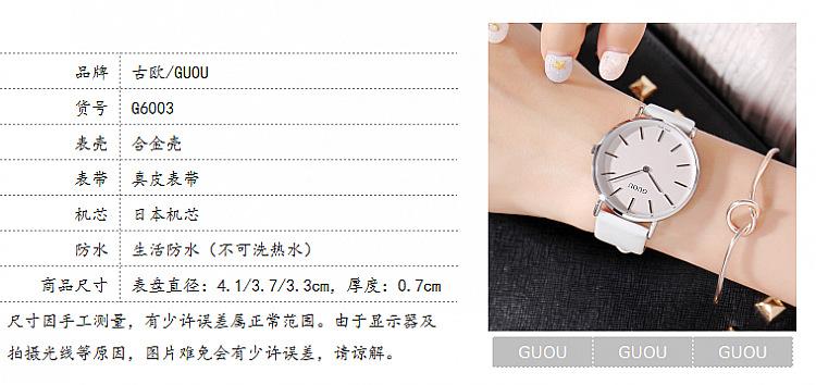 Marca: GUOU/古欧 Introducción: La esfera está disponible en tamaños grande, mediano y pequeño, adecuada para uso personal, o para que la usen parejas y mejores amigos juntos. Cuenta con un diseño de índice de barra minimalista, un reloj ultradelgado y elegante, una correa de cuero genuino y un movimiento japonés importado para una calidad perfecta. Es la élite entre los relojes. Modelo: 6003【Hay tres tamaños: grande, mediano y pequeño】 Material: Caja de aleación Correa de cuero genuino Diámetro: Grande: 4.1cm, Mediano: 3.7cm, Pequeño: 3.3cm{{{{{{{{{{
