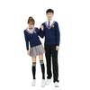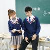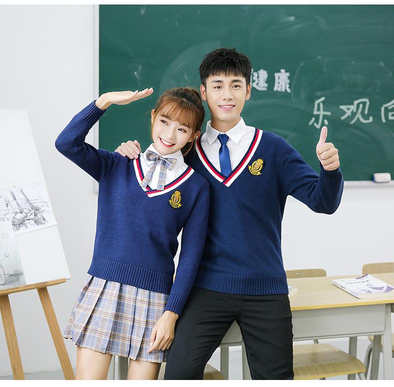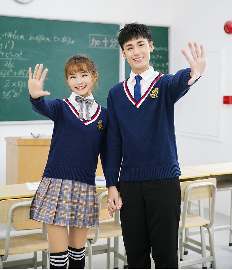 Otoño Nuevo Estilo Universitario Británico Uniforme Escolar Uniforme de Clase V Suéter Azul Vestido de Cuadros Gris Amarillo Set