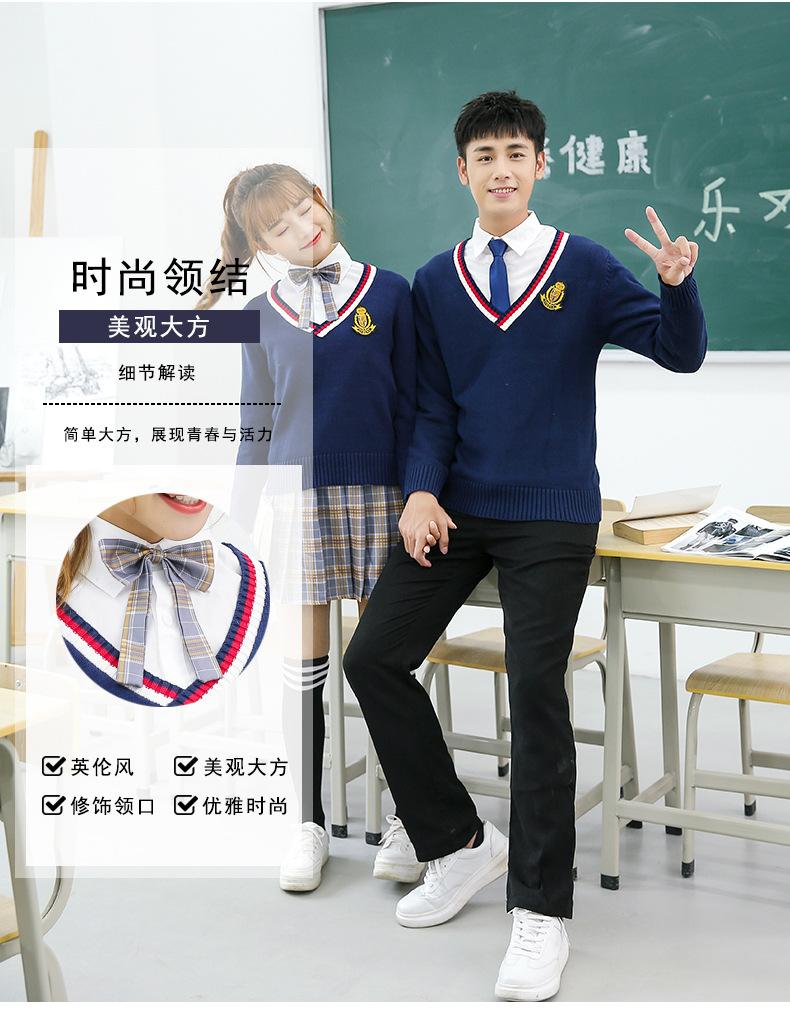Women's V Blue Sweater + Pure White Long Sleeve + Grey Yellow Lattice Skirt + Grey Yellow Lattice Tie, Men's V...