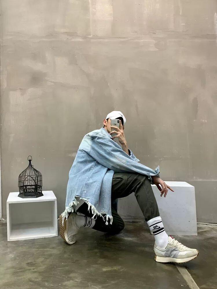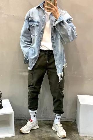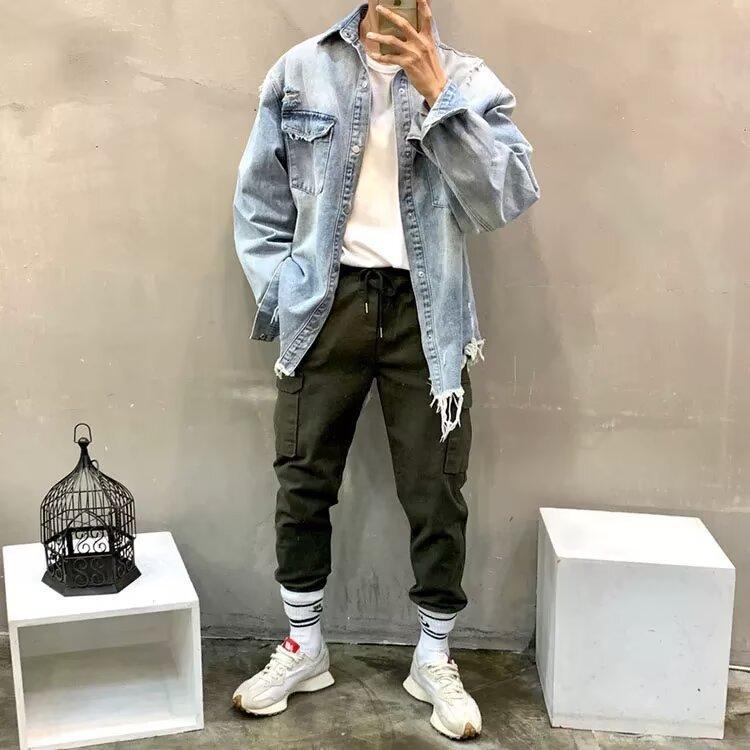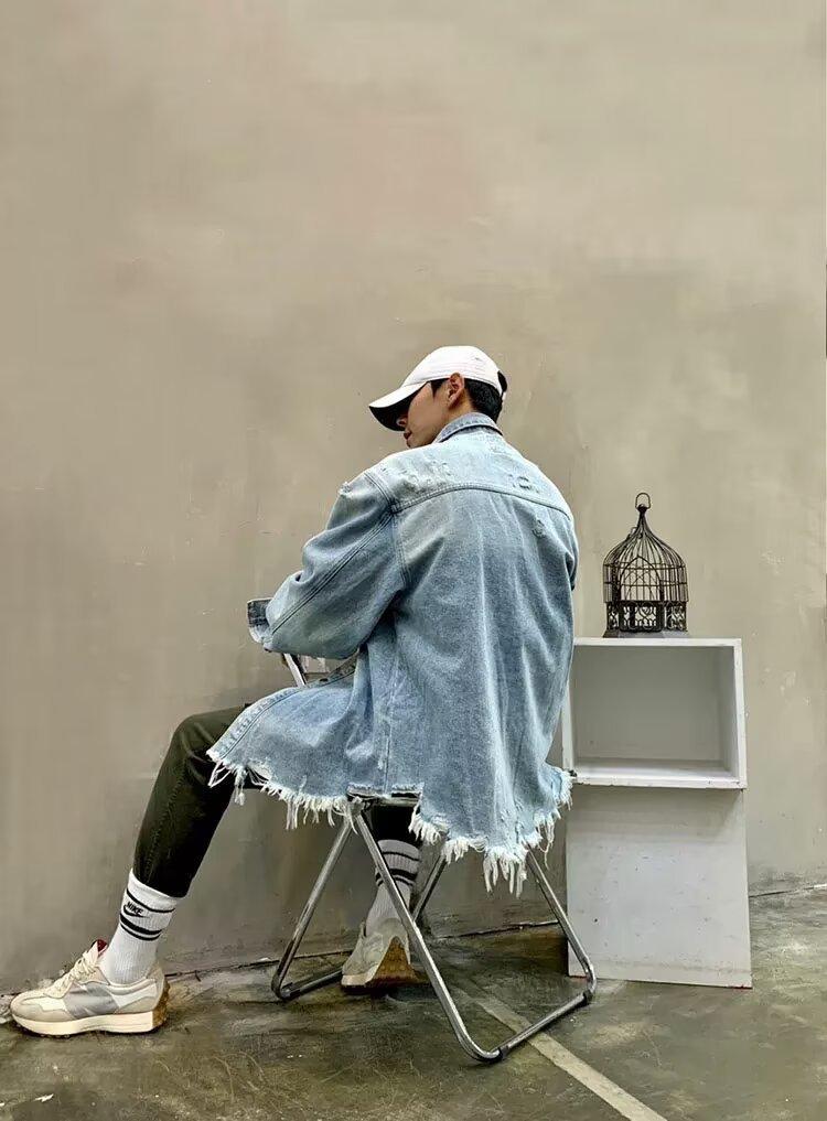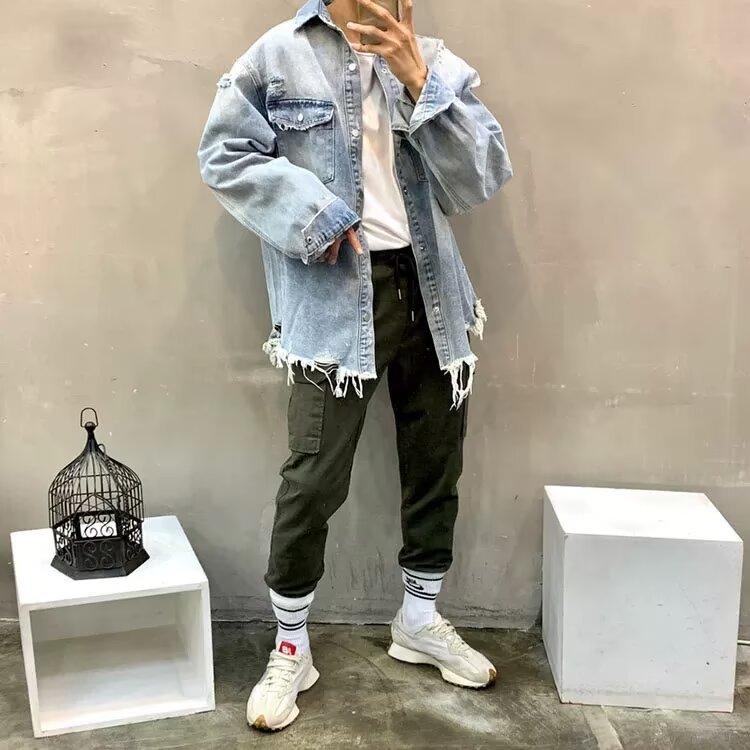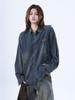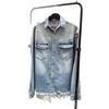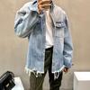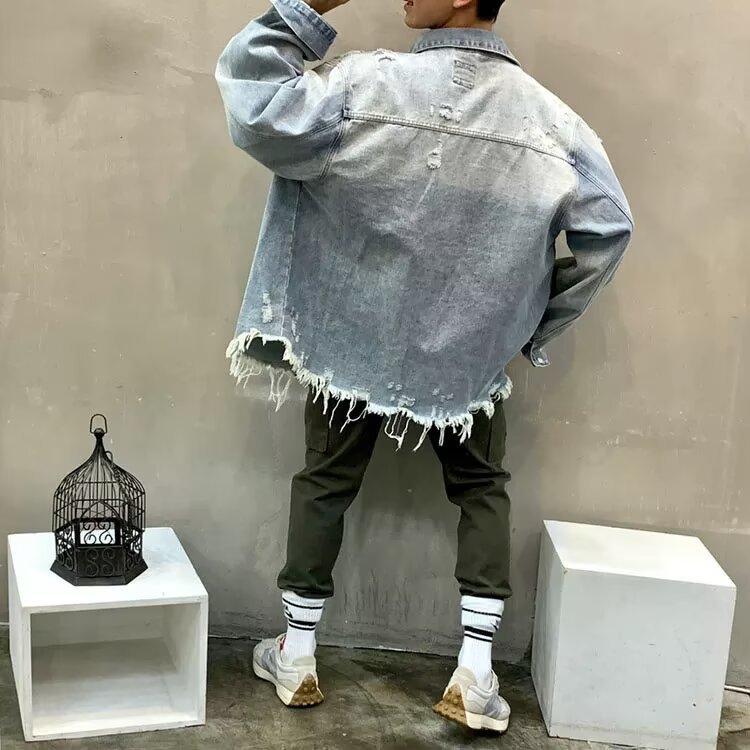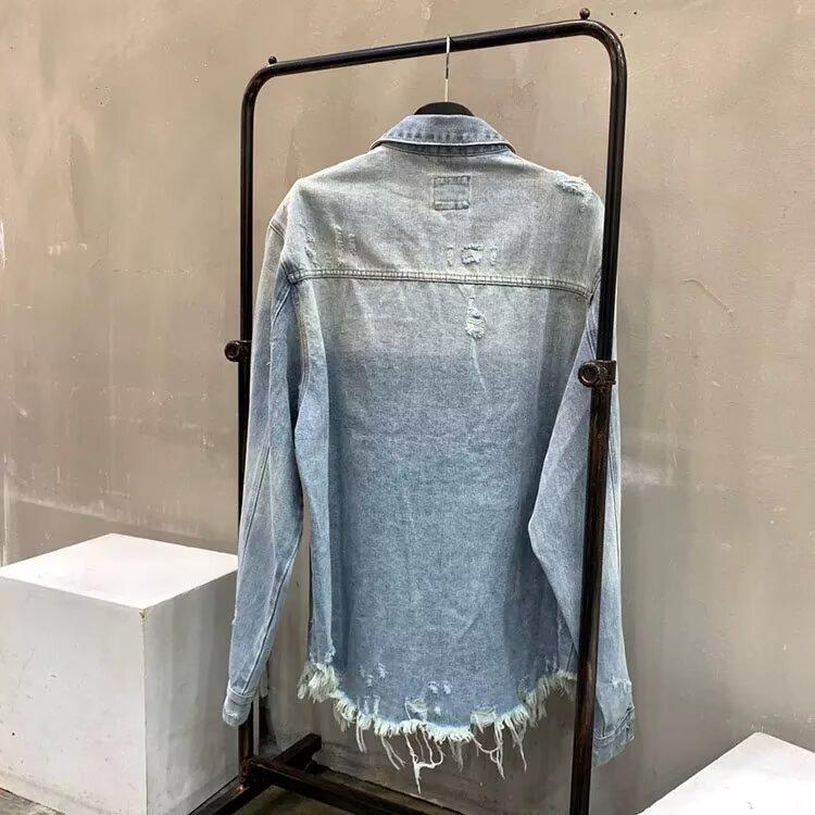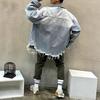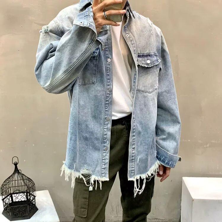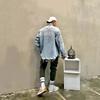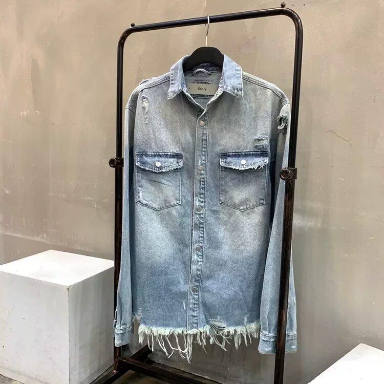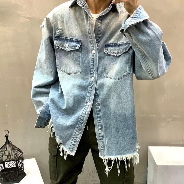 Chamarra de mezclilla de borde crudo retro americano para hombre y mujer, holgada de manga larga, moda versátil, marca de tendencia, camisa de mezclilla rasgada