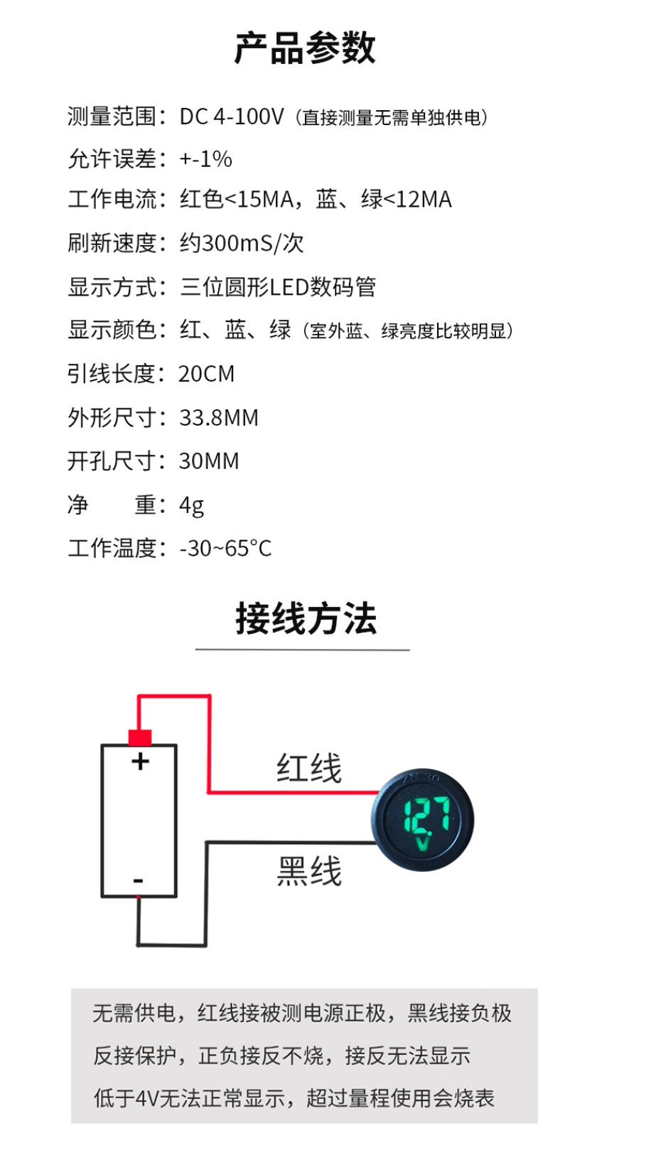 Cabezal Voltímetro Digital CC 4-100V CC Pantalla LED Pantalla Digital Voltímetro Redondo de Dos Hilos Protección contra Conexión Inversa