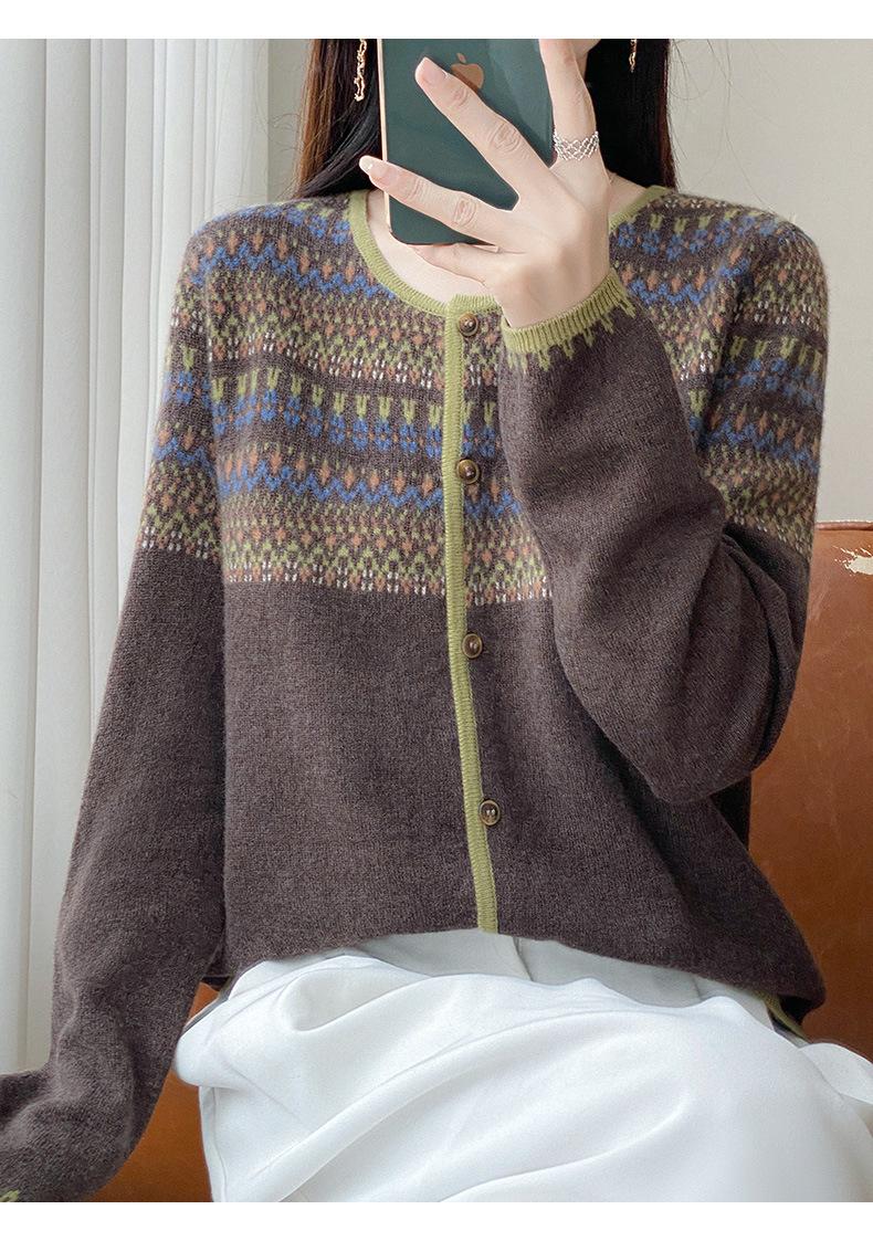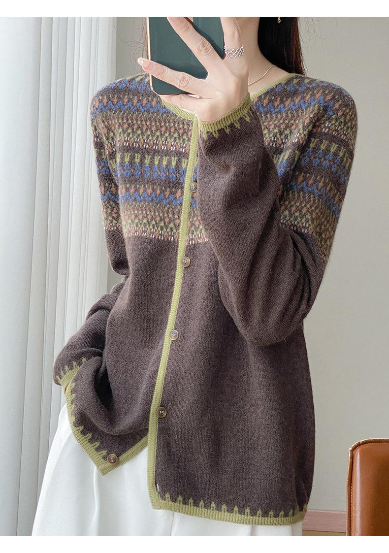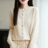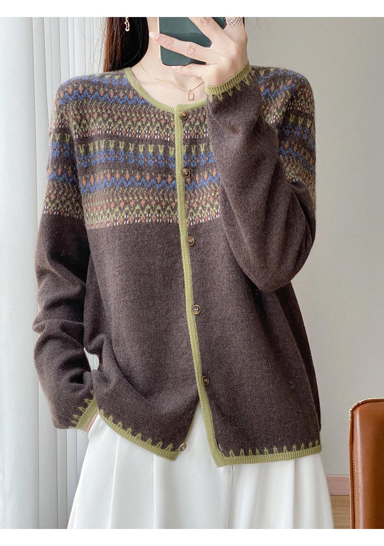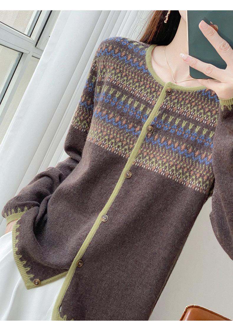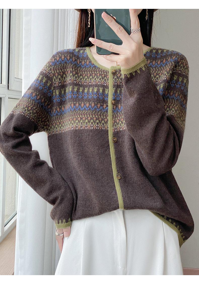 2025 Nuevo Cárdigan de Punto de Lana Pura con Cuello Redondo para Mujer, Bloque de Color, Manga Larga Holgada, Temperamento Casual, Abrigo Exterior de Botonadura Sencilla