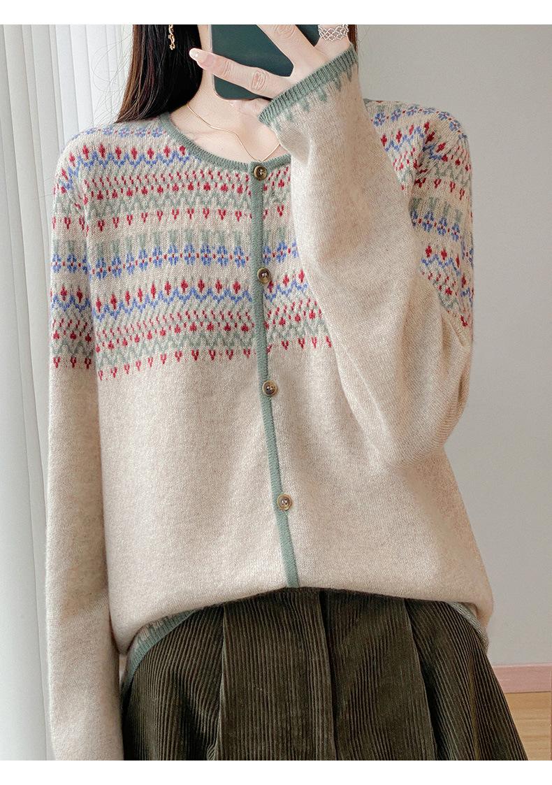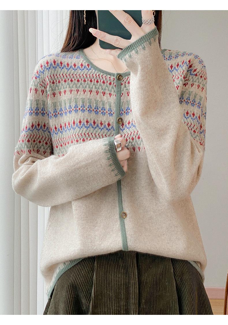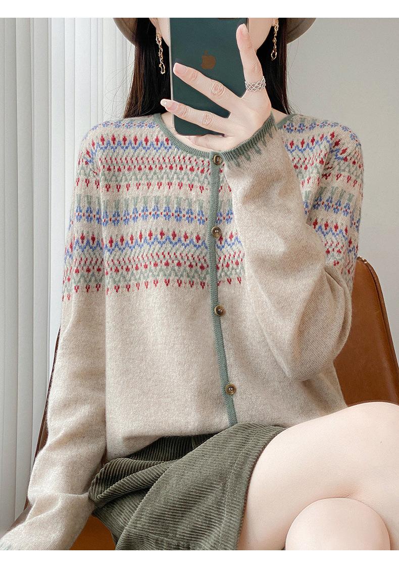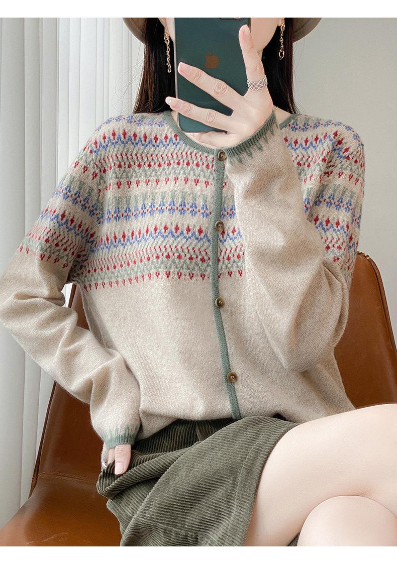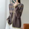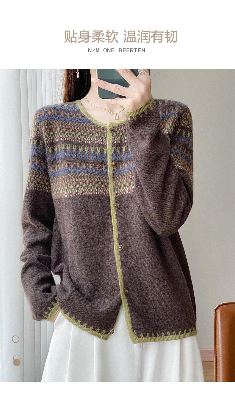 2025 Nuevo Cárdigan de Punto de Lana Pura con Cuello Redondo para Mujer, Bloque de Color, Manga Larga Holgada, Temperamento Casual, Abrigo Exterior de Botonadura Sencilla
