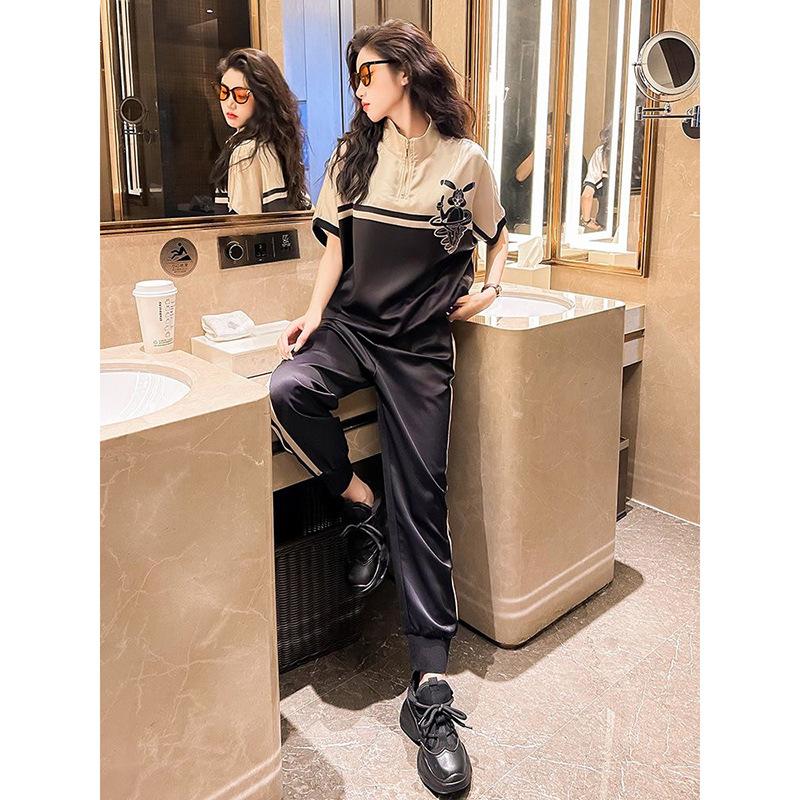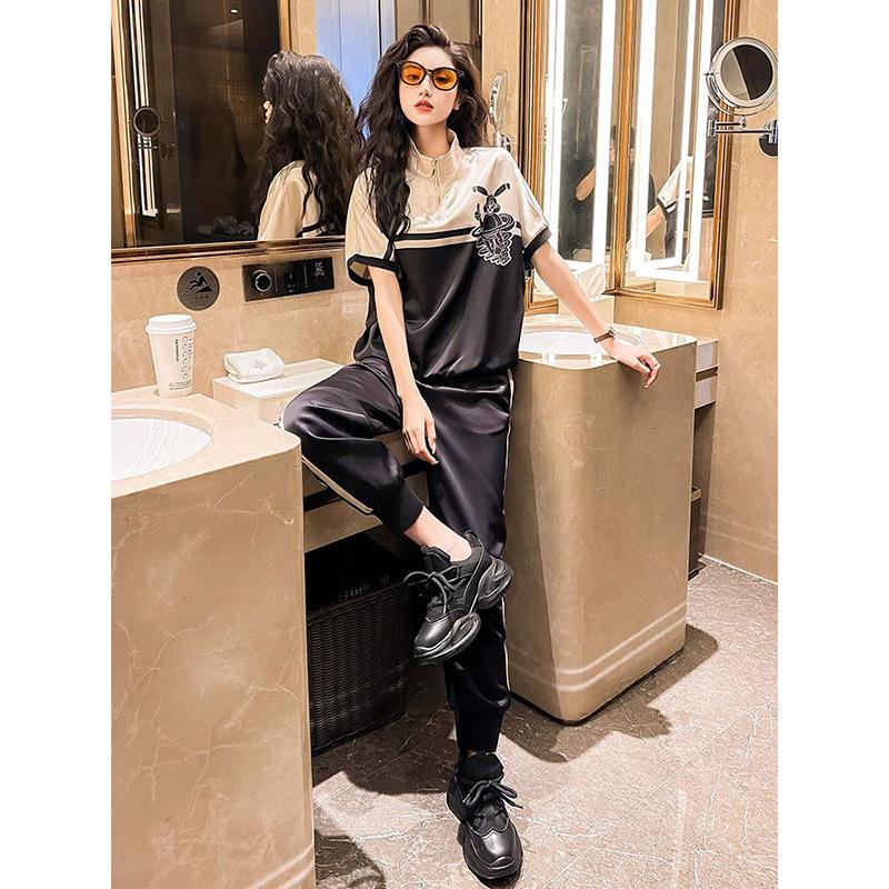 Verano 2025 Estilo Callejero Holgado y Relajado Camiseta de Manga Corta Tipo Murciélago de Alta Gama Pantalones Casuales Deportivos Traje de Dos Piezas para Mujer