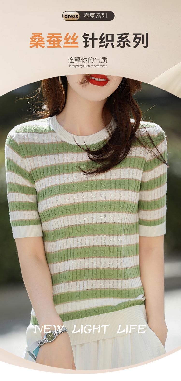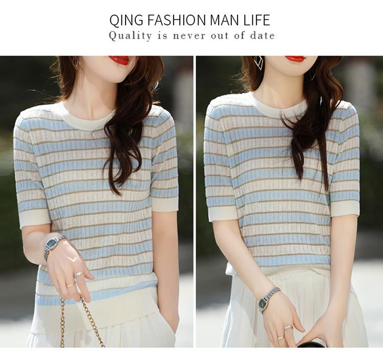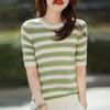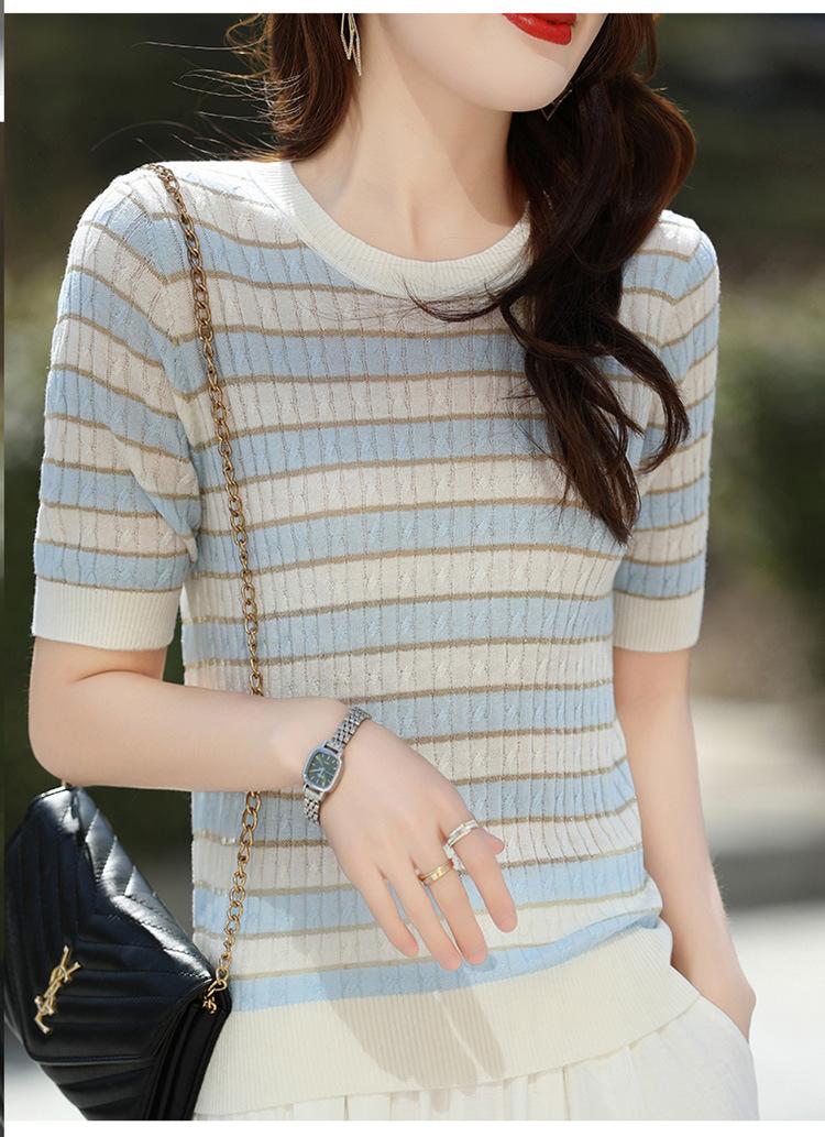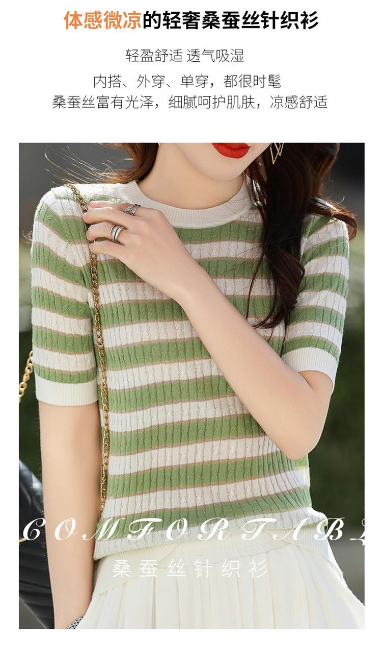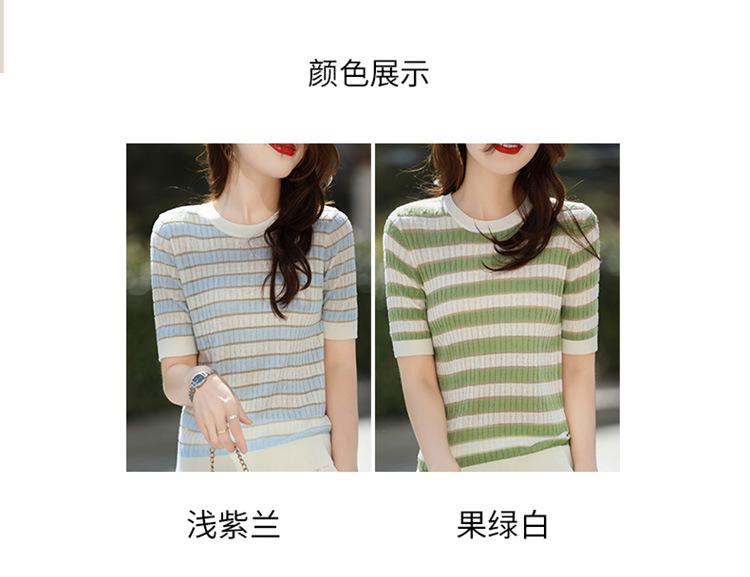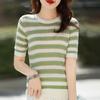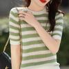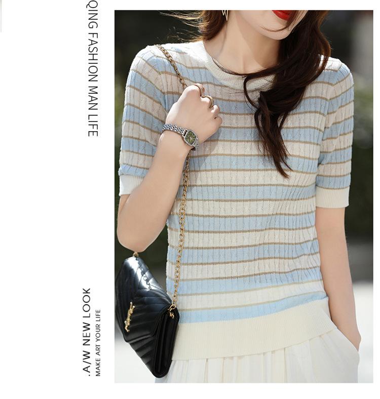 Suéter de Punto de Seda de Morera de Verano 2024 para Mujer, Camiseta de Manga Corta Fina Elegante con Raya de Color en Contraste Base