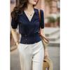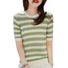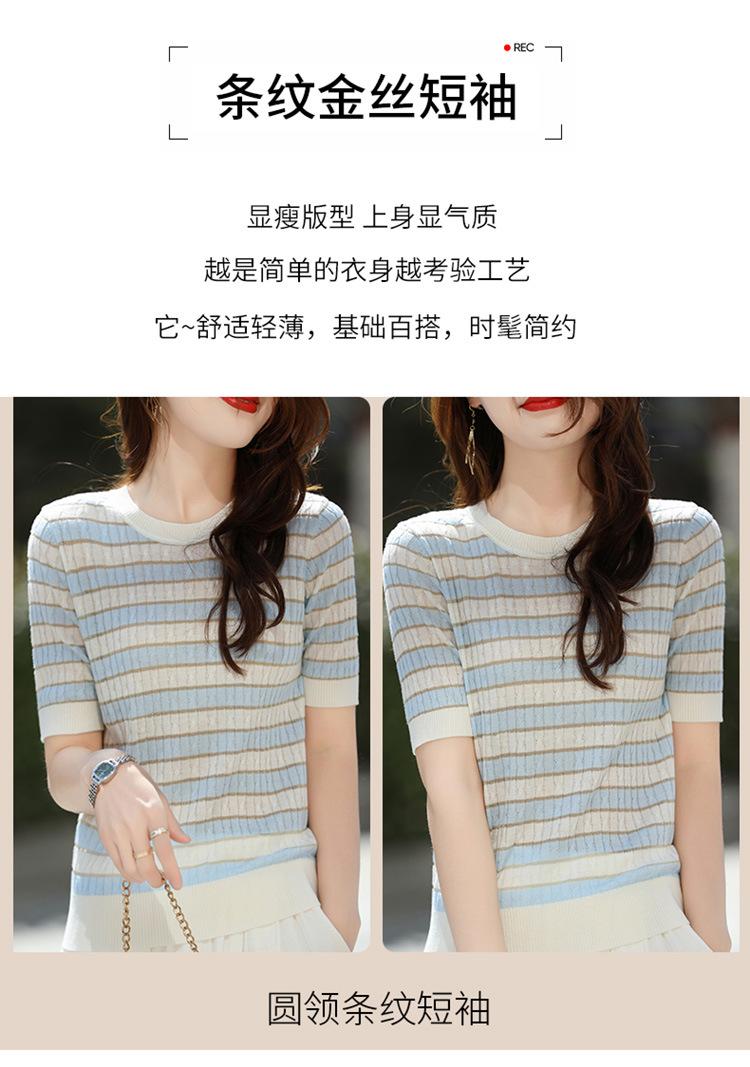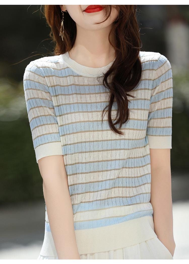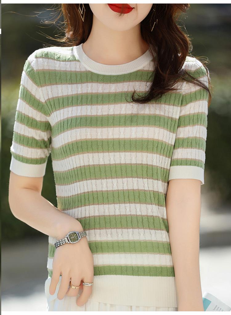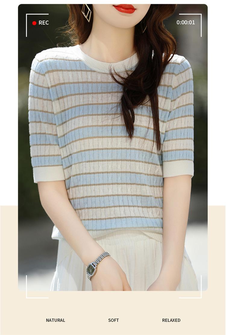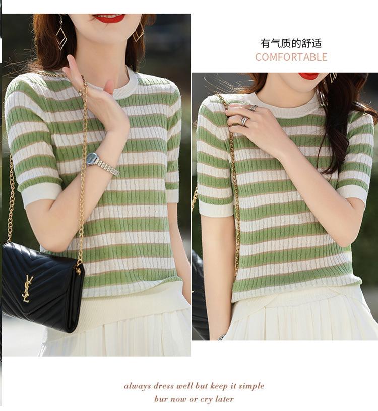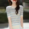 Suéter de Punto de Seda de Morera de Verano 2024 para Mujer, Camiseta de Manga Corta Fina Elegante con Raya de Color en Contraste Base