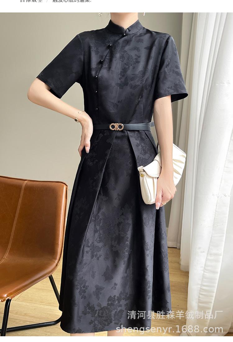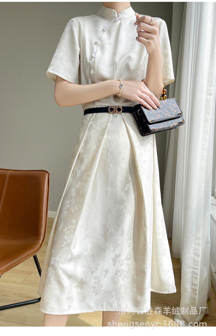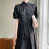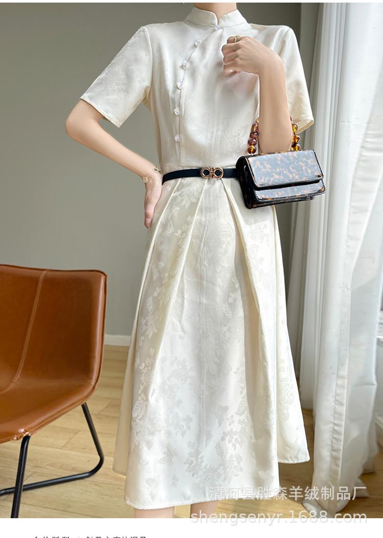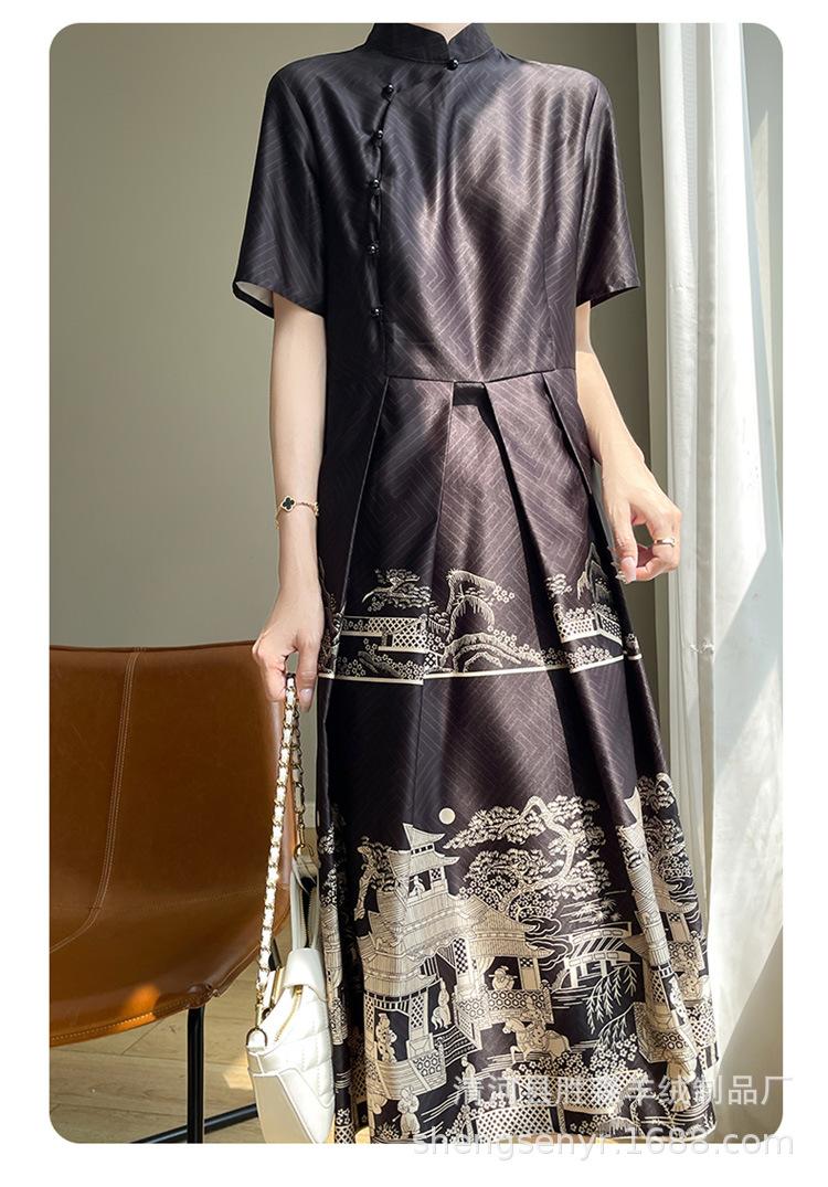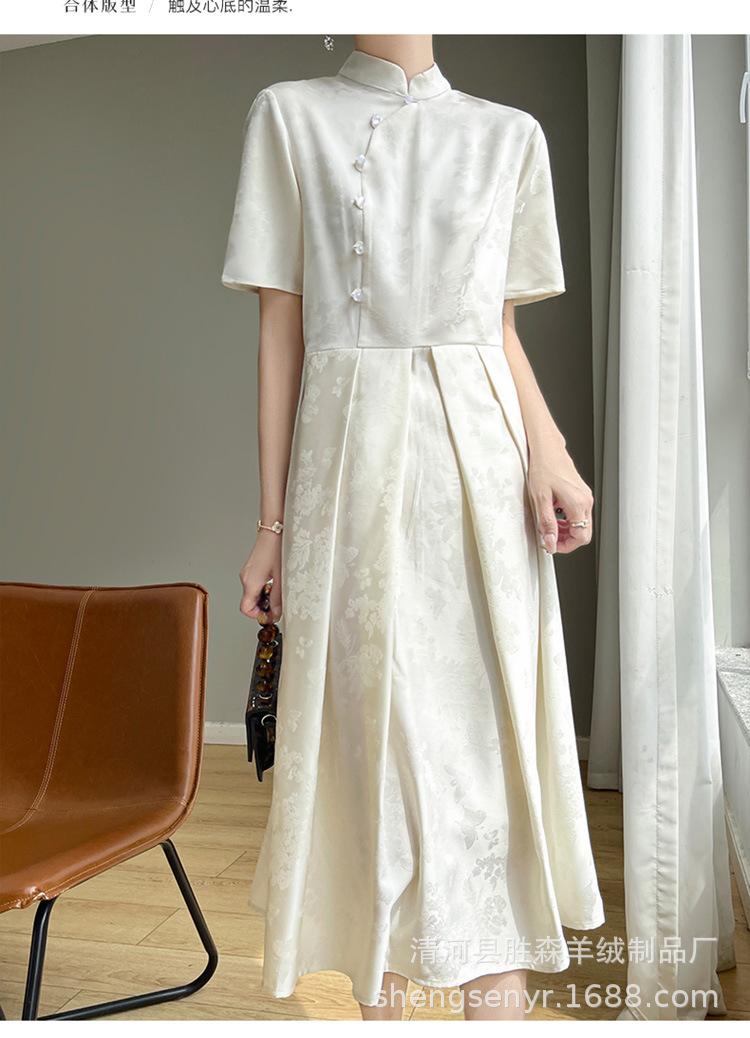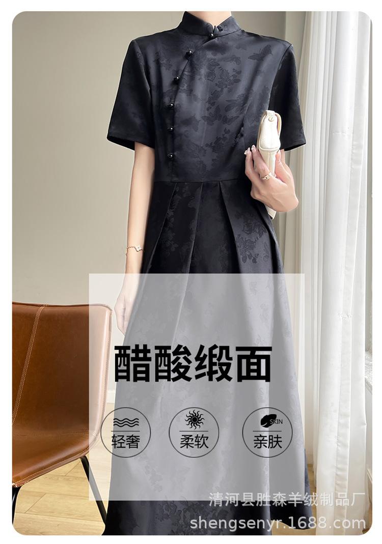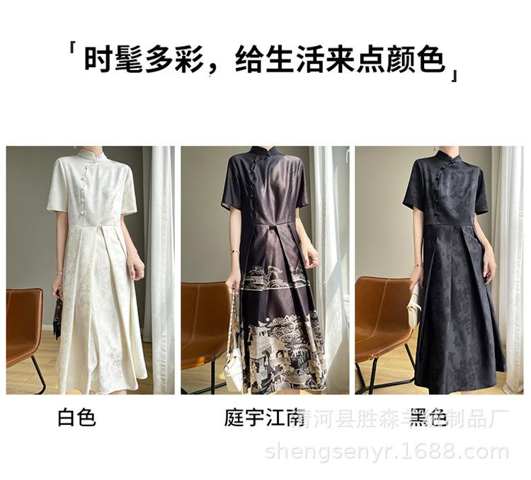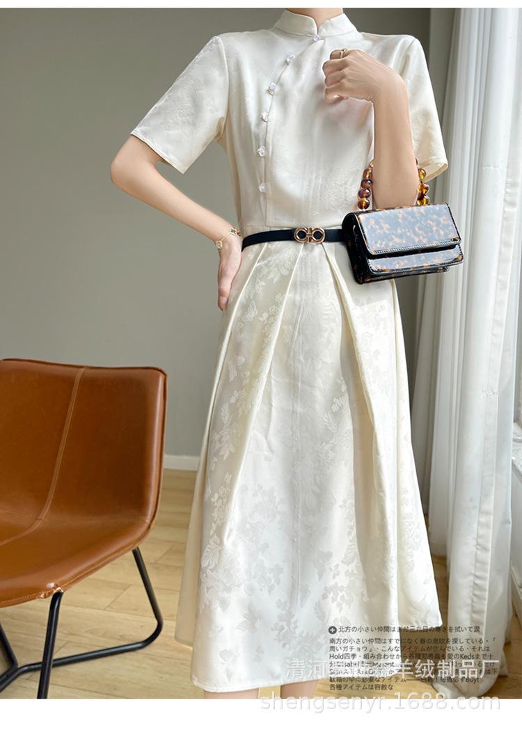 24 Verano Nuevo Estilo Chino Estilo Nacional Cuello Vertical Satén Jacquard vestido Hebilla Swl Manga Corta Vestido Midi Elegante