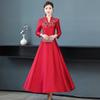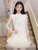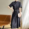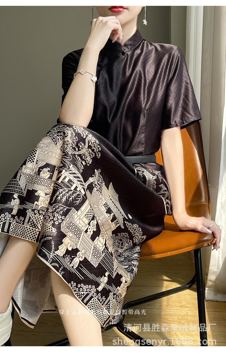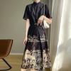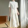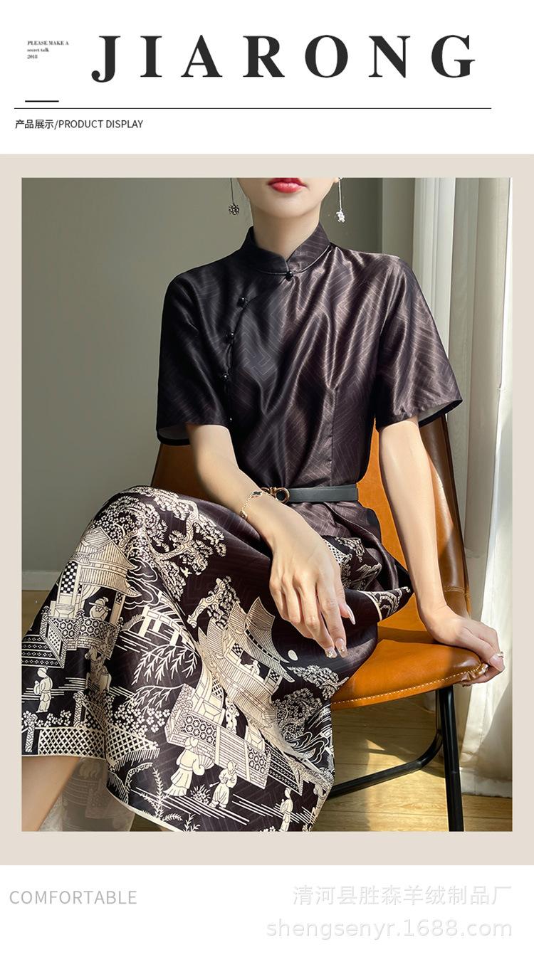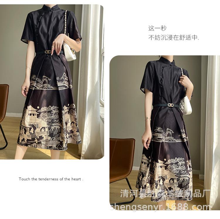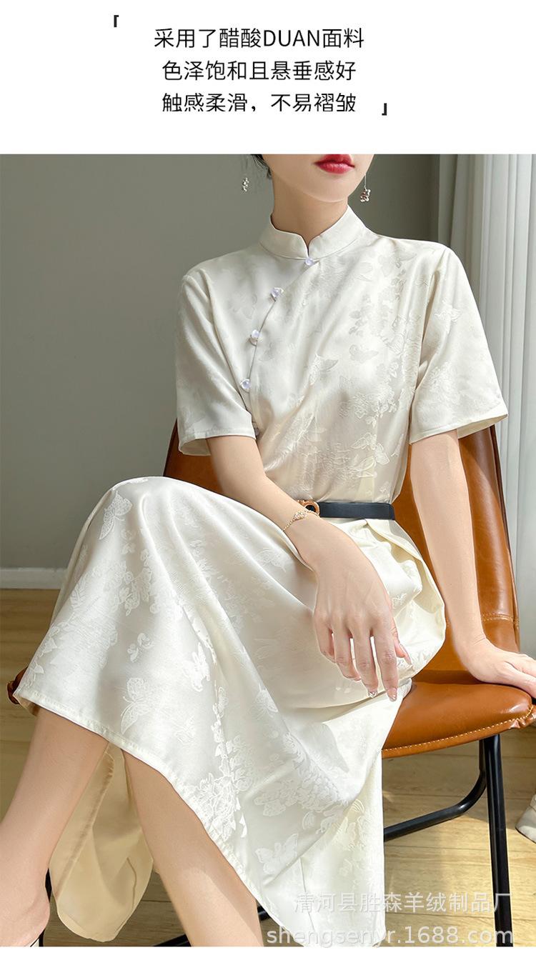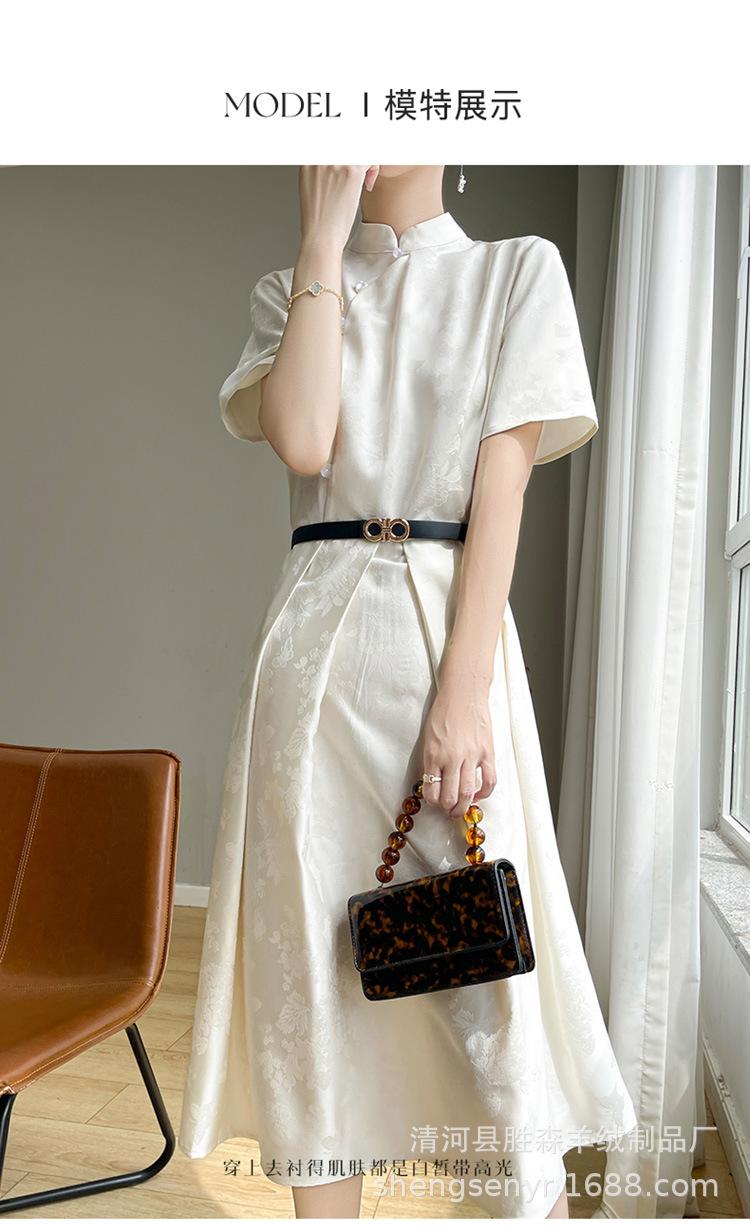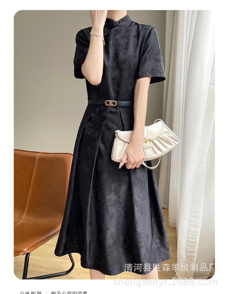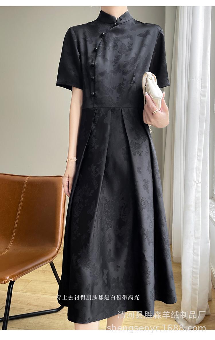 24 Verano Nuevo Estilo Chino Estilo Nacional Cuello Vertical Satén Jacquard vestido Hebilla Swl Manga Corta Vestido Midi Elegante