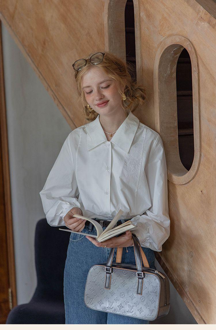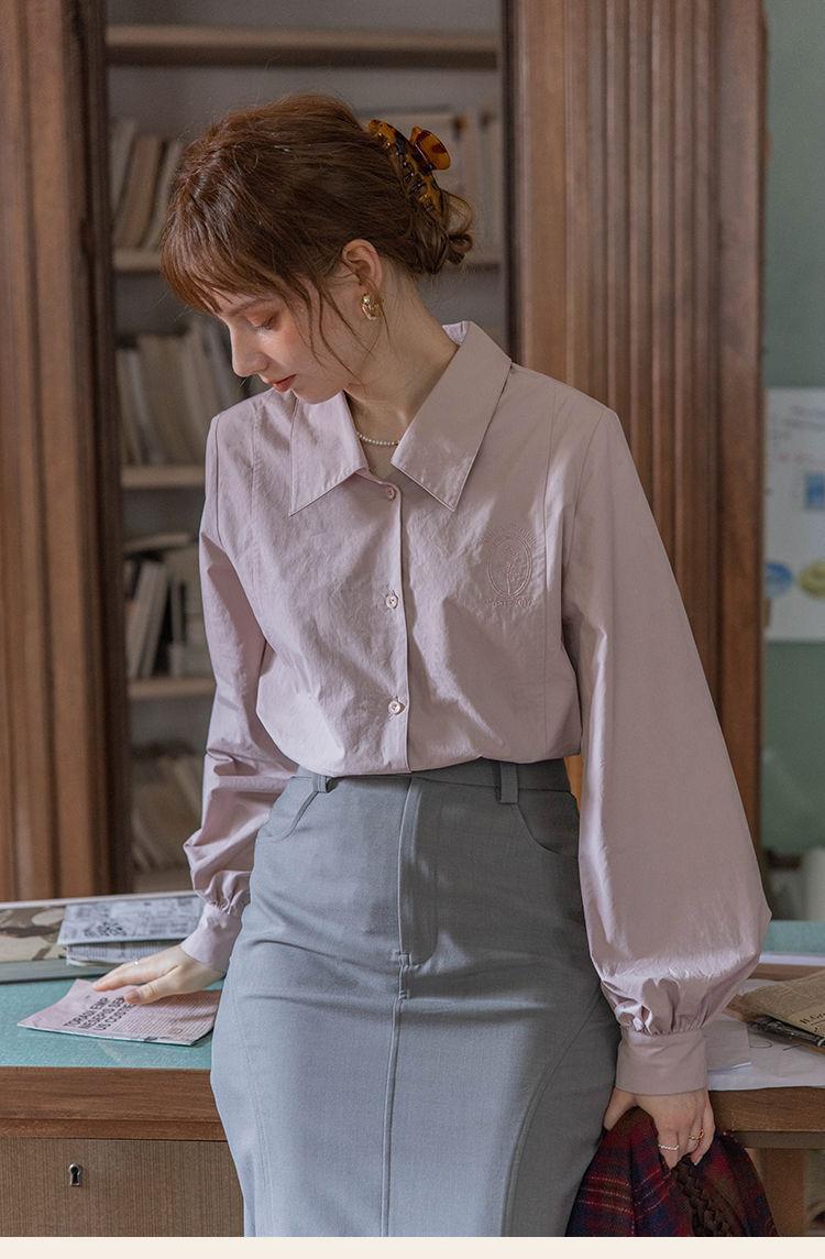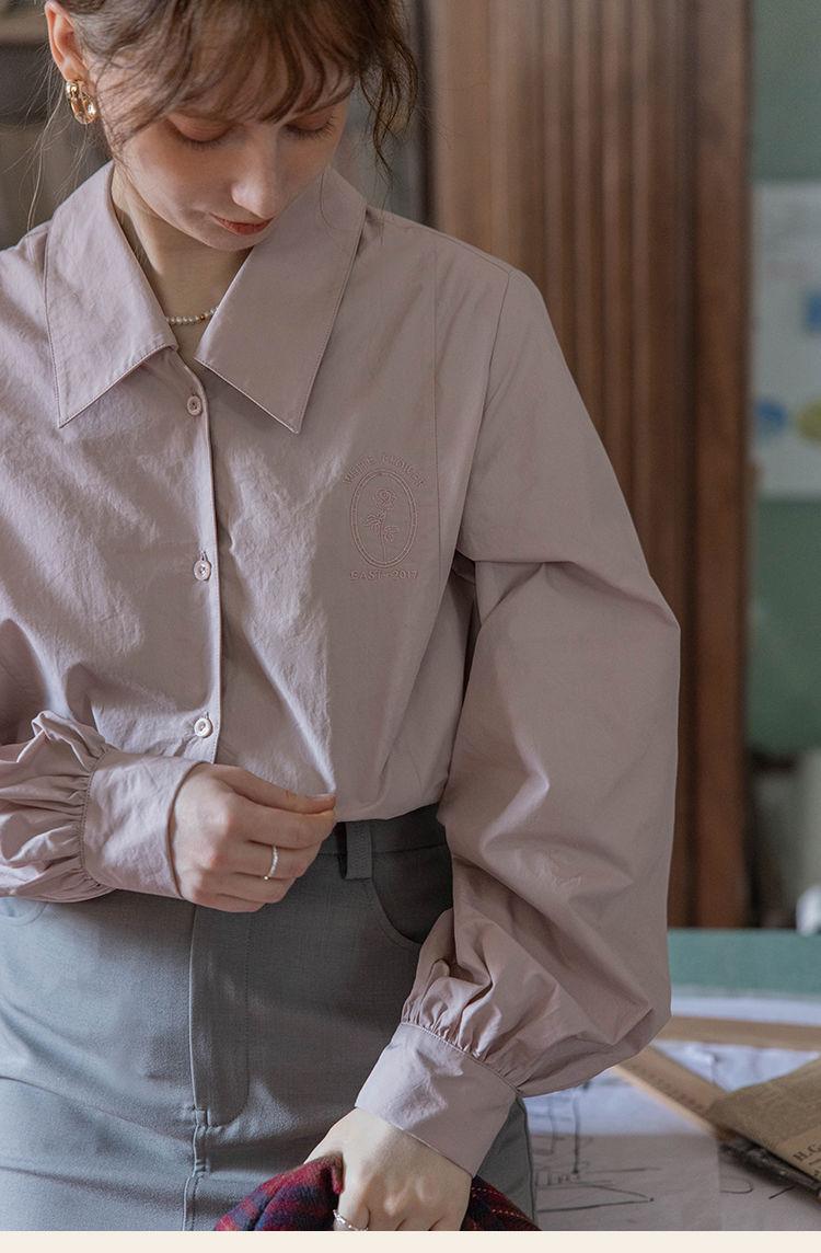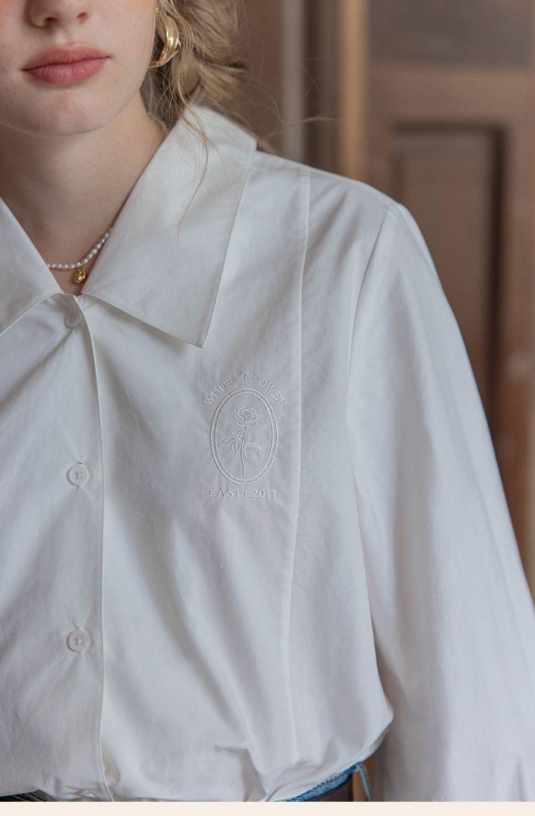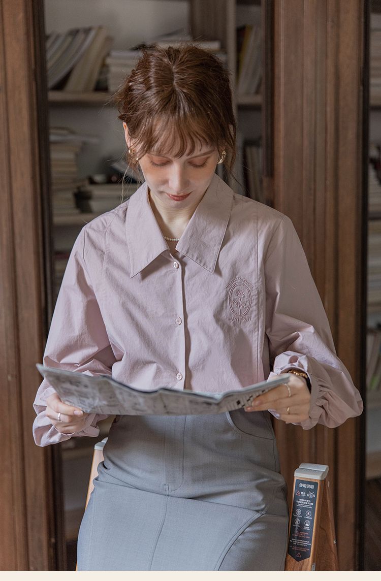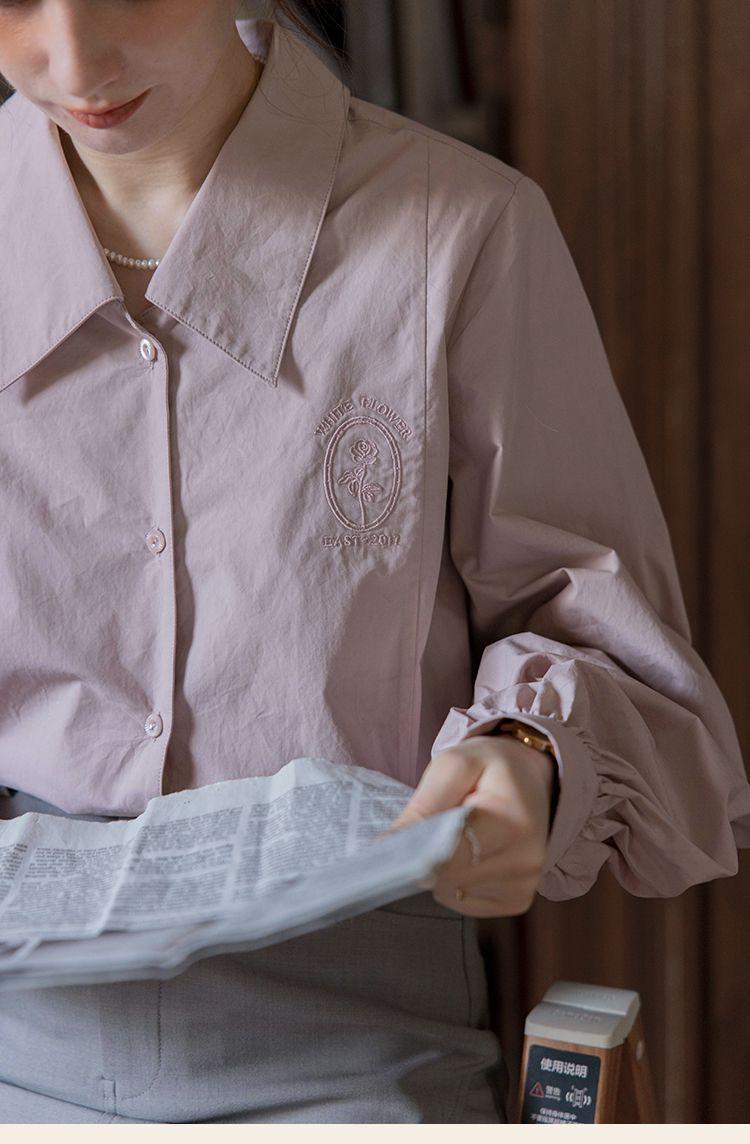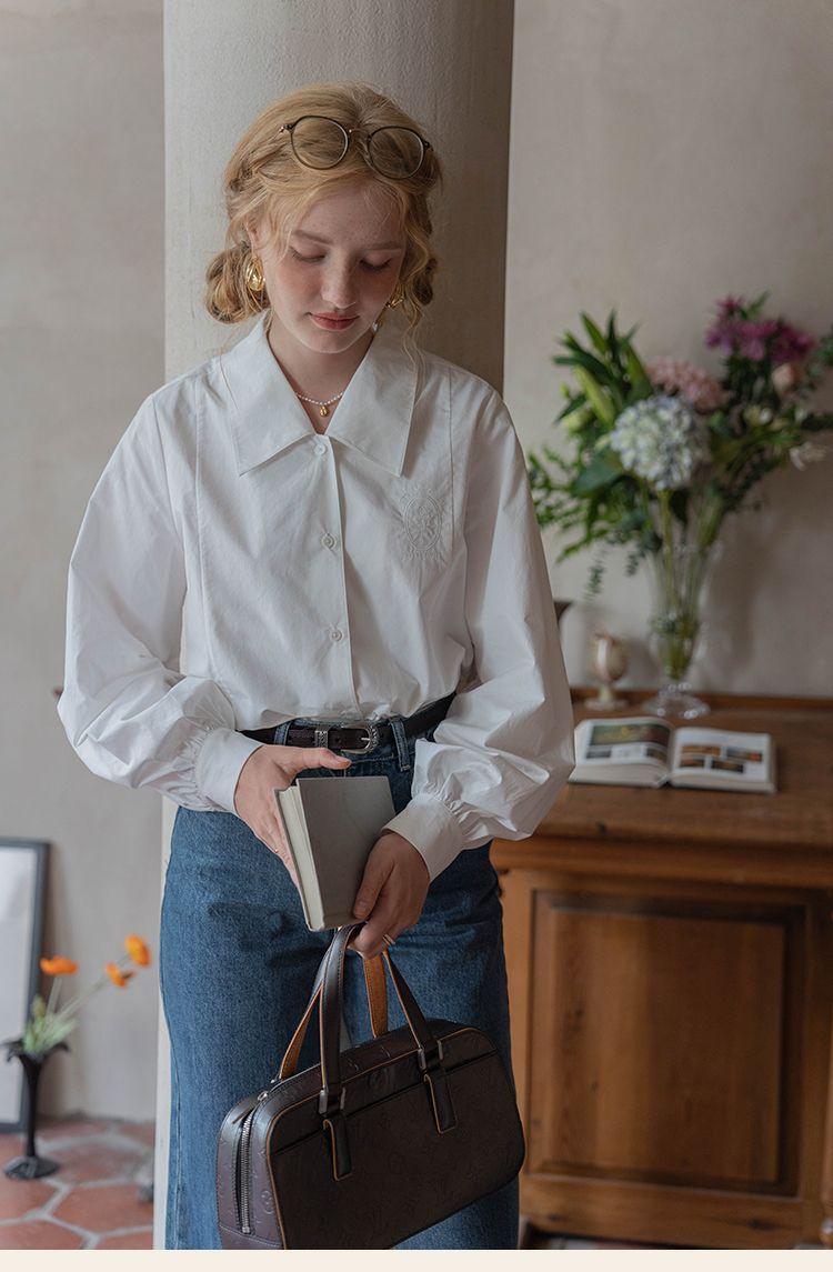 Camisa de Bordado Tridimensional de Rosa Shanlidaidi para Mujer de Manga Larga Retro Francés Simple para Ir al Trabajo Diseño Versátil Holgado