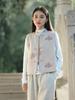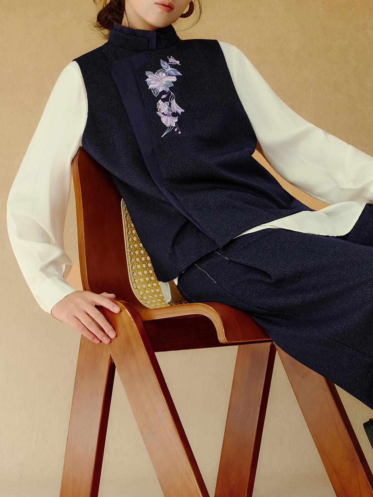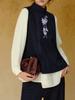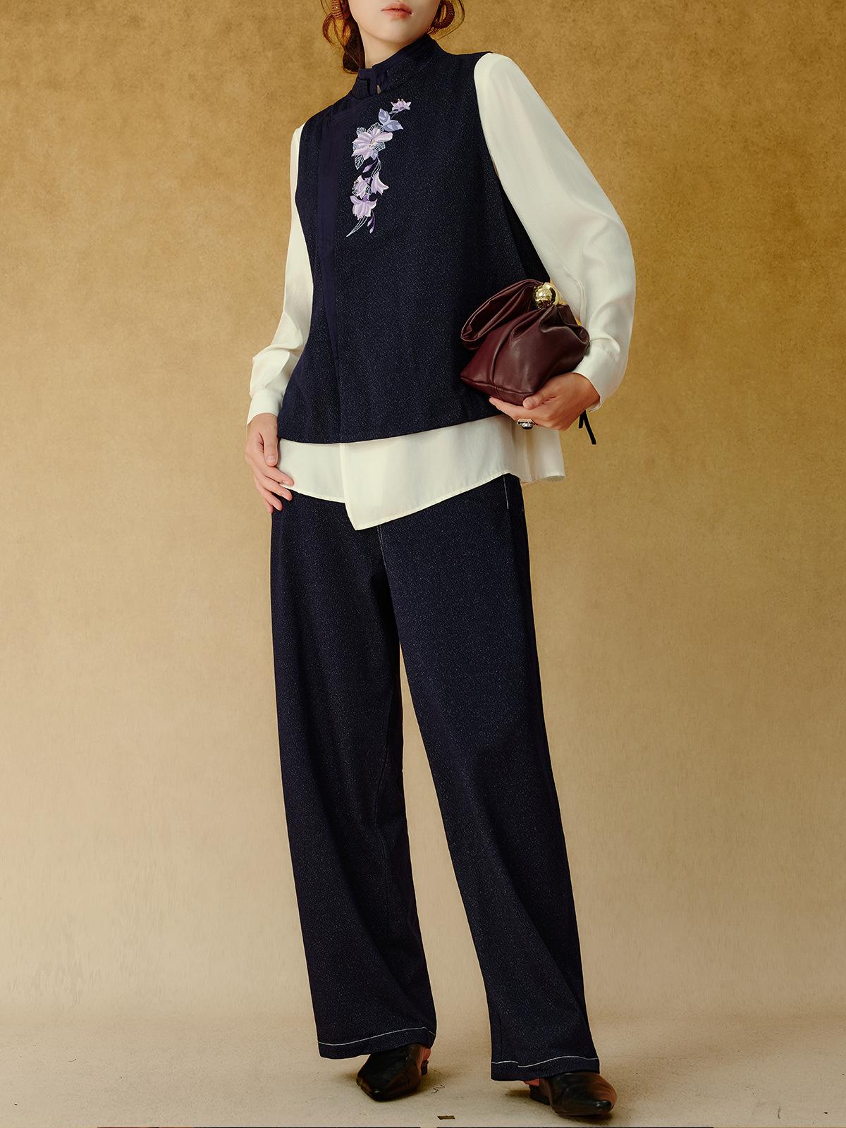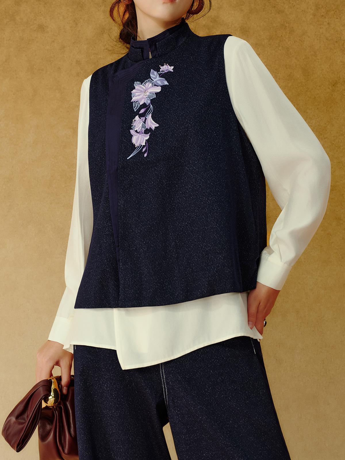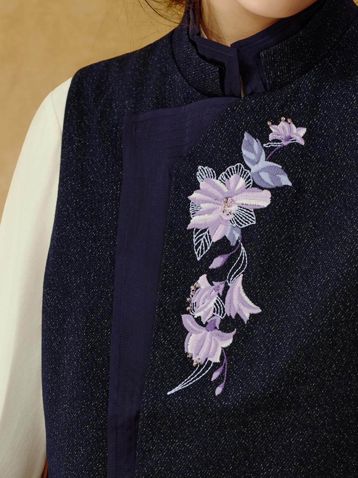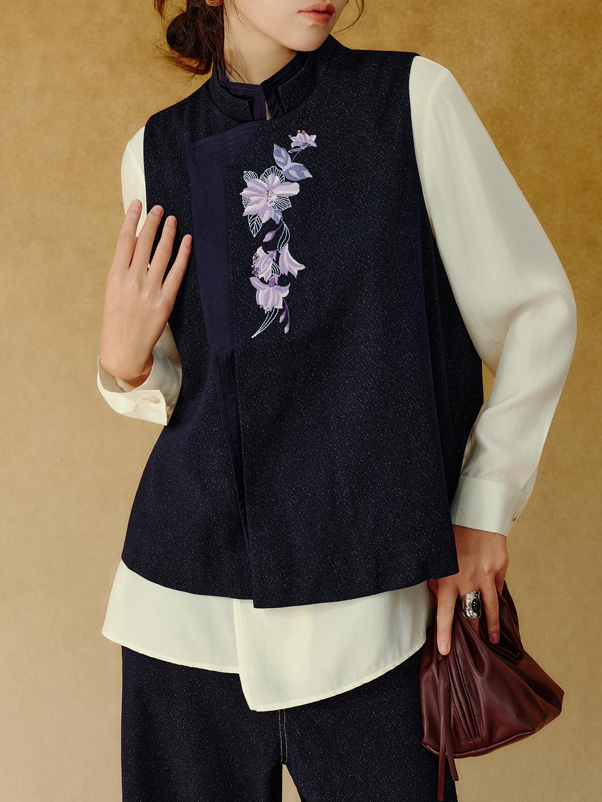 Chaleco de mezclilla elástica de cuello alto estilo chino nuevo para mujer 2025 estilo chino vintage bordado a mano sin mangas tank top