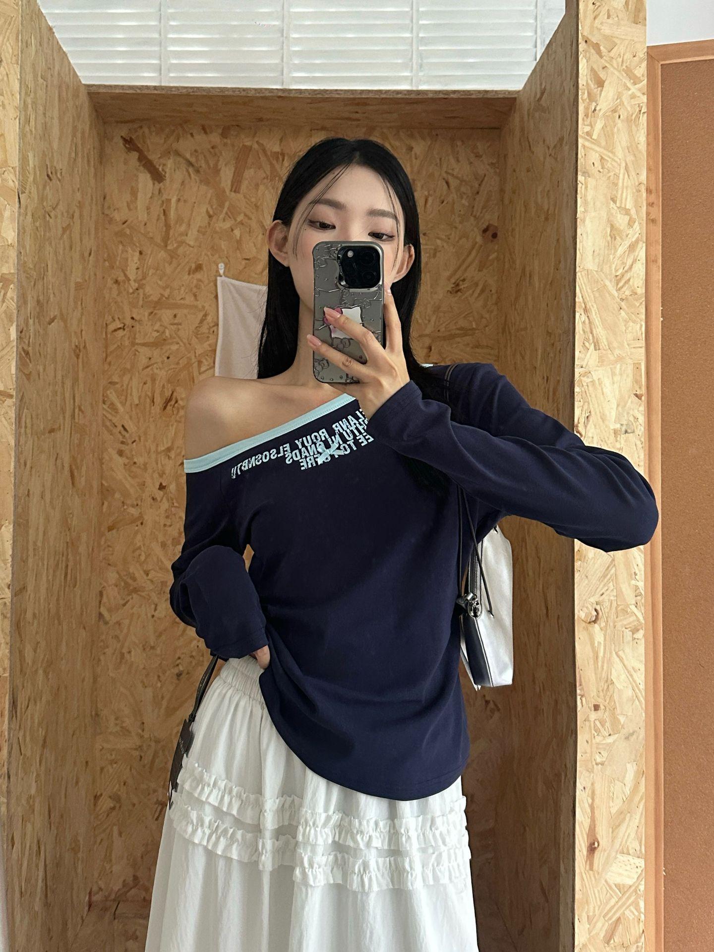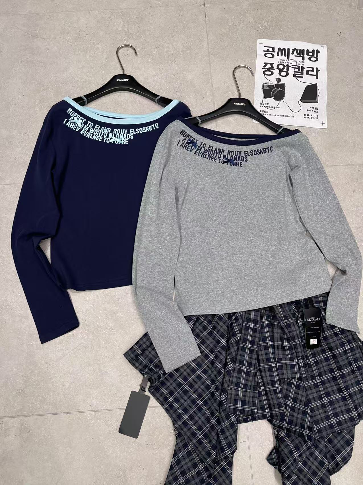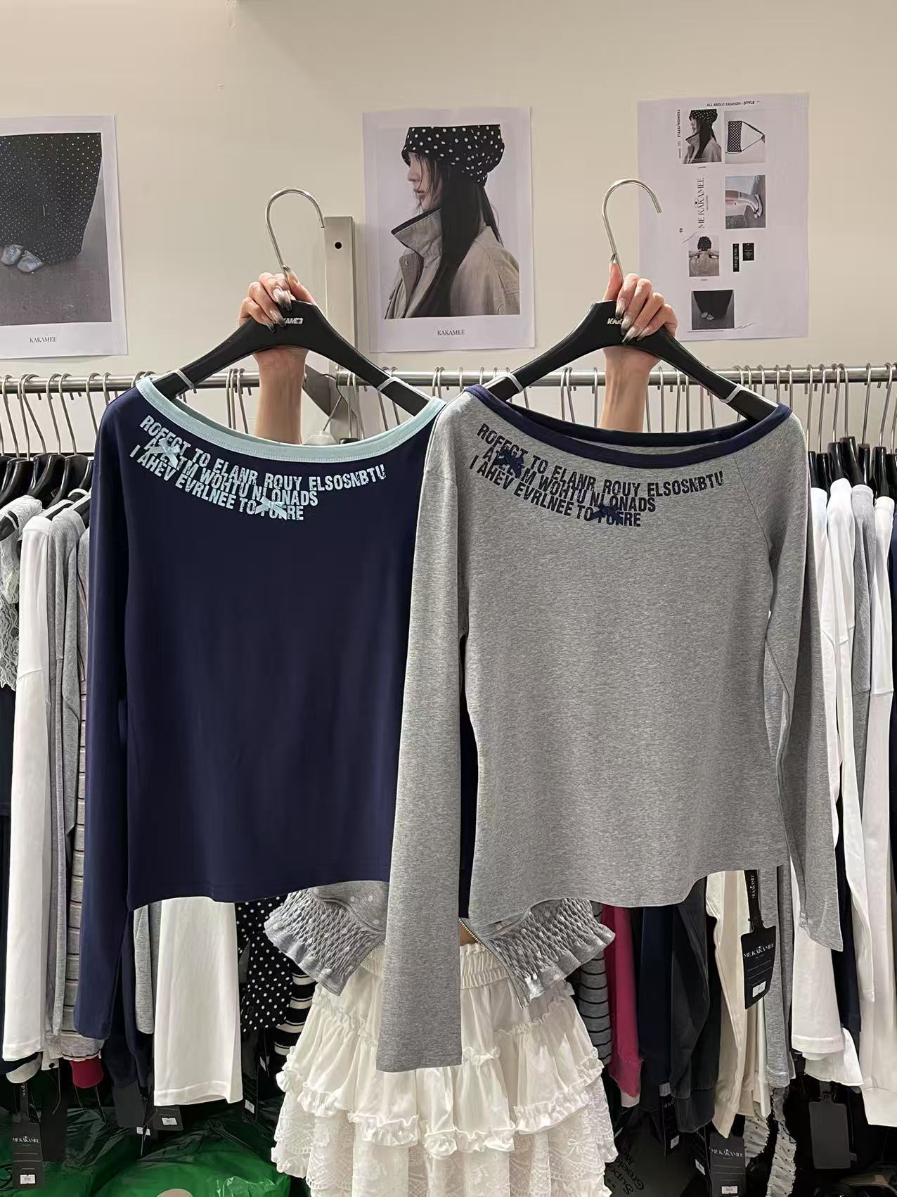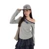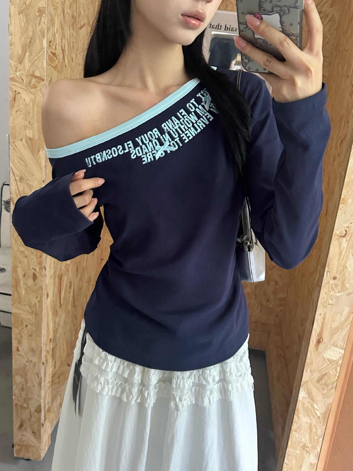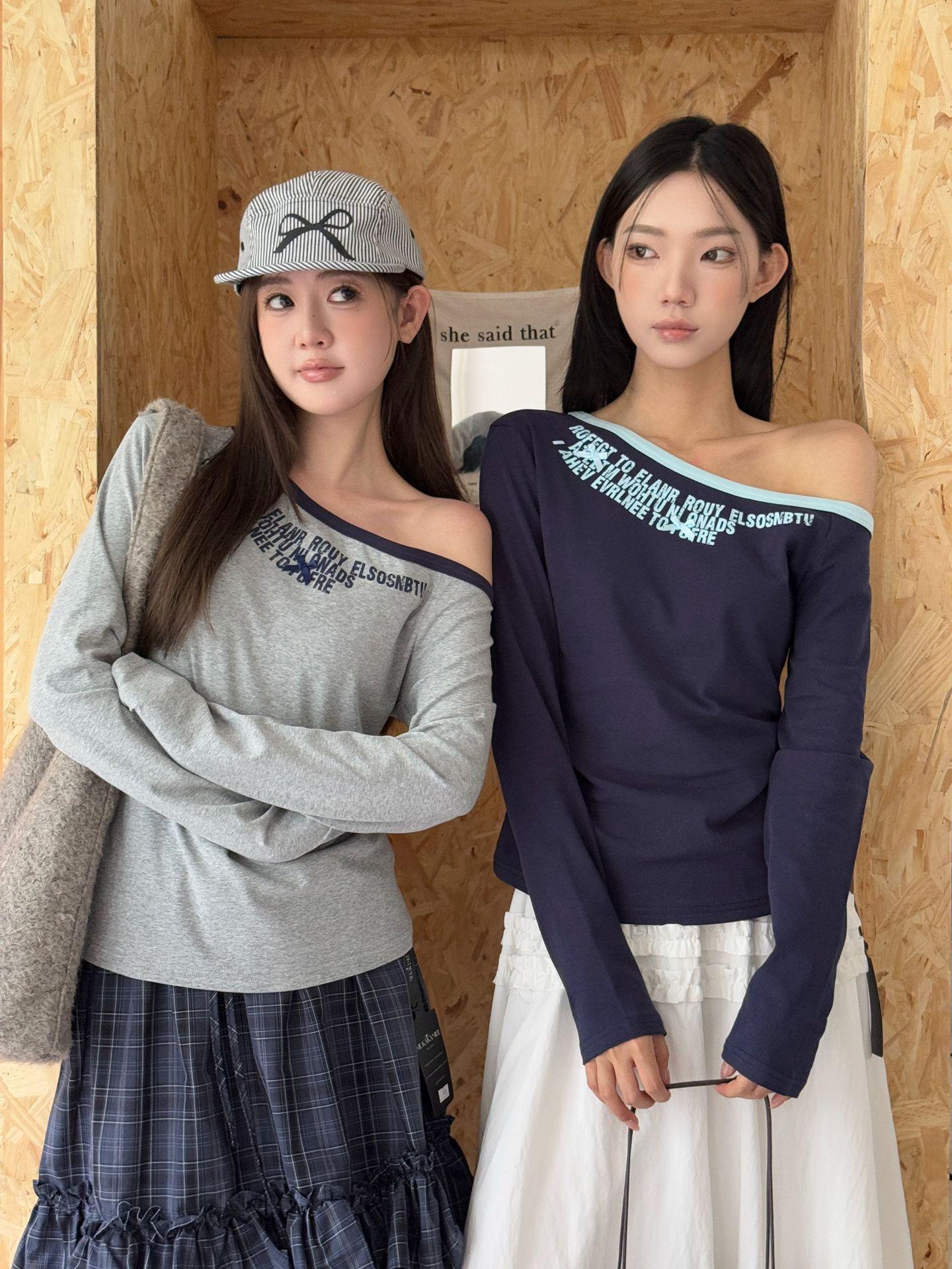 ME KAKAMEE Trece Líneas Otoño Dulce Cool Graffiti Letra Bloque de Color Un Hombro Elástico Versión Pequeña Camiseta de Manga Larga Han 8856