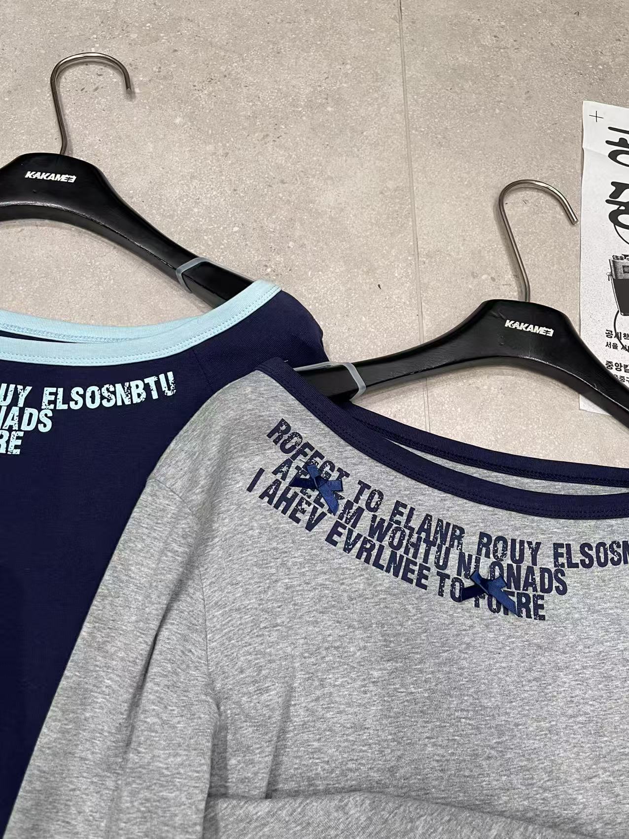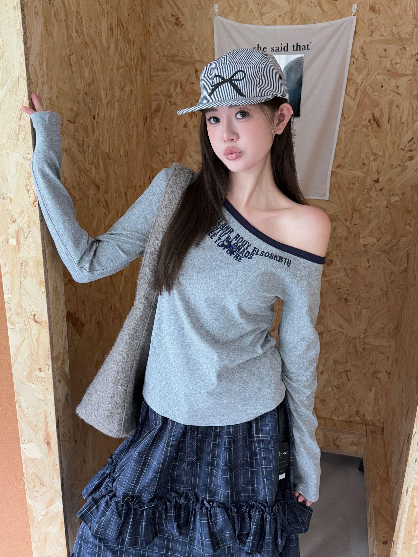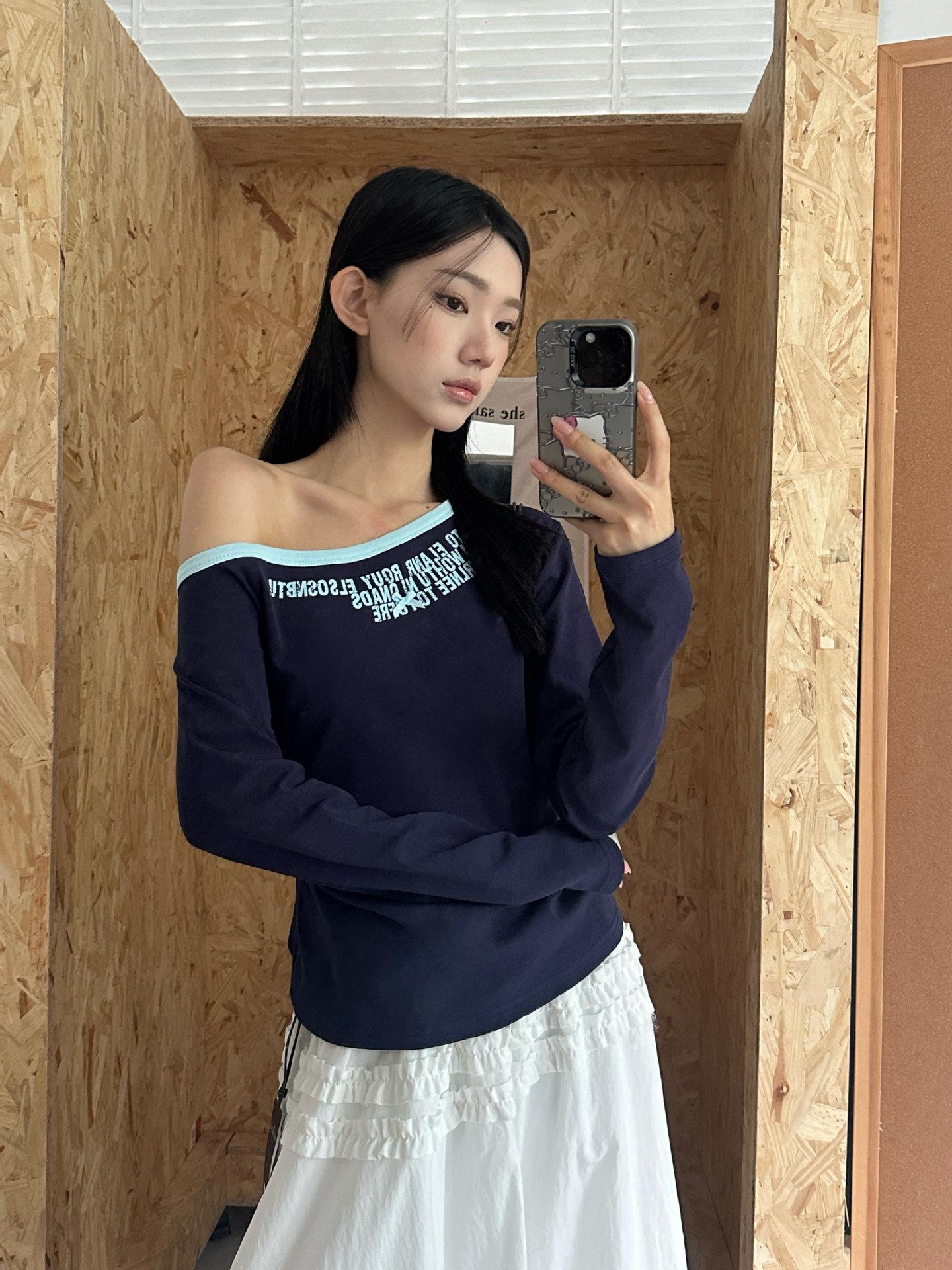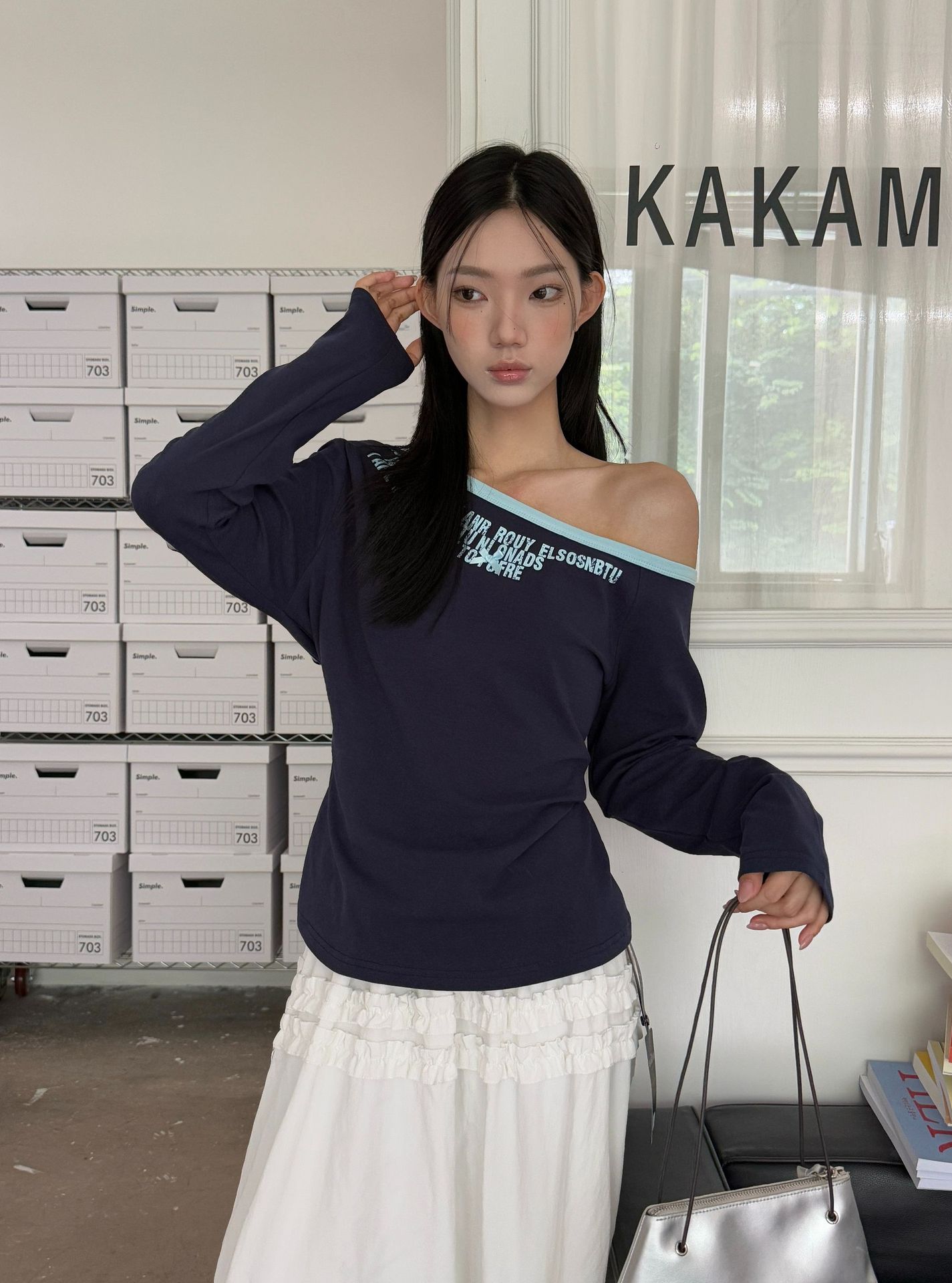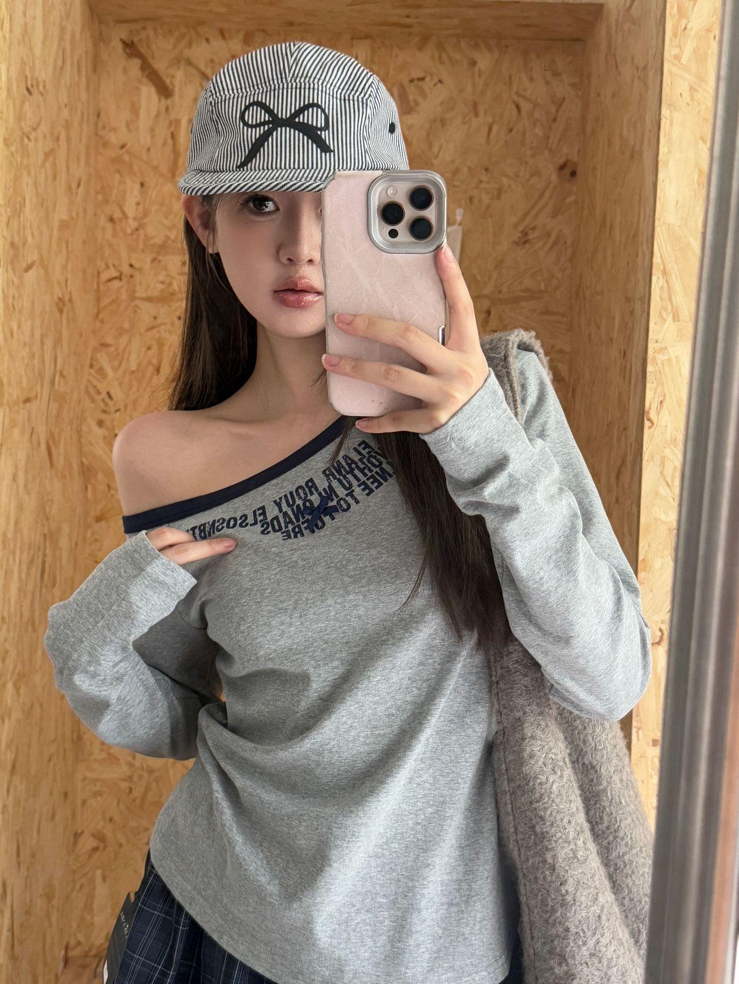 ME KAKAMEE Trece Líneas Otoño Dulce Cool Graffiti Letra Bloque de Color Un Hombro Elástico Versión Pequeña Camiseta de Manga Larga Han 8856