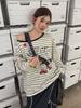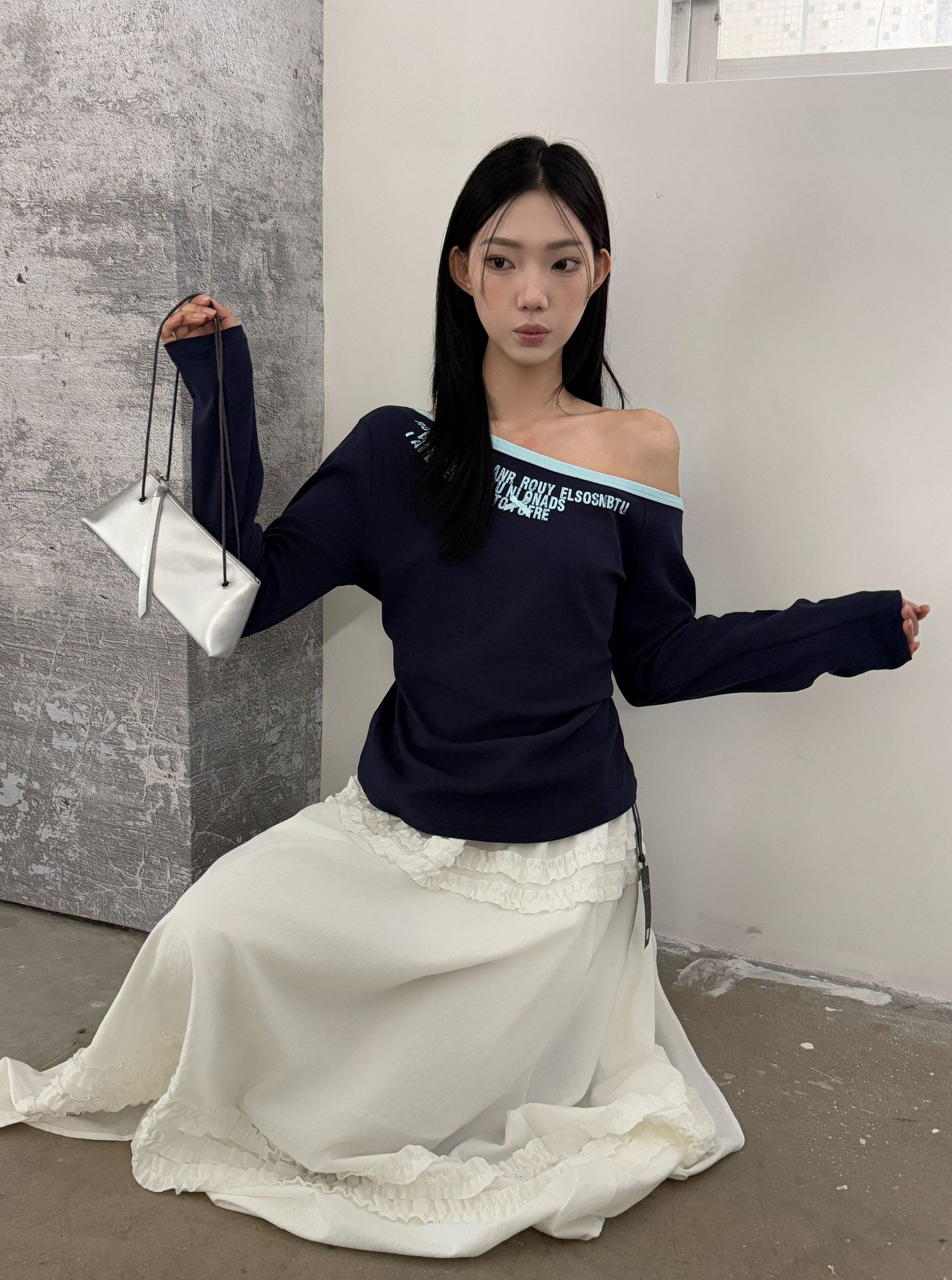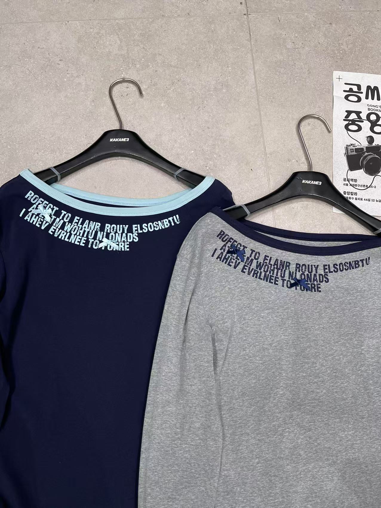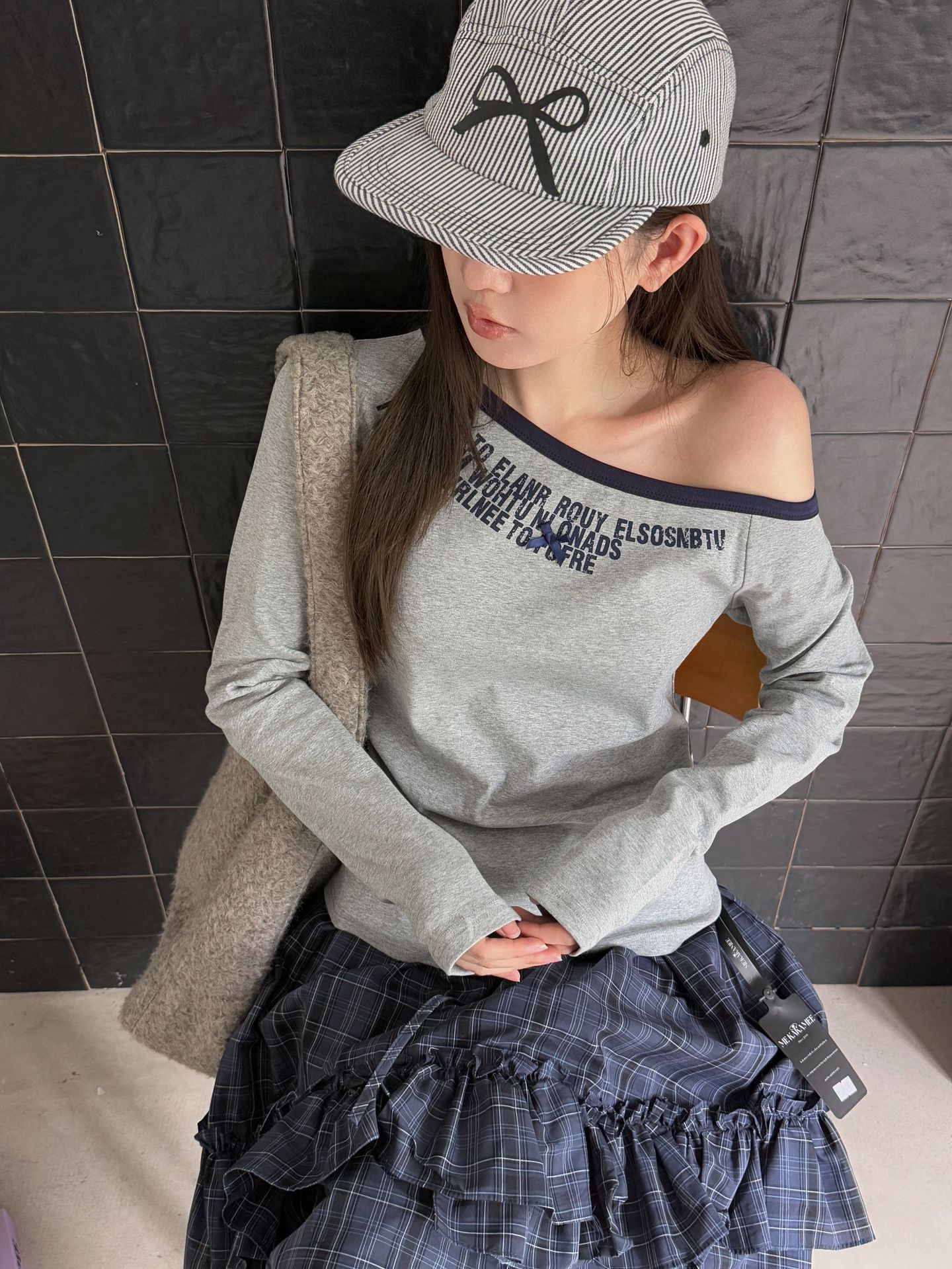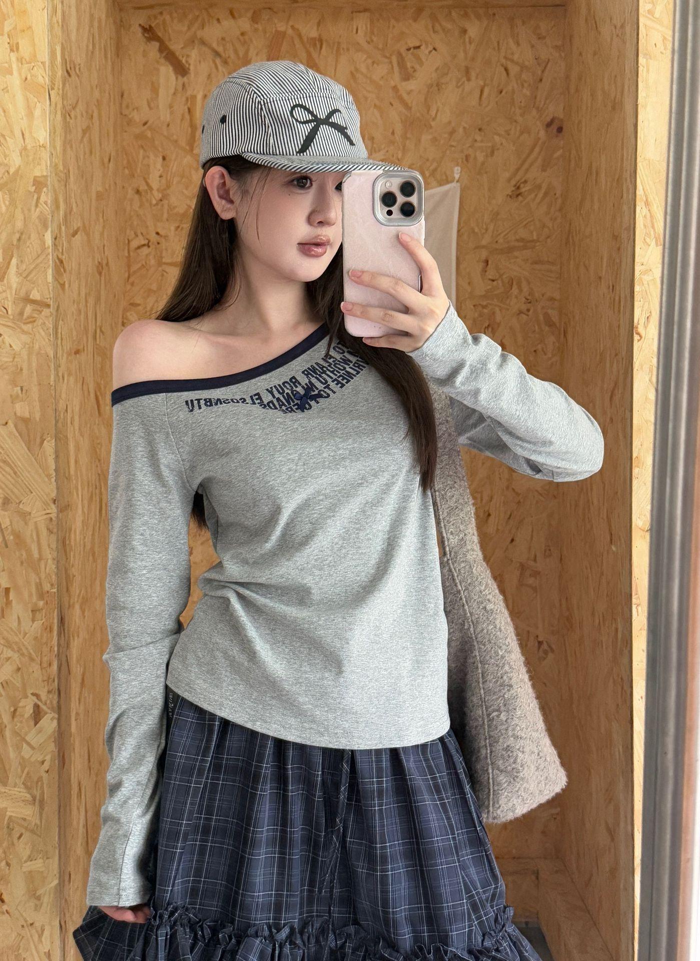 ME KAKAMEE Trece Líneas Otoño Dulce Cool Graffiti Letra Bloque de Color Un Hombro Elástico Versión Pequeña Camiseta de Manga Larga Han 8856