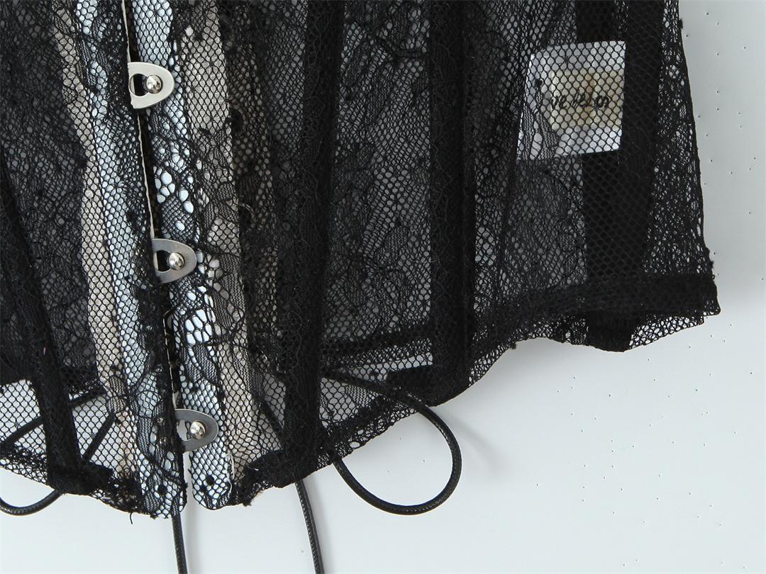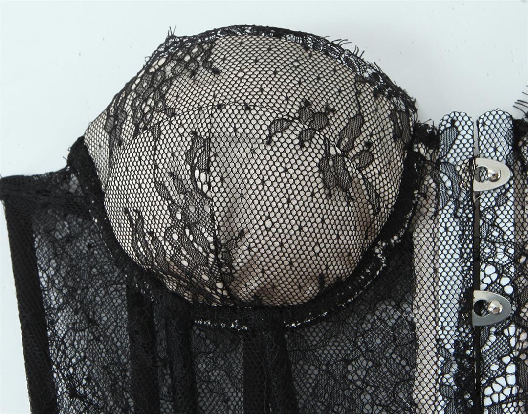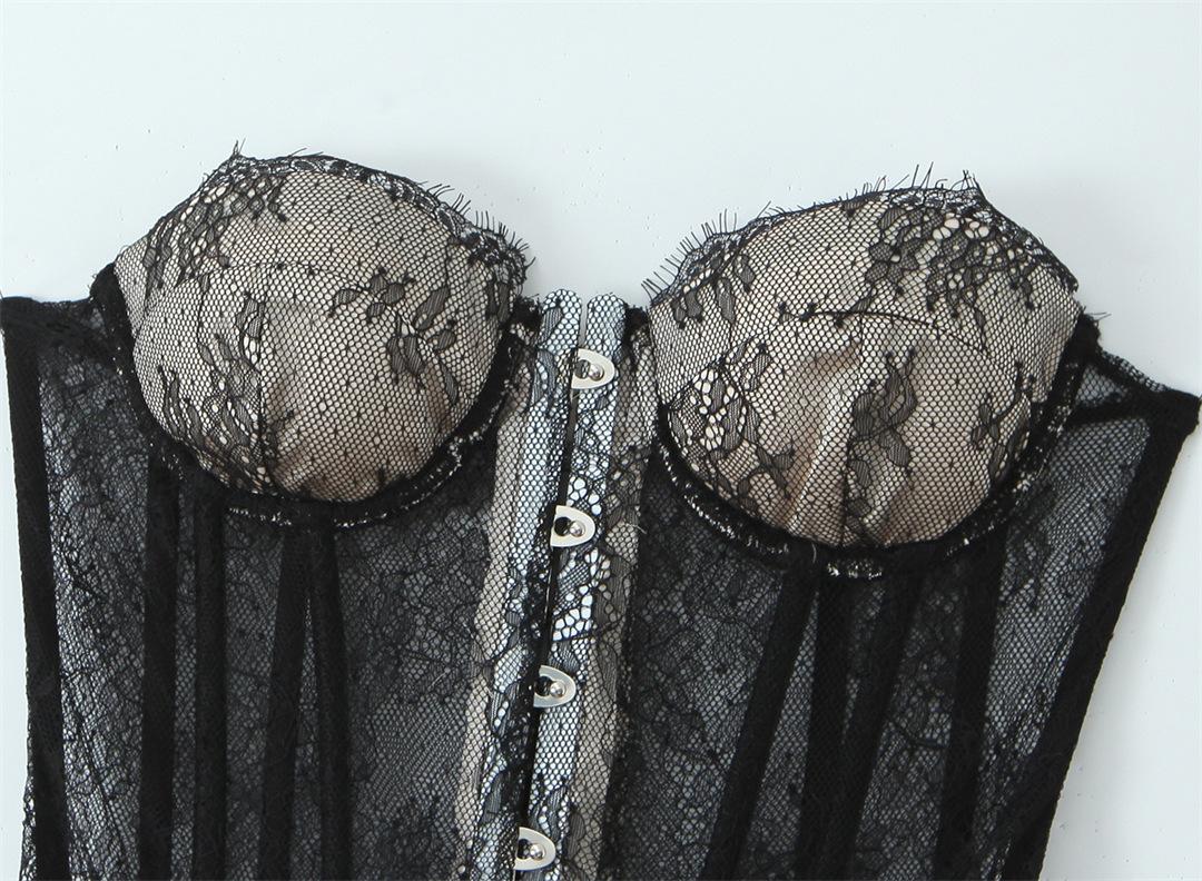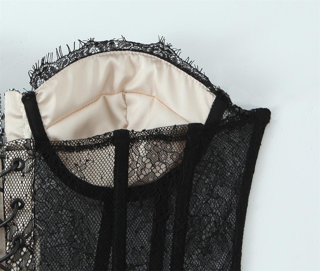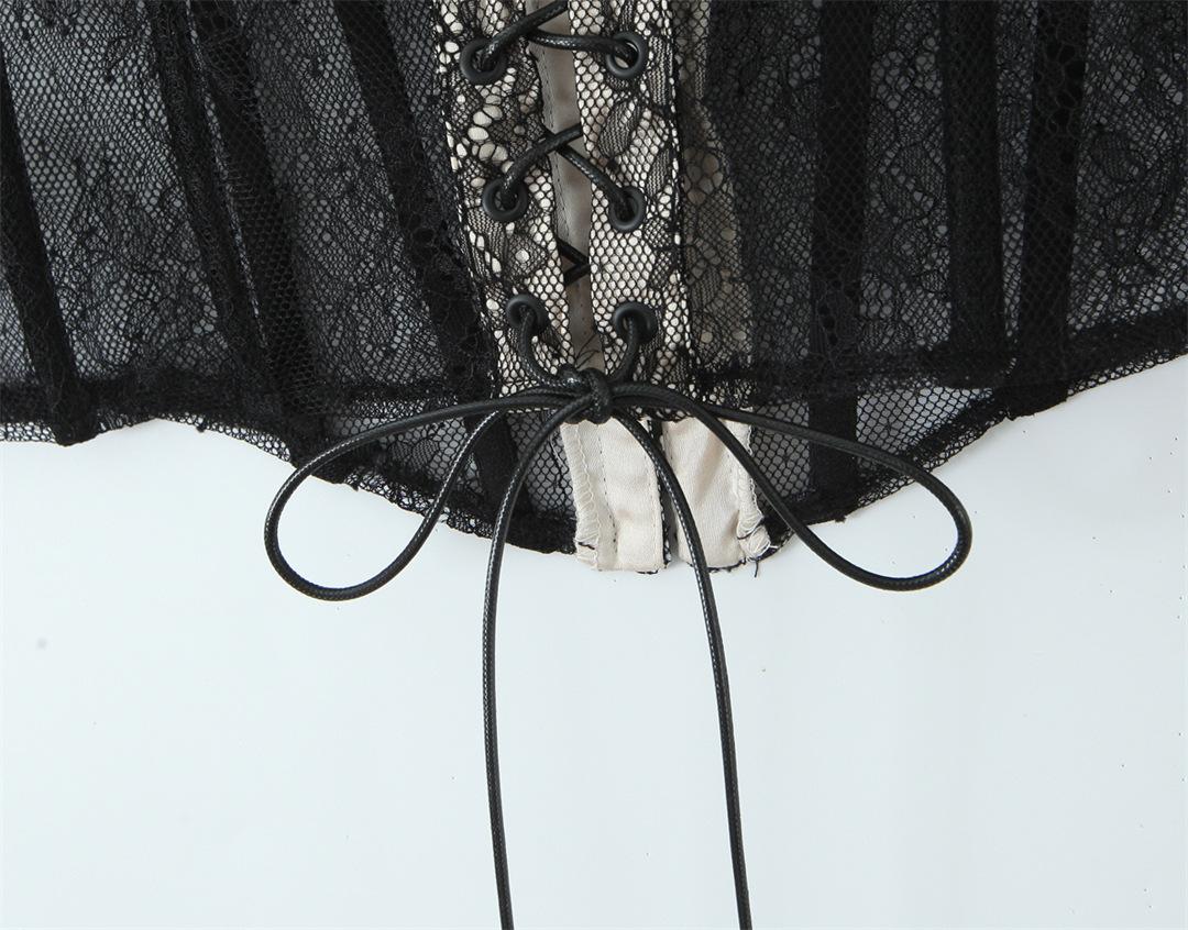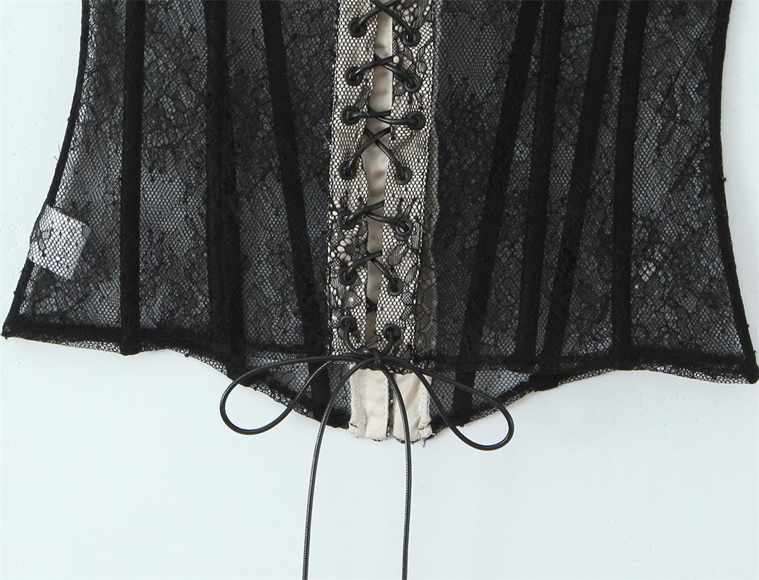 Blusa sexy de encaje estilo blogger europeo y americano, ajustada, ceñidor de cintura con lazo cruzado, sin tirantes, chaleco sexy transparente para mujer