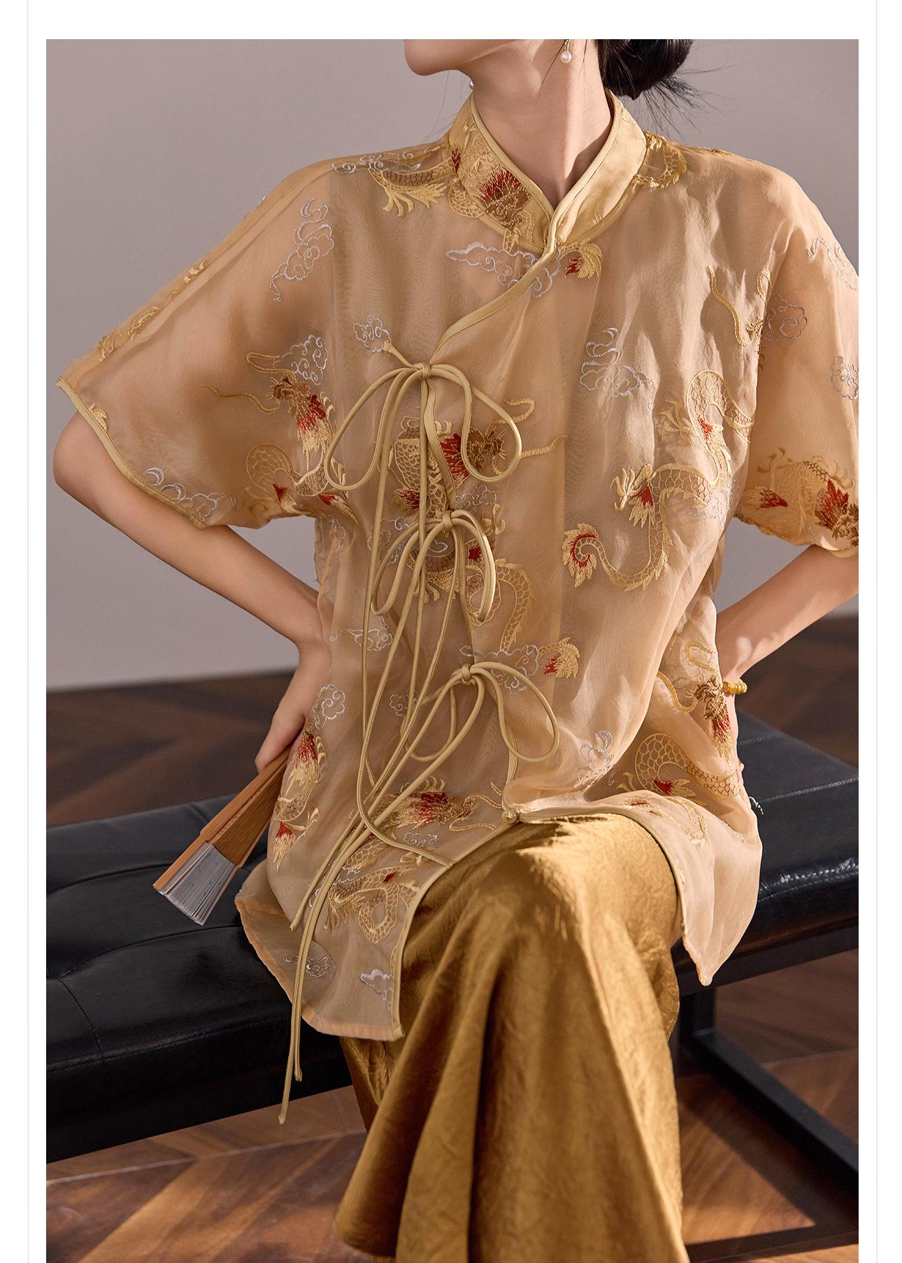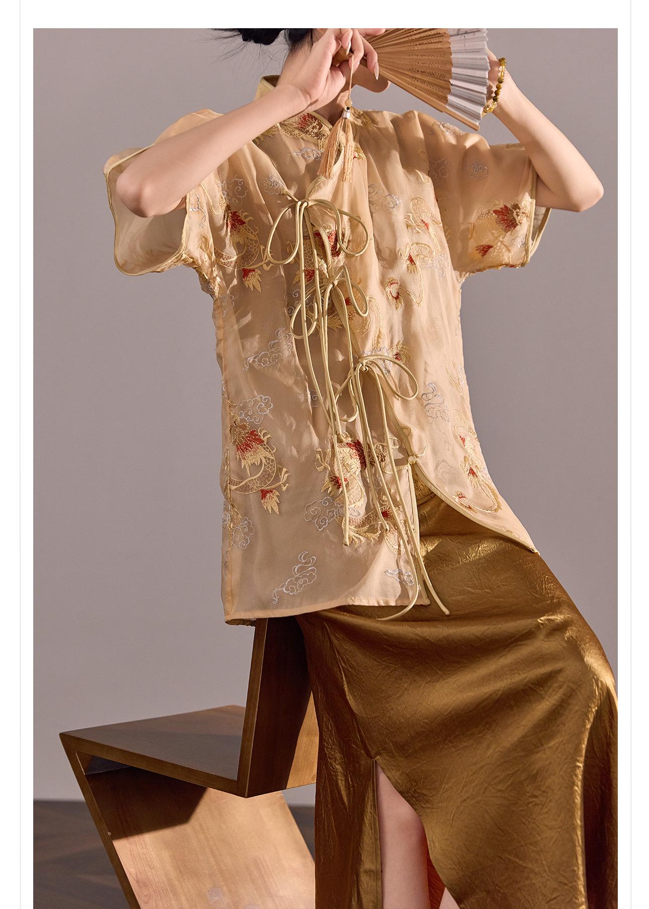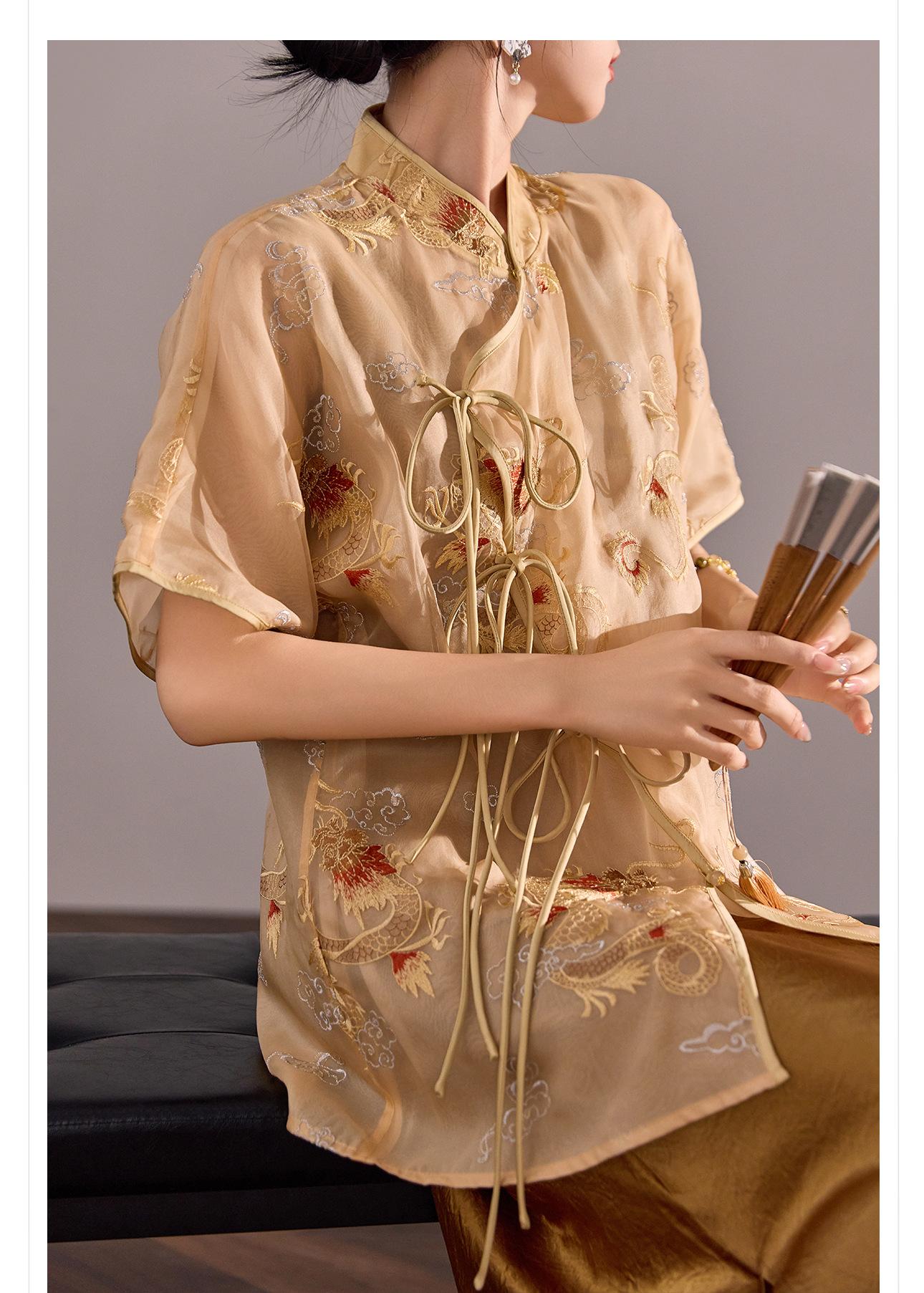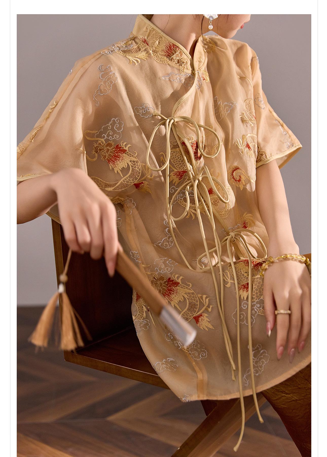 Camisa Bordada Estilo Chino con Diseño Nacional, Solapa Diagonal, Anudado, Top de Manga Corta de Seda de Morera de Alta Calidad Modelo Zx M5100