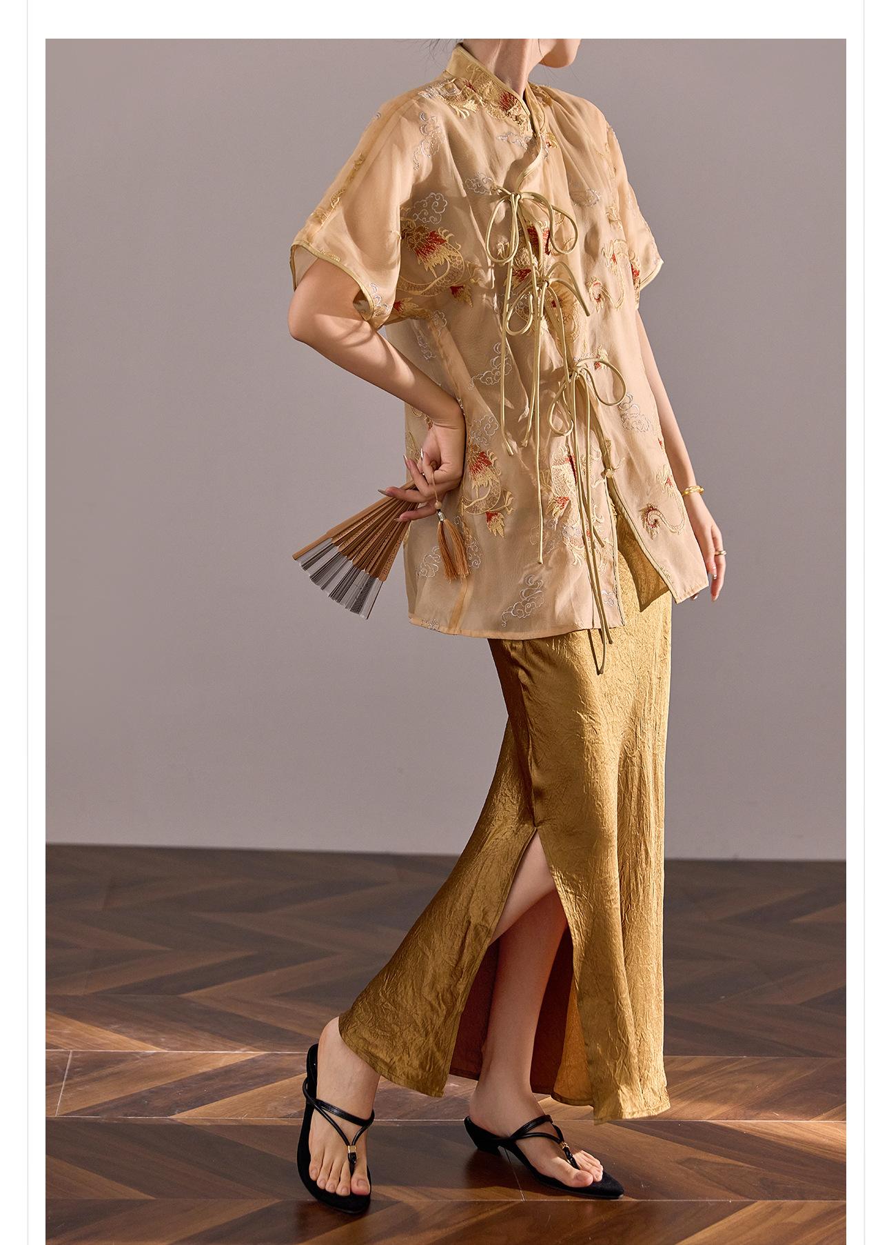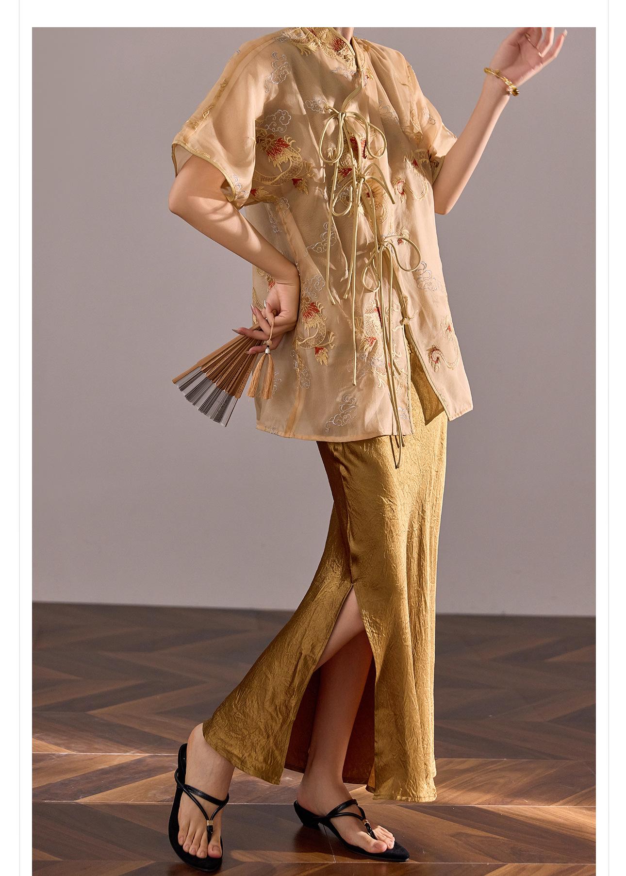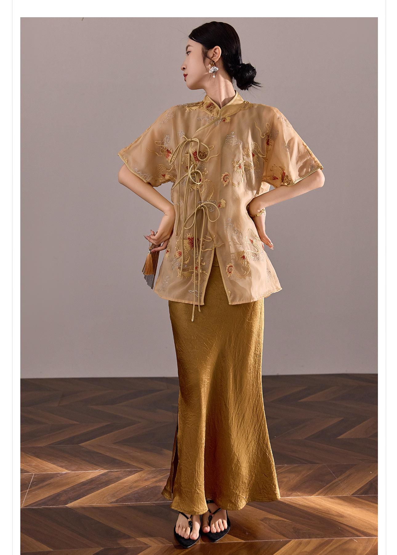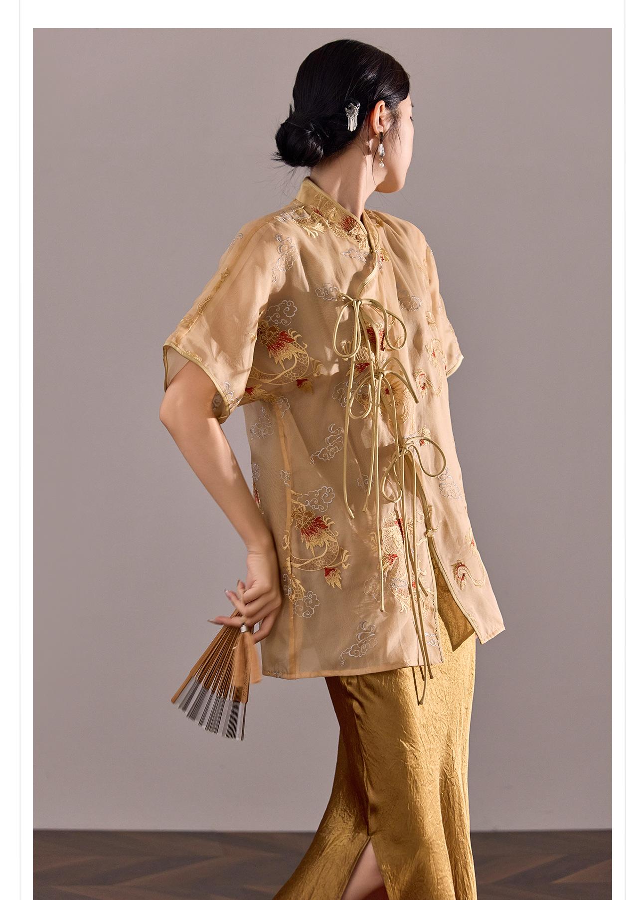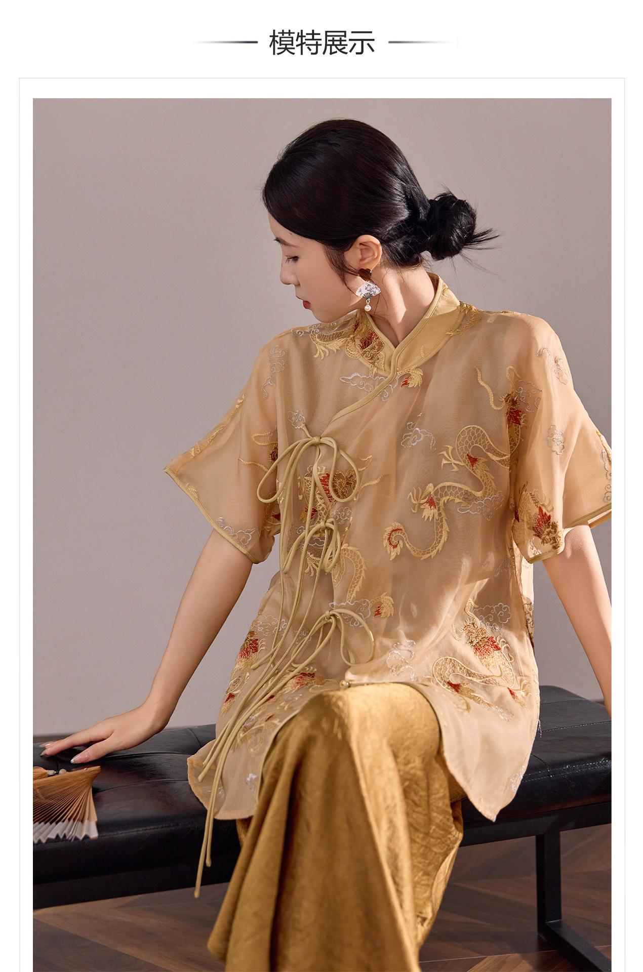Camisa Bordada Estilo Chino con Diseño Nacional, Solapa Diagonal, Anudado, Top de Manga Corta de Seda de Morera de Alta Calidad Modelo Zx M5100
