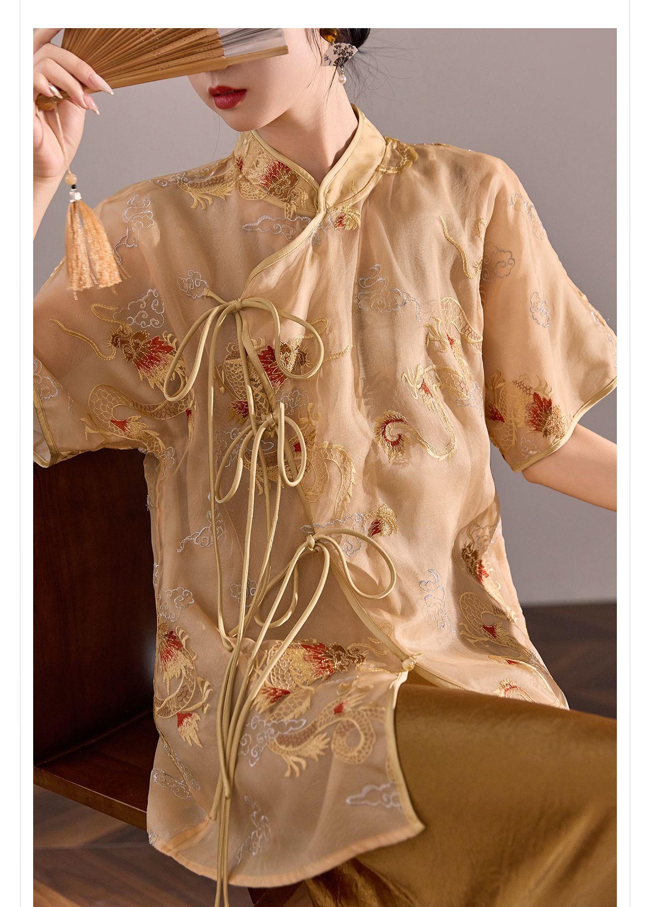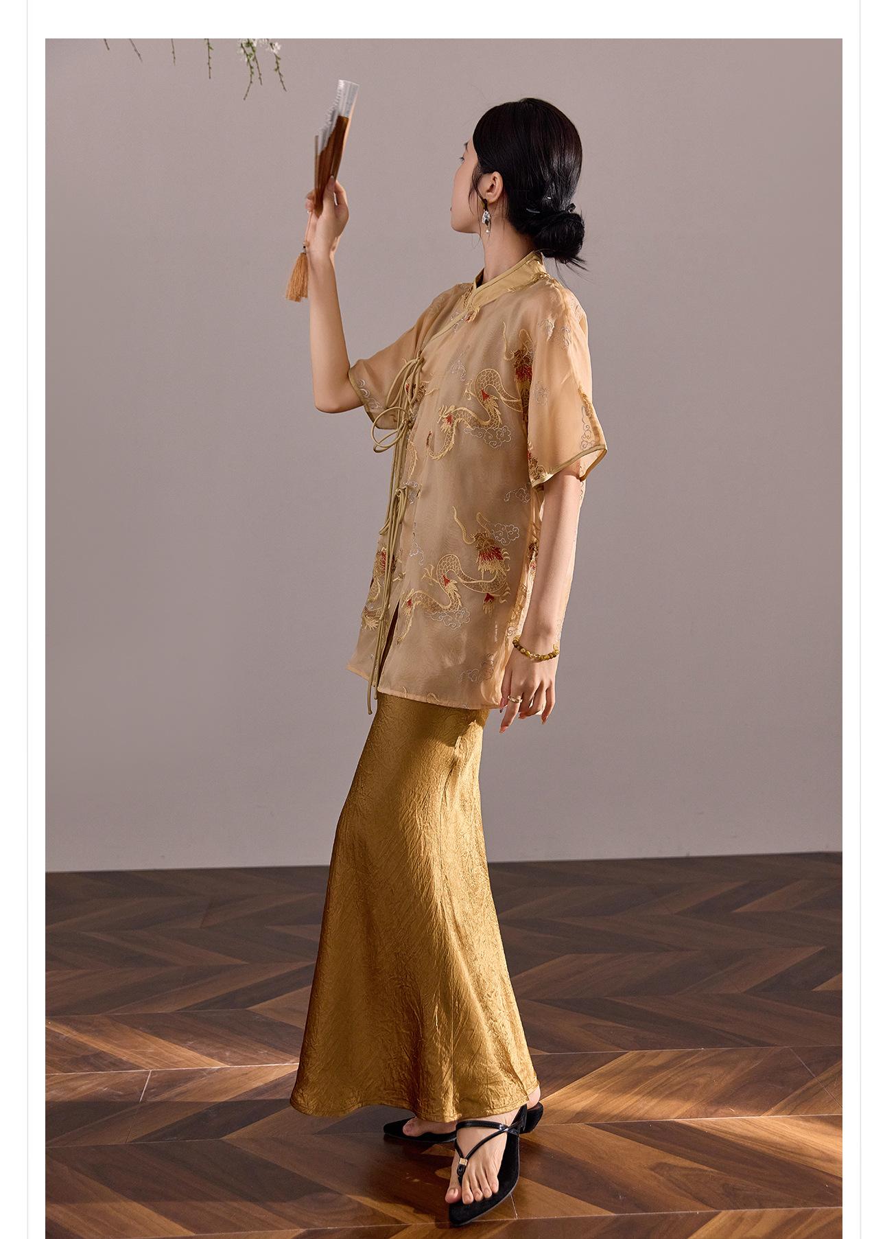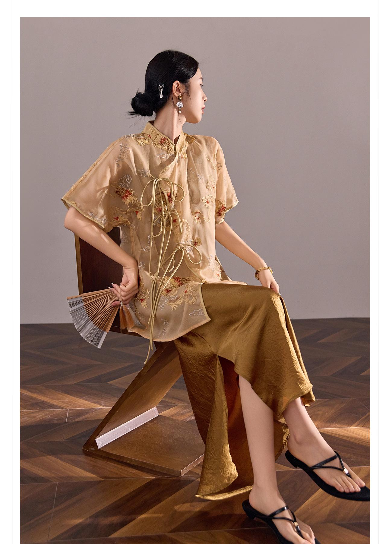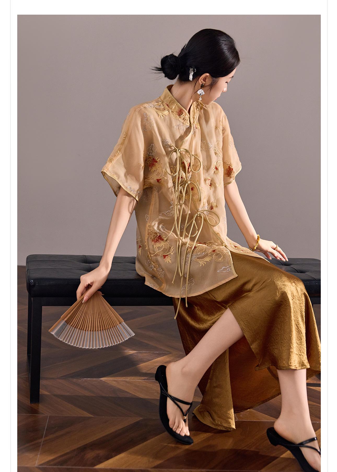 Camisa Bordada Estilo Chino con Diseño Nacional, Solapa Diagonal, Anudado, Top de Manga Corta de Seda de Morera de Alta Calidad Modelo Zx M5100