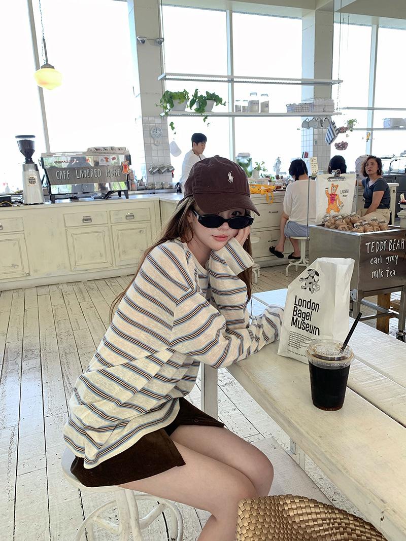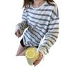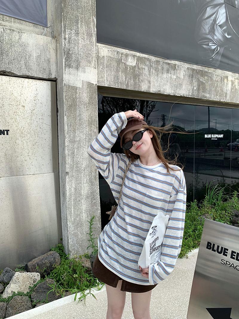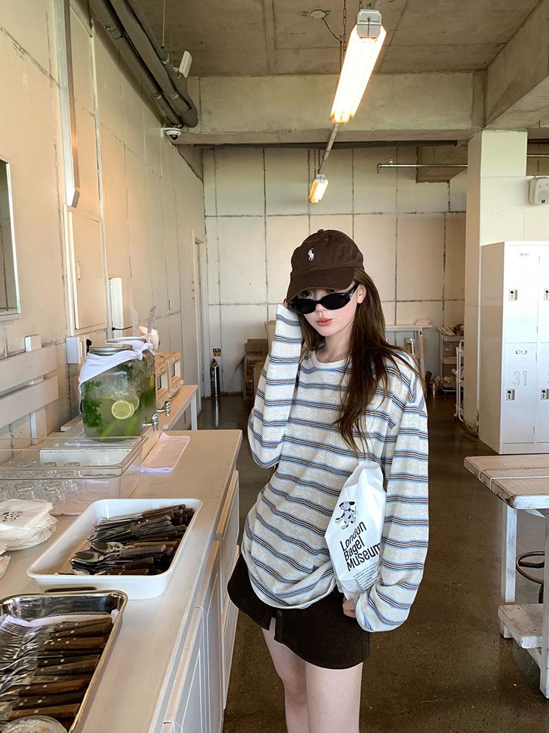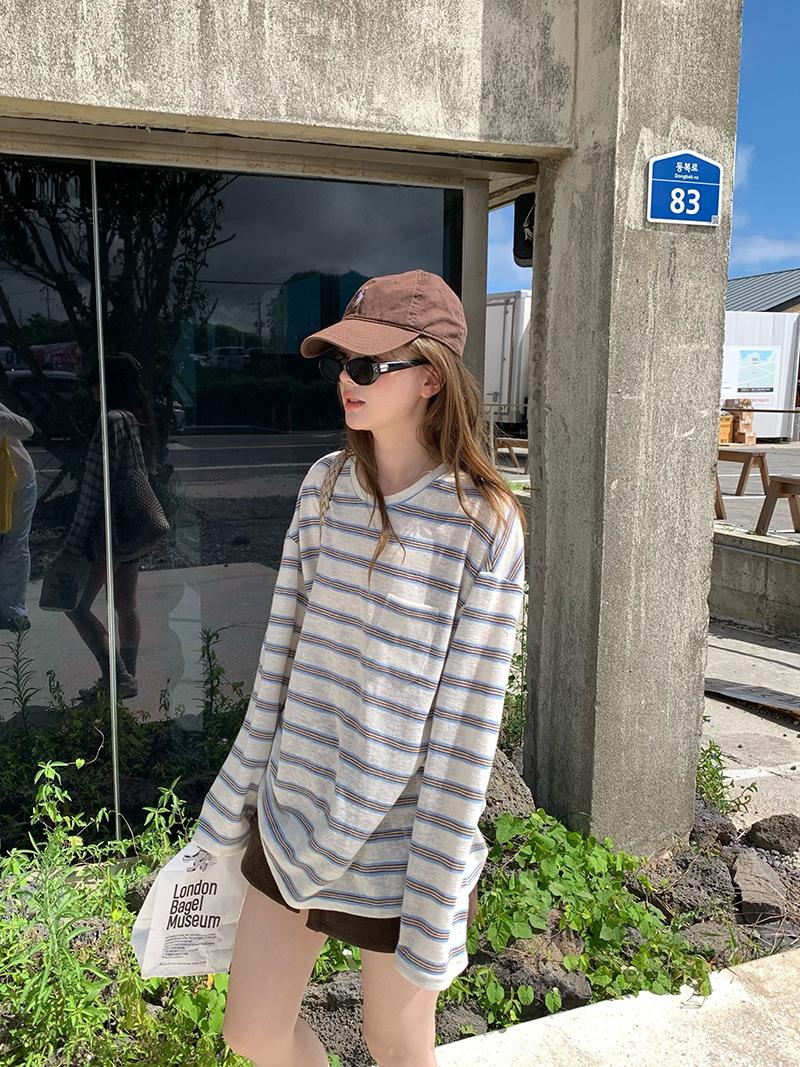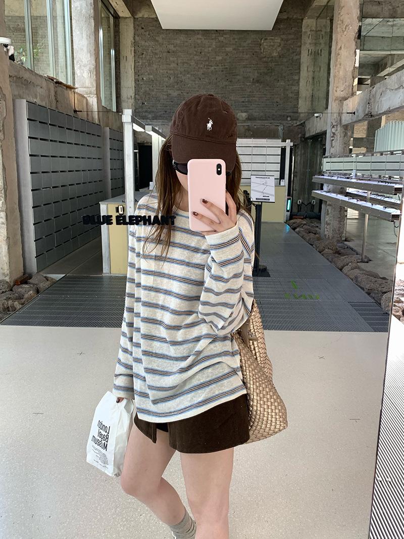 Camiseta de Manga Larga con Cuello Redondo a Rayas Estilo Coreano Mujer Otoño 2025 Nuevo Estilo Lazy Streetwear Casual Versátil Top Holgado