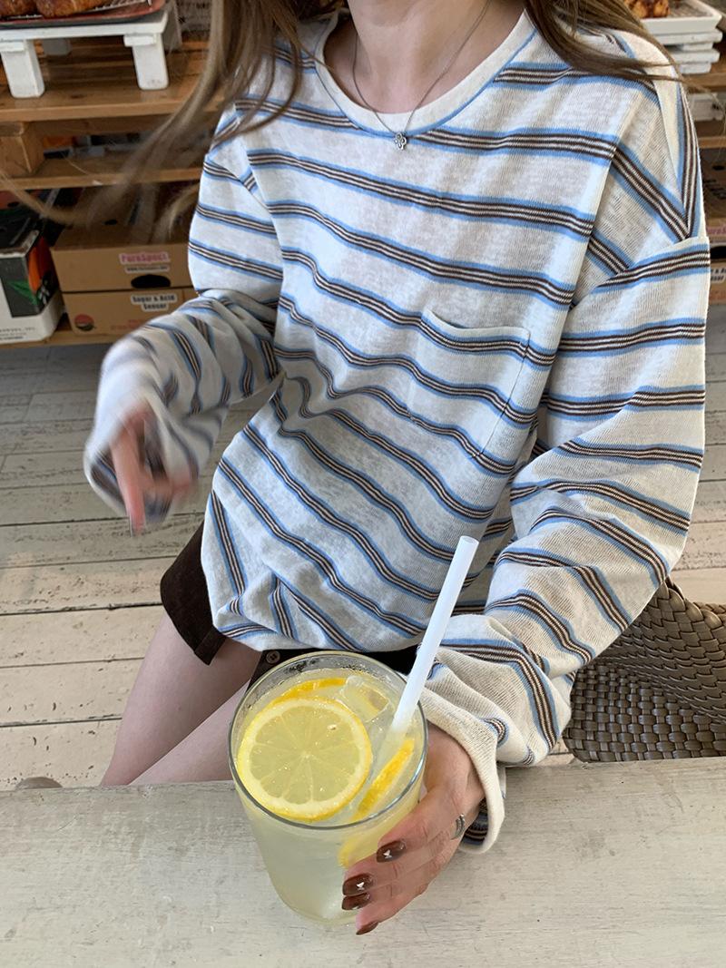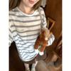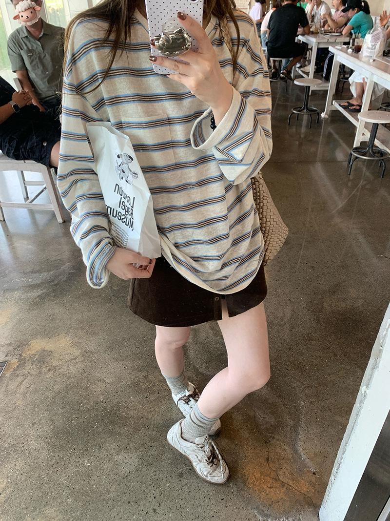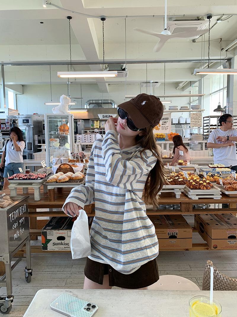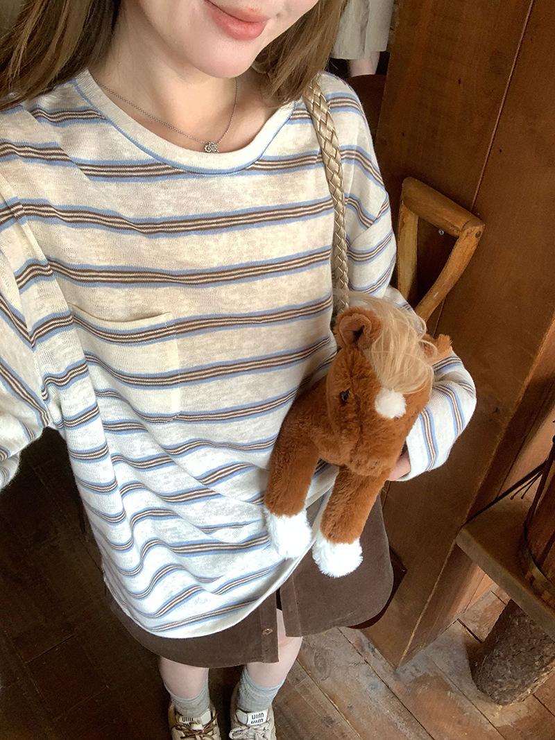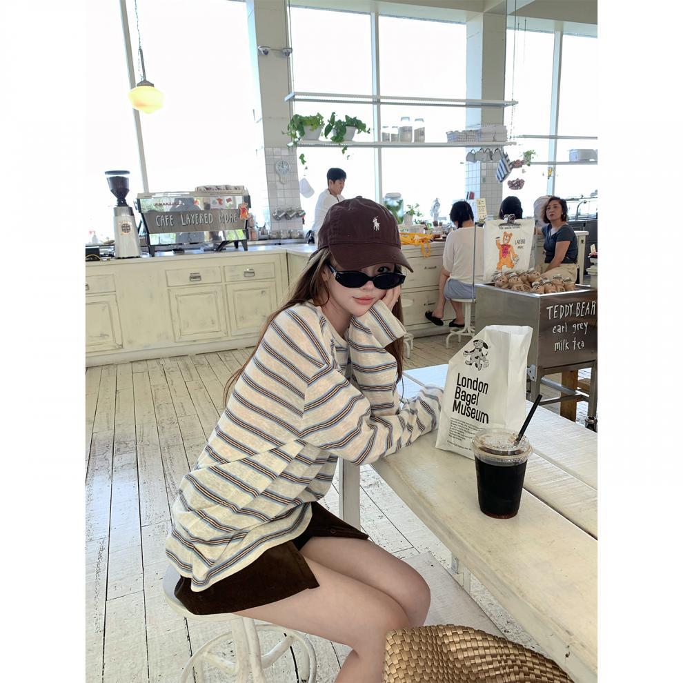 Camiseta de Manga Larga con Cuello Redondo a Rayas Estilo Coreano Mujer Otoño 2025 Nuevo Estilo Lazy Streetwear Casual Versátil Top Holgado