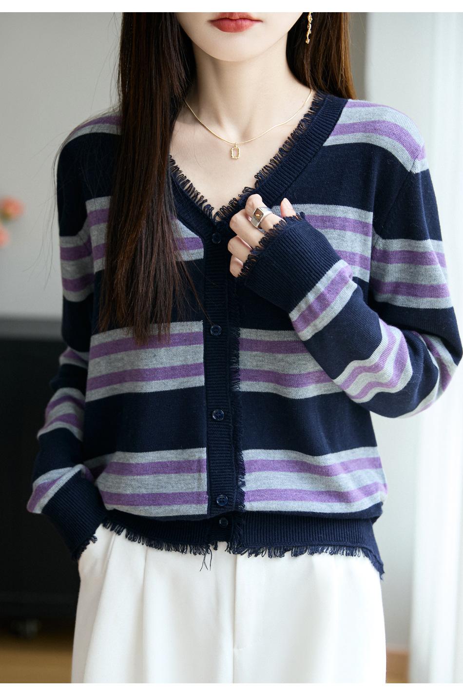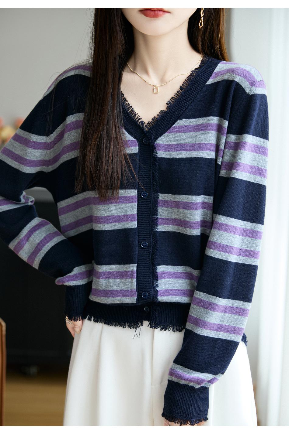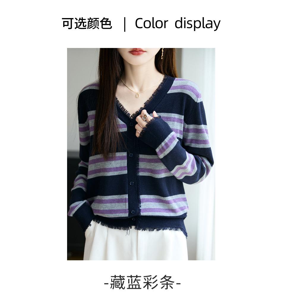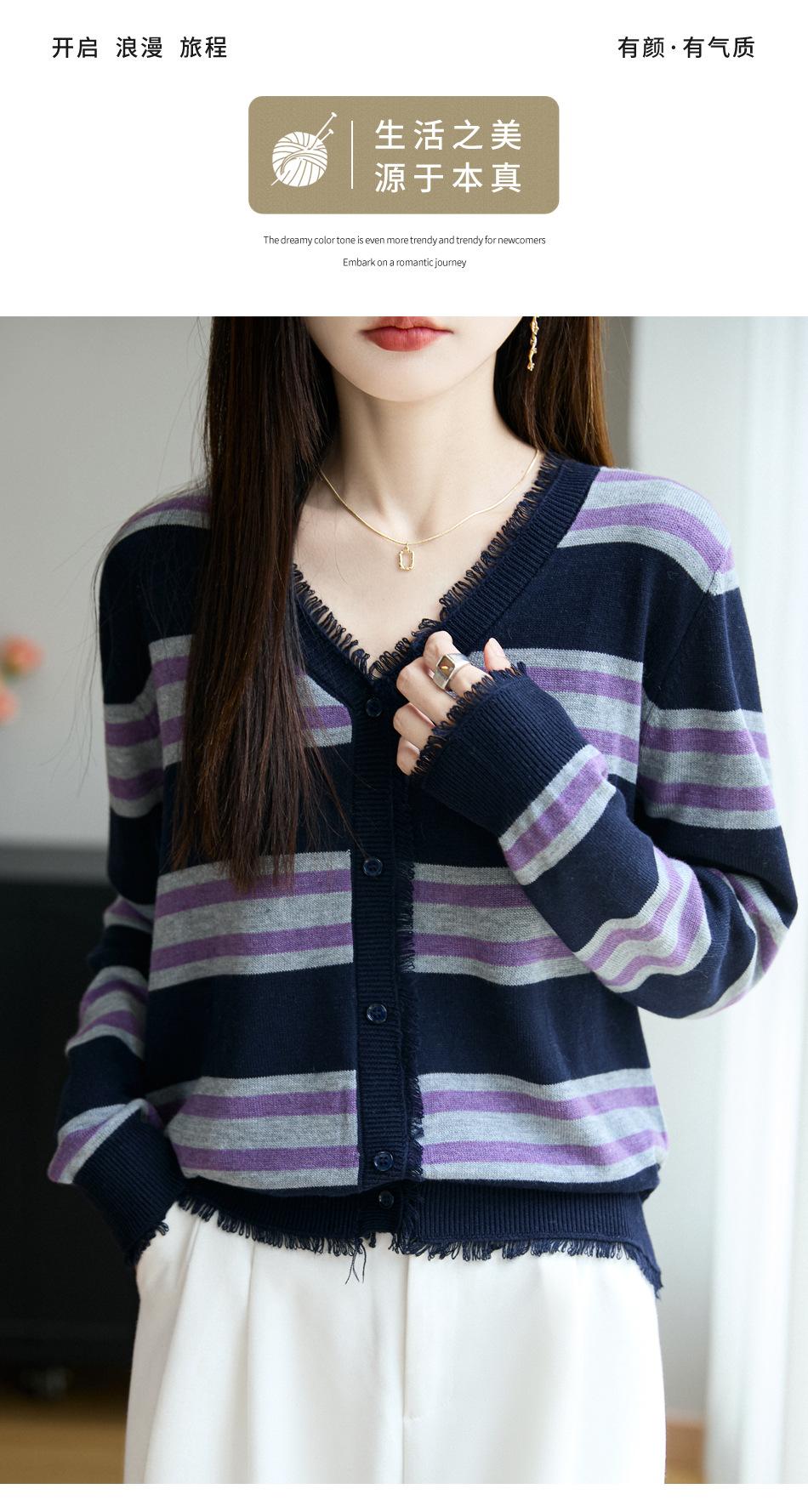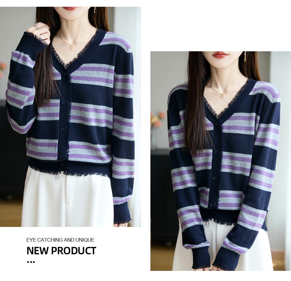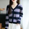 Lana Fina 2025 Otoño/Invierno Nuevo Diseño Suelto de Cuello en V para Mujer Top de Punto Cárdigan con Bloque de Color a Rayas