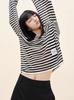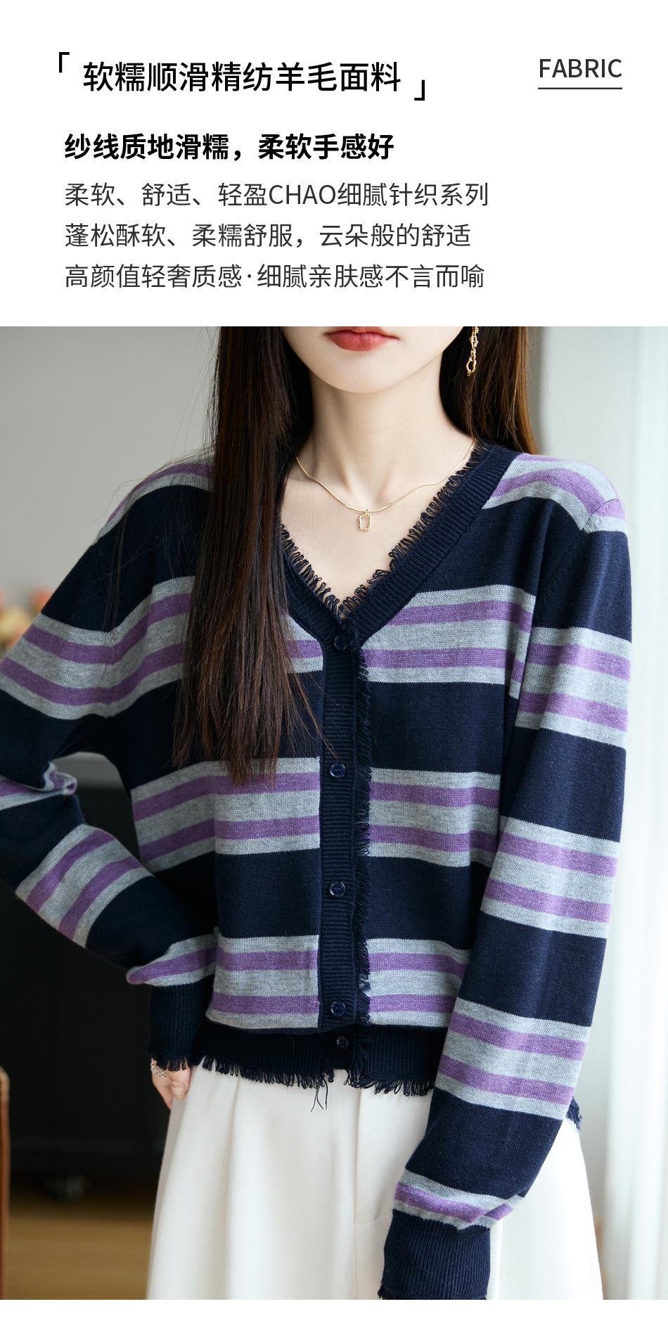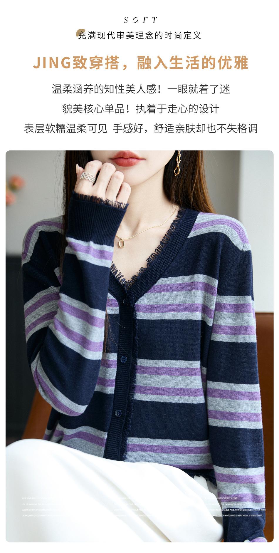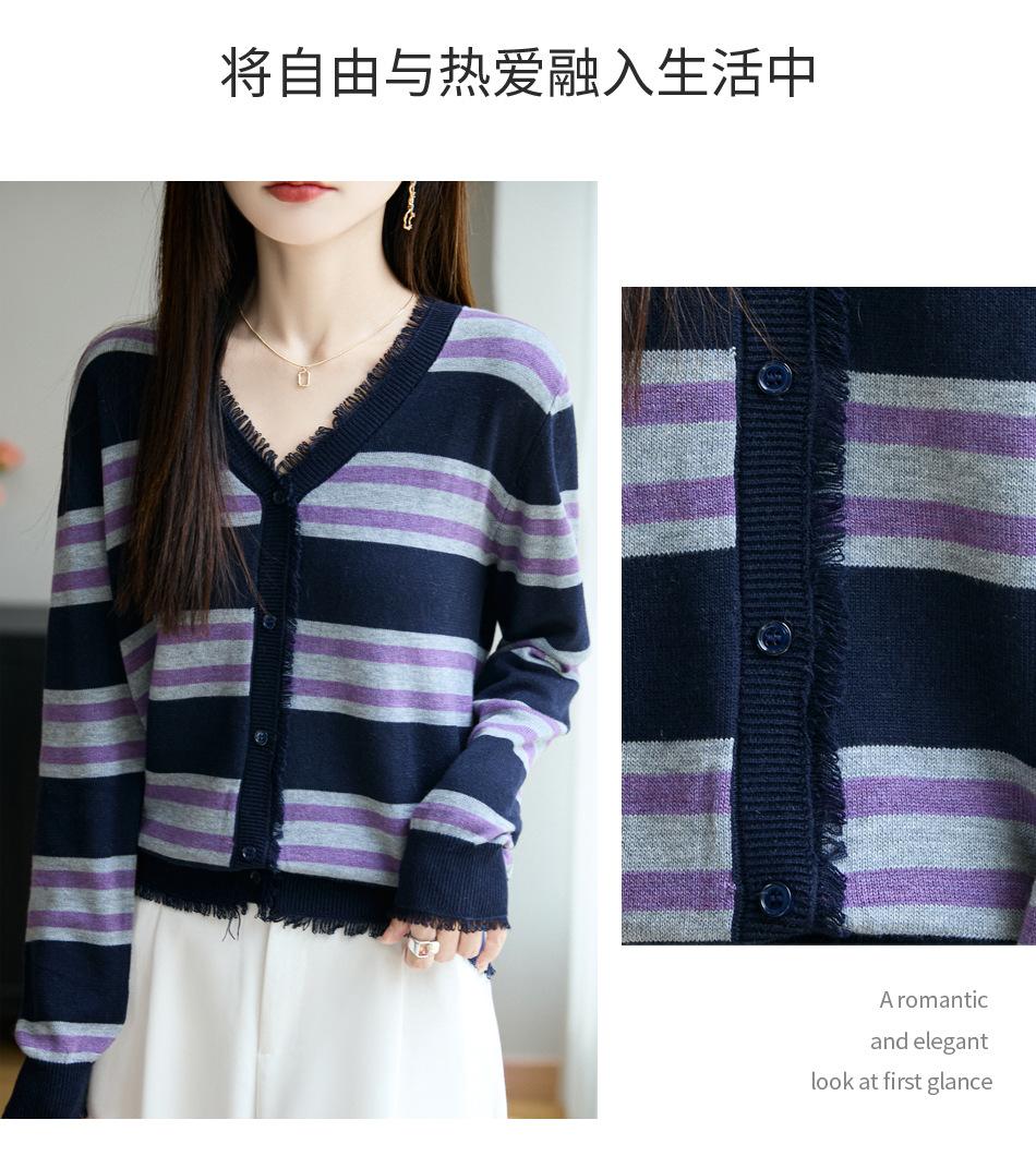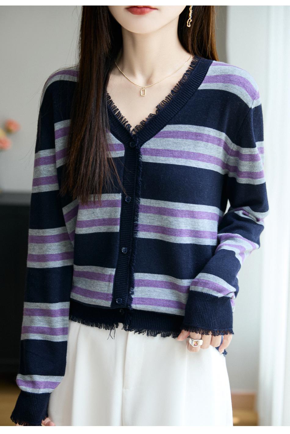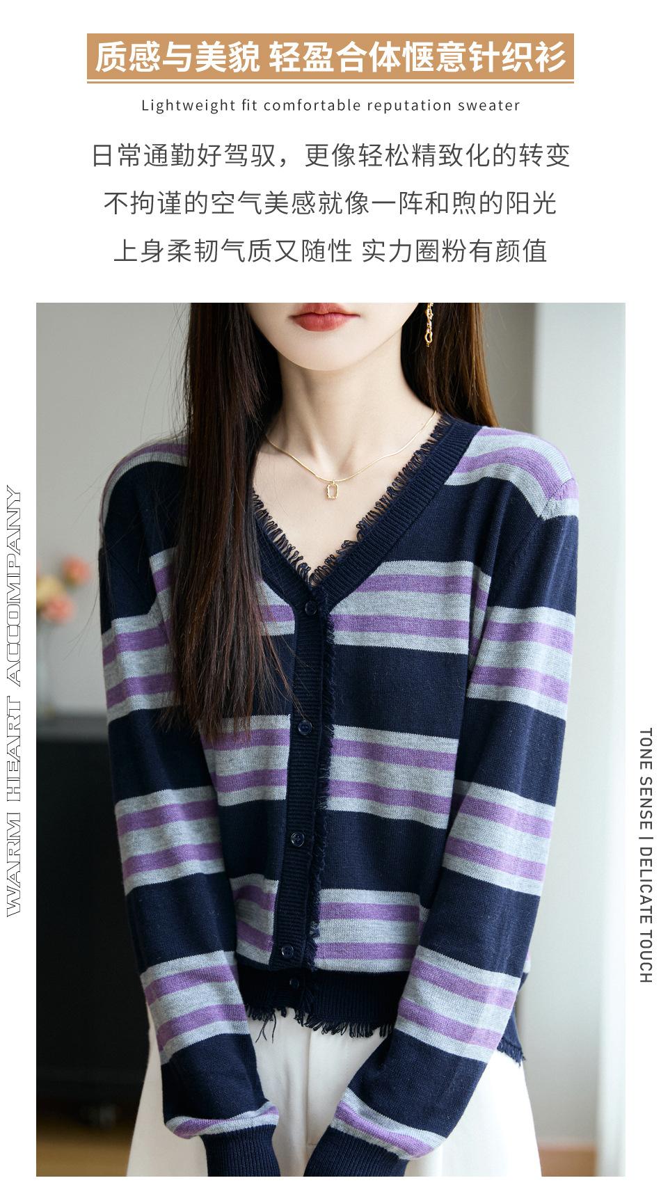 Lana Fina 2025 Otoño/Invierno Nuevo Diseño Suelto de Cuello en V para Mujer Top de Punto Cárdigan con Bloque de Color a Rayas