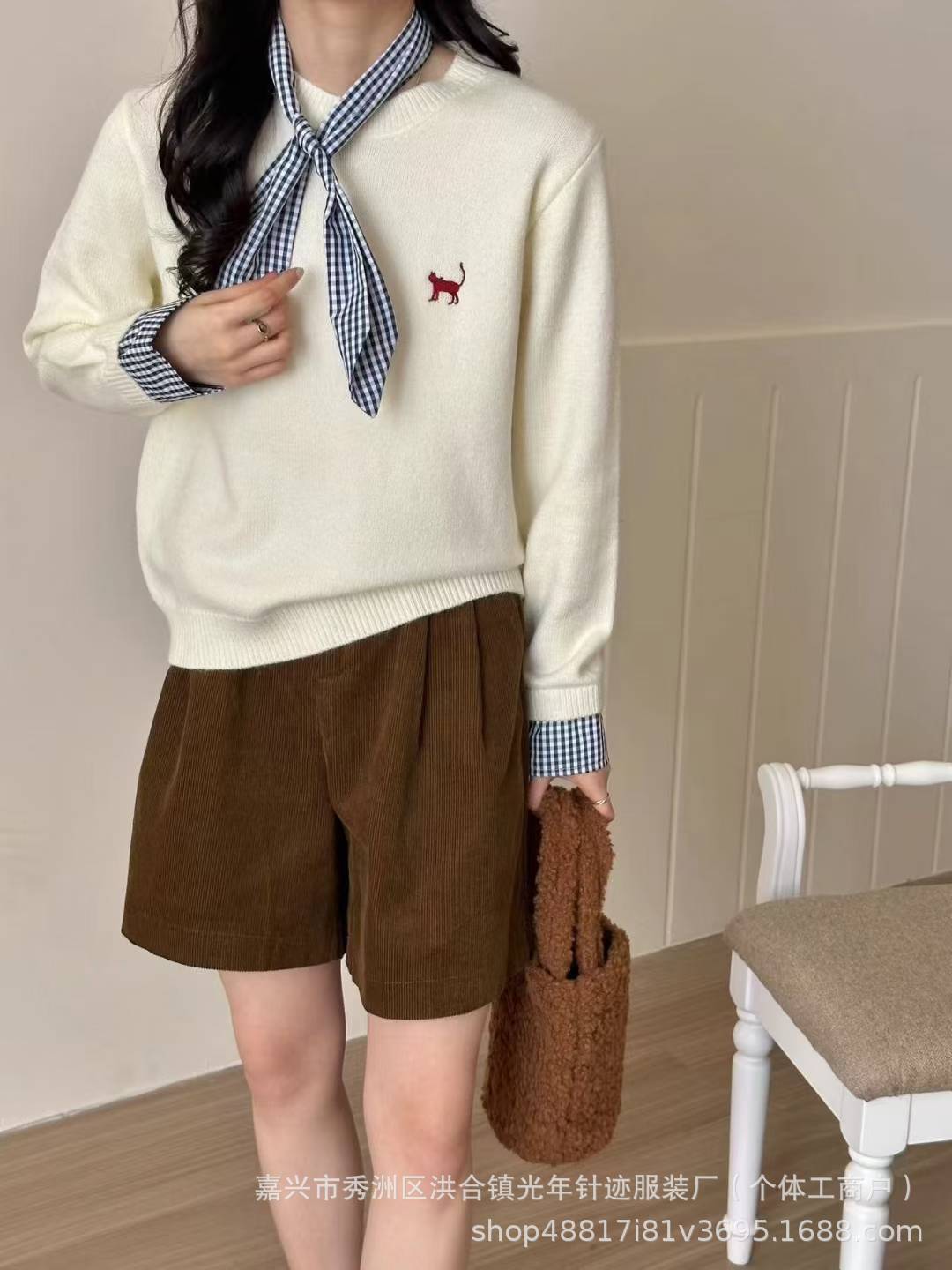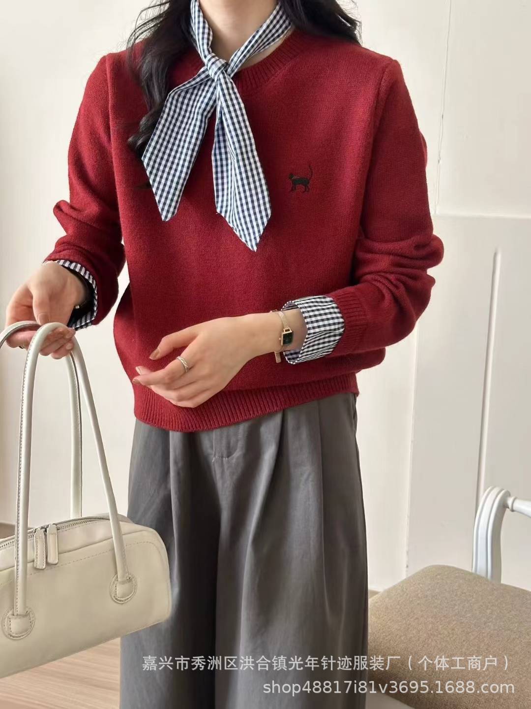 Suéter de Manga Patchwork a Cuadros Bordado Nicho de Moda para Mujer 2025 Otoño e Invierno Nuevo Top de Punto Versátil para Mujer