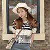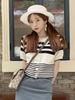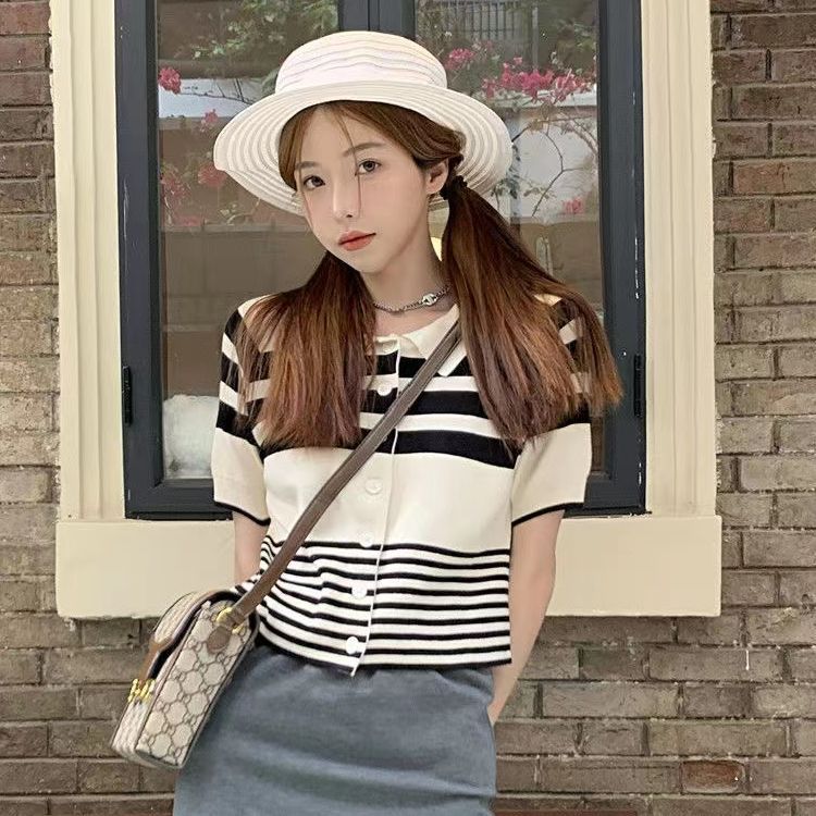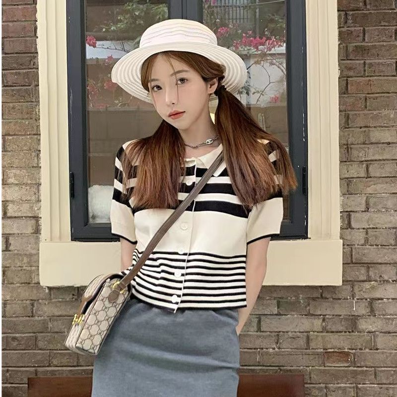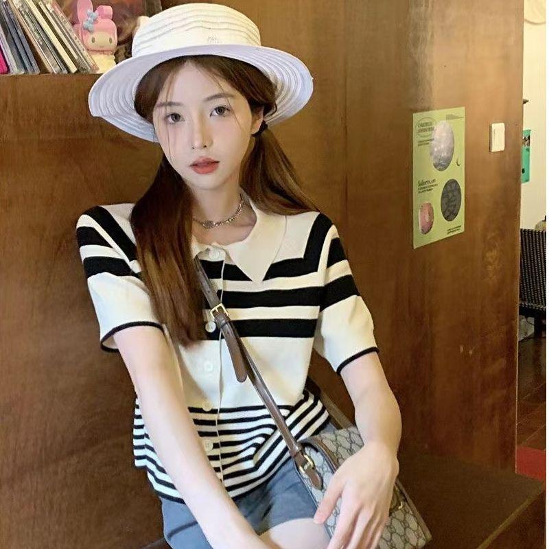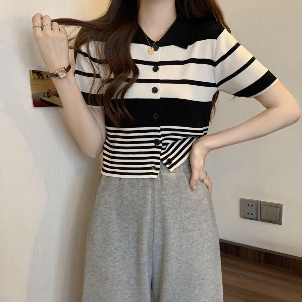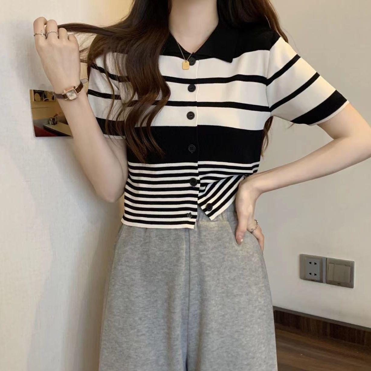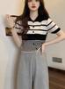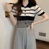 Sexy Camiseta de Manga Corta con Cuello Polo a Rayas, Diseño con Sentido, Nicho de Moda, Delgada, para Chicas Guapas, Ajustada, Ins Top de Mujer